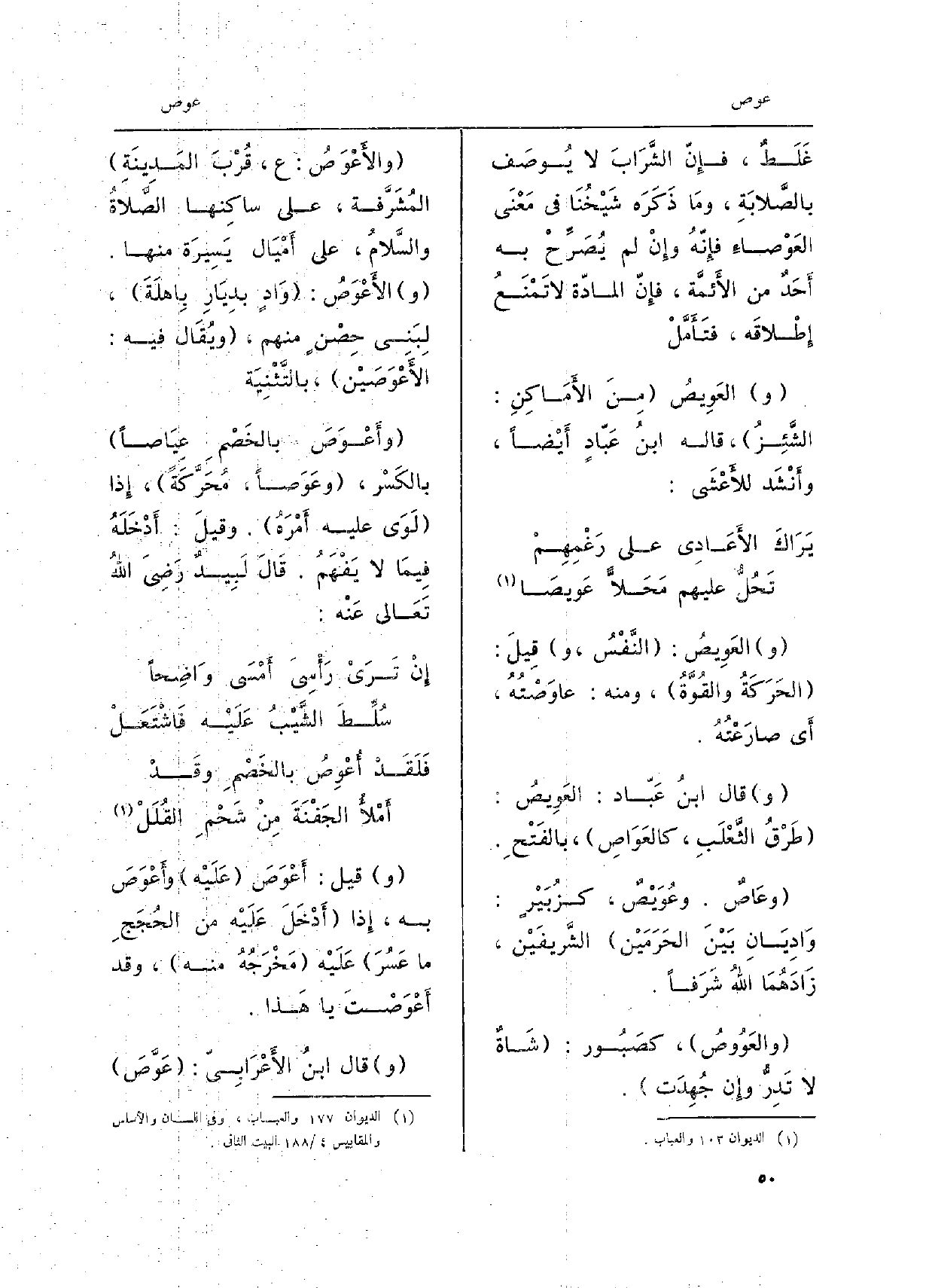 العَوِيصُ: النَّفْسُ، وقِيلَ: الحَرَكَةُ والقُوَّةُ، وَمِنْه:} عاوَصْتُهُ، أَي صارَعْتُهُ. قَالَ ابنُ عَبّاد: العَوِيصُ: طَرْقُ الثَّعْلَبِ، {كالعَوَاص، بالفَتْحِ.} وعَاصٌ. {وعُوَيْصٌ، كزُبَيْرٍ: وَادِيَانِ بَيْنَ الحَرَمَيْن الشَّرِيفَيْن، زَادَهُمَا اللهُ شَرَفاً.} والعَوُوصُ، كصَبُور: شَاةٌ لَا تَدرُّ وإِن جُهِدَت. {والأَعْوَصُ: ع، قُرْبَ المَدِينَةِ المُشَرَّفة، على ساكِنها الصَّلاةُ والسَّلامُ، على أَمْيَال يَسِيرَة مِنْهَا. و} الأَعْوَصُ: وَادٍ بدِيَارِ باهلَةَ، لِبَنِي حِصْنٍ مِنْهُم، ويُقَال فِيهِ: {الأَعْوَصَيْن، بالتَّثْنِيَة} وأَعْوَصَ بالخَصْمِ {عِيَاصاً بالكَسْر،} وعَوَصاً، مُحَرَّكَةً، إِذا لَوَى عَلَيْهِ أَمْرَهُ. وقيلَ: أَدْخَلَهُ فِيمَا لَا يَفْهَمُ. قَالَ لَبِيدٌ رَضِيَ اللهُ تَعَالى عَنْه: