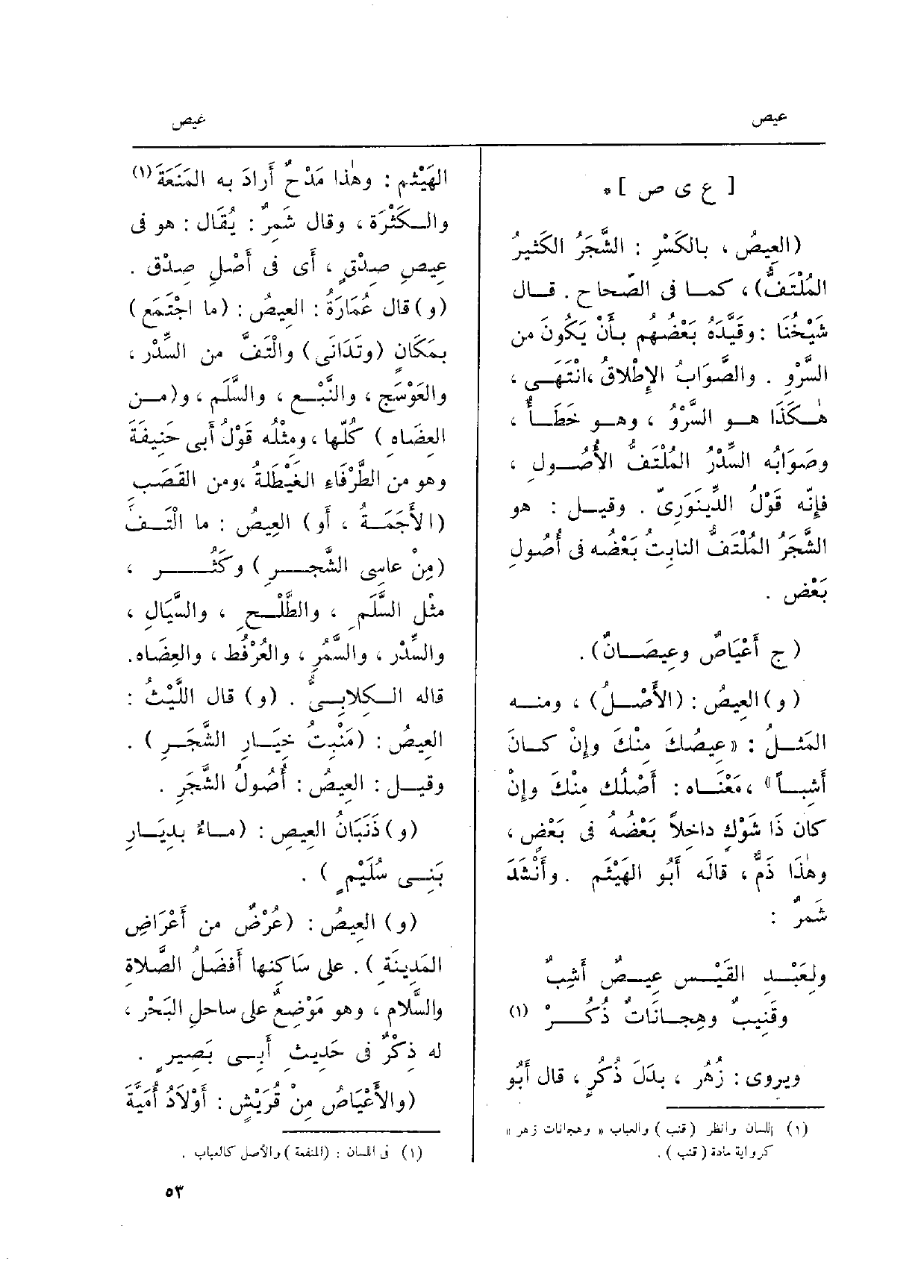 ويروى: زُهُر، بَدَلَ ذُكُرٍ، قَالَ أَبُو الهيْثم: وَهَذَا مَدْحٌ أَرادَ بِهِ المَنَعَةَ والكَثْرَة، وَقَالَ شَمِرٌ: يُقَال: هُوَ فِي عِيصٍ صدْقٍ، أَي فِي أَصْلِ صِدْق. قَالَ عُمَارَةُ: العِيصُ: مَا اجْتَمَع بمَكَانٍ وتَدَانَى والْتَفَّ من السِّدْر، والعَوْسَج، والنَّبْع، والسَّلَم، وَمن العِضَاهِ كُلّها، ومِثْلُه قَوْلُ أَبي حَنِيفَةَ وَهُوَ من الطَّرْفَاءِ الغَيْطَلةُ، وَمن القَصَبِ الأَجَمَةُ، أَو العِيصُ: مَا الْتَفَّ مِنْ عاسِي الشَّجرِ وكَثُر، مثْل السَّلَمِ، والطَّلْحِ، والسَّيَالِ، والسِّدْر، والسَّمُرِ، والعُرْفُط، والعِضَاه. قَالَه الكِلابِيُّ. قَالَ اللَّيْثُ: العِيصُ: مَنْبِتُ خِيَارِ الشَّجَرِ. وَقيل: العِيص: ماءٌ بدِيَارِ بَنِي سُلَيْمٍ. و {العِيصُ: عُرْضٌ من أَعْرَاضٍ المَدِينَةِ. على سَاكِنها أَفضَلُ الصَّلاة والسَّلام، وَهُوَ مَوْضِعٌ على ساحِل البَحْر، لَهُ ذِكْرٌ فِي حَدِيثِ أَبِي بَصِيرٍ.} والأَعْيَاصُ مِنْ قُرَيْشٍ: أَوْلاَدُ أُمَيَّةَ