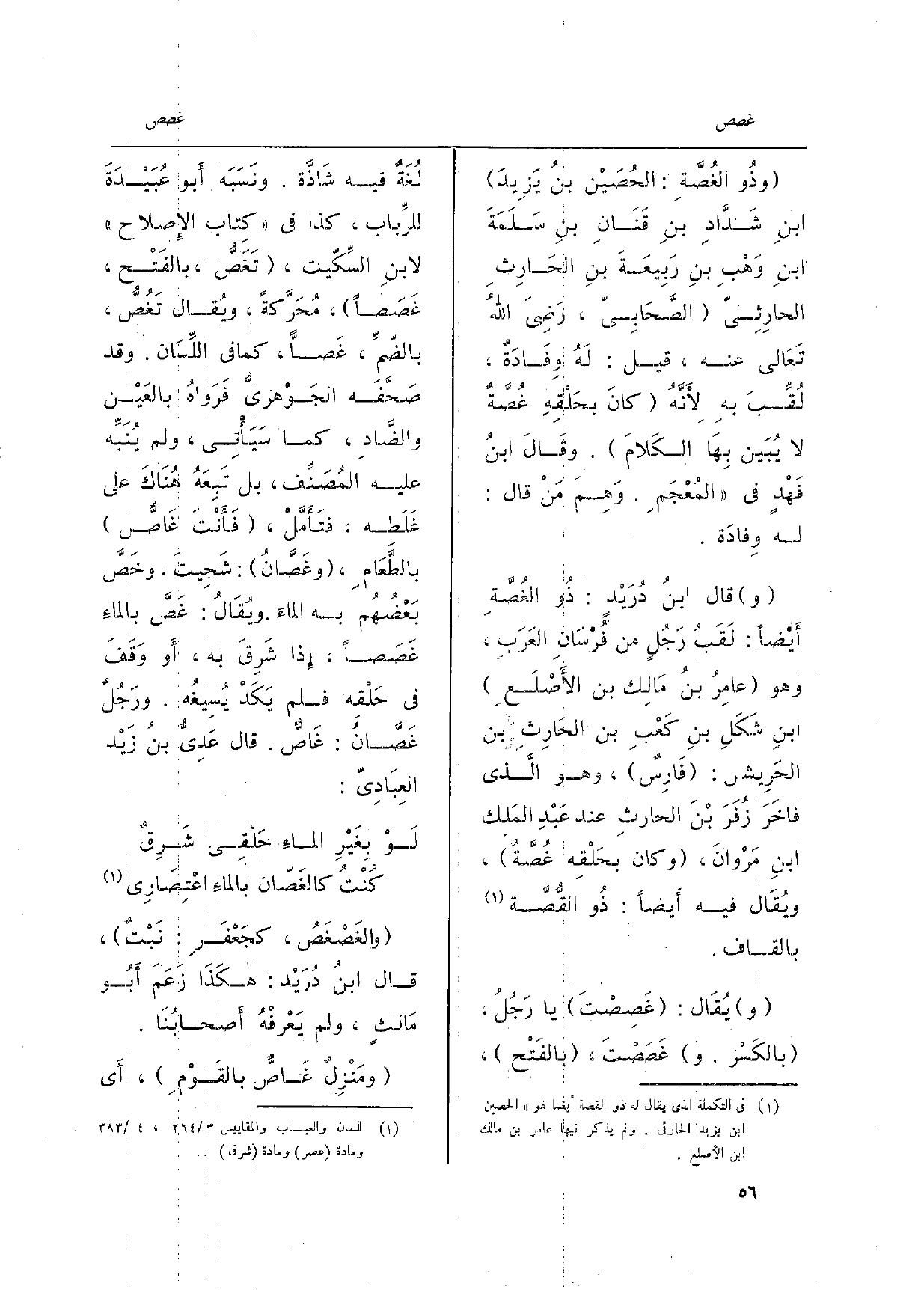 وذُو {الغُصَّةِ: الحُصَيْن بنُ يَزِيدَ ابنِ شَدَّادِ بنِ قَنَانِ بنِ سَلَمَةَ ابنِ وَهْبِ بنِ رَبِيعَةَ بنِ الحَارِثِ الحارِثيّ الصَّحَابِيّ، رَضِيَ اللهُ تَعَالى عَنهُ، قيل: لَهُ وِفَادَةٌ، لُقِّبَ بهِ لأَنَّهُ كانَ بحَلْقِهِ} غُصَّةٌ لَا يُبَين بِهَا الكَلاَم. وقَالَ ابنُ فَهْدٍ فِي المُعْجَمِ. وَهِمَ مَنْ قَالَ: لَهُ وِفادَة. قَالَ ابنُ دُرَيْدٍ: ذُو الغُصَّةِ أَيْضاً: لَقَبُ رَجُلٍ من فُرْسَانِ العَرَبِ، وَهُوَ عامِرُ بنُ مَالِك بن الأَصْلَعِ ابنِ شَكَلِ بنِ كَعْبِ بن الحَارِثِ بن الحَرِيش: فَارِسٌ، وَهُوَ الَّذي فاخَرَ زُفَرَ بْنَ الحارثِ عِنْد عَبْدِ المَلْك ابنِ مَرْوانَ، وكا بحَلْقِه غُصَّةٌ، ويُقَال فِيهِ أَيضاً: ذُو القُّصَّة بِالْقَافِ. ويُقَال: {غَصِصْتَ يَا رَجُلُ، بالكَسرْ. وغَصَصْتَ، بالفَتْح، لُغَةٌ فِيهِ شَاذَّة. ونسَبَه أَبو عُبَيْدَةَ للرَّباب، كَذَا فِي كتاب الإِصلاح لابنِ السِّكّيت،} تَغَصُّ، بالفَتْح، {غصصاً محركة وَيُقَال} تغص بالضّمِّ، {غَصّاً، كَمَا فِي اللِّسَان. وَقد صَحَّفَه الجَوْهَريُّ فَرَواهُ بالعَيْن والضَّادِ، كَمَا سَيَأْتِي، وَلم يُنَبِّه عَلَيْهِ المُصَنِّف، بل تَبِعَهُ هُنَاكَ على غَلَطِه، فتَأَمَّلْ، فَأَنْتَ} غَاصٌّ بالطَّعَامِ، {وغَصَّانُ: شَجِيتَ، وخَصَّ بَعْضُهُم بِهِ الماءُ. ويُقَالُ:} غَصَّ بالماءِ {غَصَصاً، إِذا شَرِقَ بِهِ، أَو وَقَفَ فِي حَلْقِه فَلم يَكَدْ يُسِيغُه. ورَجُلٌ} غَصَّانُ: {غَاصٌّ.