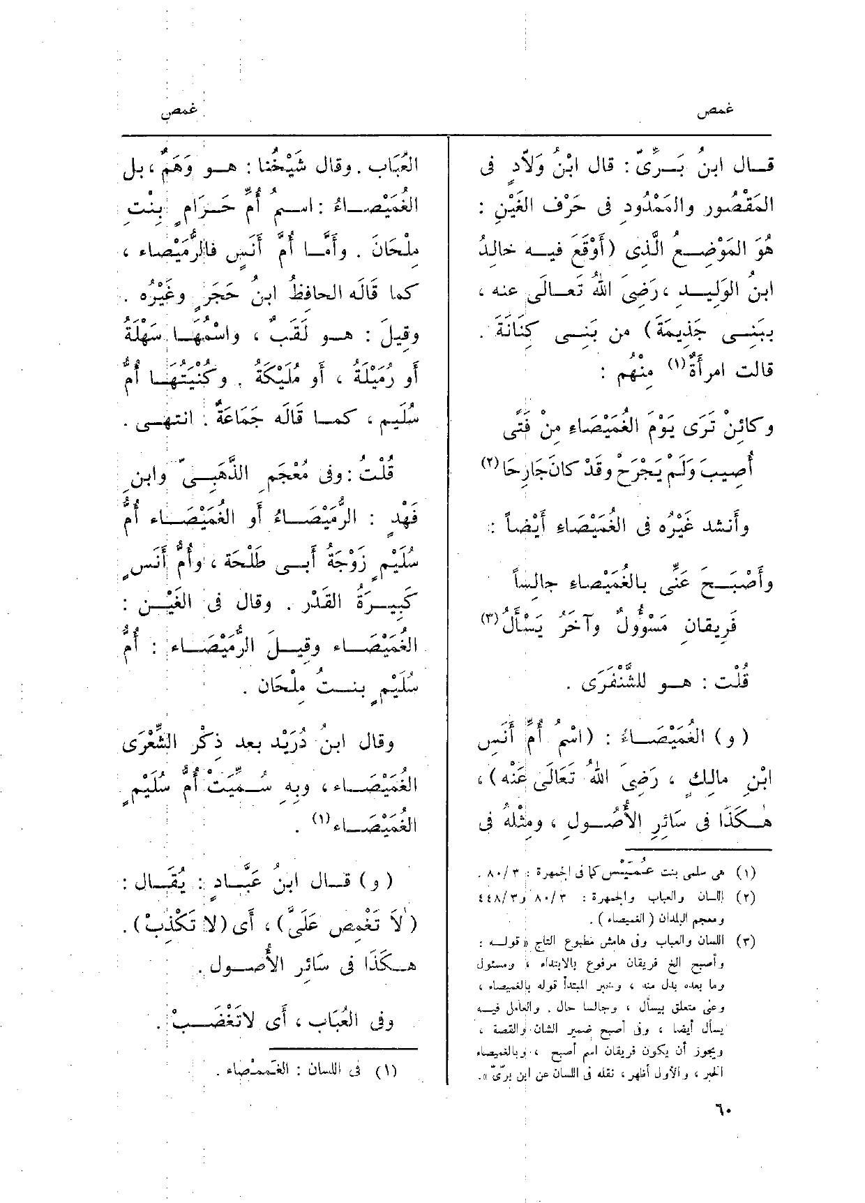 قُلْت: هُوَ للشَّنْفَرَى. الغُمَيْصَاءُ: اسْمُ أُمِّ أَنَسِ ابْنِ مالِكٍ، رَضِيَ اللهُ تَعَالَى عَنْه، هكَذَا فِي سَائِرِ الأُصُولِ، ومِثْلهُ فِي العُبَاب. وَقَالَ شَيْخُنا: هُوَ وَهَمٌ، بل الغُمَيْصاءُ: اسمُ أُمِّ حَرَامٍ بِنْتِ مِلْحَانَ.