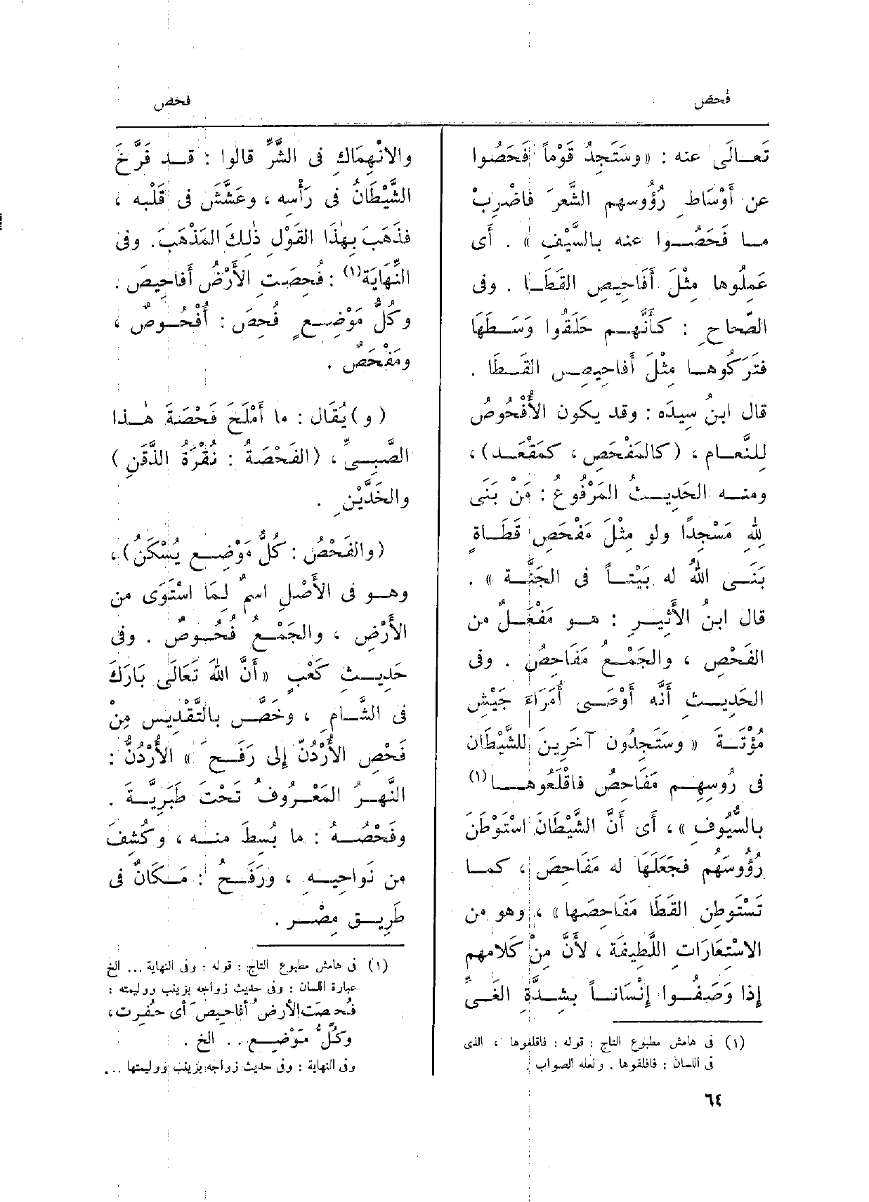بالسَّيْفِ. أَي عَمِلُوها مثْلَ أَفَاحِيصِ القَطَا. وَفِي الصّحاحِ: كأَنَّهم حَلَقُوا وَسَطَهَا فتَرَكُوها مِثْلَ أَفاحِيص القَطَا. قَالَ ابنُ سِيدَه: وَقد يكون الأُفْحُوصُ لِلنَّعام، كالمَفْحَصِ، كمَقْعَد، وَمِنْه الحَدِيثُ المَرْفُوعُ: مَنْ بَنَى لِلهِ مَسْجِداً وَلَو مِثْلَ مَفْحَصِ قَطَاةٍ بَنَى اللهُ لَهُ بَيْتاً فِي الجَنَّة. قَالَ ابنُ الأَثِيرِ: هُوَ مَفْعَلٌ من الفَحْص، والجَمْعُ مَفَاحصُ. وَفِي الحَدِيث أَنَّه أَوْصَى أُمَرَاءَ جَيْشِ مُؤْتَةَ وسَتَجِدُون آخَرِينَ للشَّيْطَان فِي رُؤسهم مَفَاحصُ فاقْلَعُوها بالسُّيُوفِ، أَي أَنَّ الشَّيْطَانَ اسْتَوْطَنَ رُؤُؤسَهُم فجَعَلَهَ لَهُ مَفَاحِصَ، كَمَا تَسْتَوطن القَطَا مَفَاحِصَها، وَهُوَ من الاسْتعَارَات اللَّطِيفَة، لأَنَّ مِنْ كَلامهم إِذا وَصَفُوا إِنْسَاناً بعدَّةِ الغَيِّ والانْهِمَاكِ فِي الشَّرِّ قَالُوا: قد فَرَّخَ الشَّيْطَانُ فِي رَأْسِه، وعَشَّشَ فِي قَلْبه، فذَهَبَ بِهذَا القَوْلِ ذلِكَ المَذْهَبَ. وَفِي النِّهَايَة: فُحِصَتِ الأَرْضُ أَفاحِيصَ. وكُلُّ مَوْضِعٍ فُحِصَ: أُفْحُوصٌ، ومَفْحَصٌ. يُقَال: مَا أَمْلَحَ فَحْصَةَ هَذَا الصَّبِيِّ، الفَحْصَةُ: نَقْرَةُ الذَّقَنِ والخَدَّيْنِ. والفَحْصُ: كُلُّ مَوْضِع يُسْكَنُ، وَهُوَ فِي الأَصْلِ اسمٌ لِمَا اسْتَوَى من الأَرْضِ، والجَمْعُ فُحُوصٌ. وَفِي حَدِيثِ كَعْب أَنَّ اللهَ تَعَالَى بَارَكَ فِي الشَّام، وخَصَّ بالتَّقْدِيس مِنْ فَحْص الأُرْدُنّ إِلى رَفَحَ الأُرْدُنُّ: النَّهرُ المَعْرُوفُ تَحْتَ طَبَرِيَّةَ. وفَحْصُهُ: مَا بُسِطَ مِنْهُ، وكُشِفَ من نَواحِيهِ، ورَفَحُ: مَكَانٌ فِي طَرِيق مصْر.