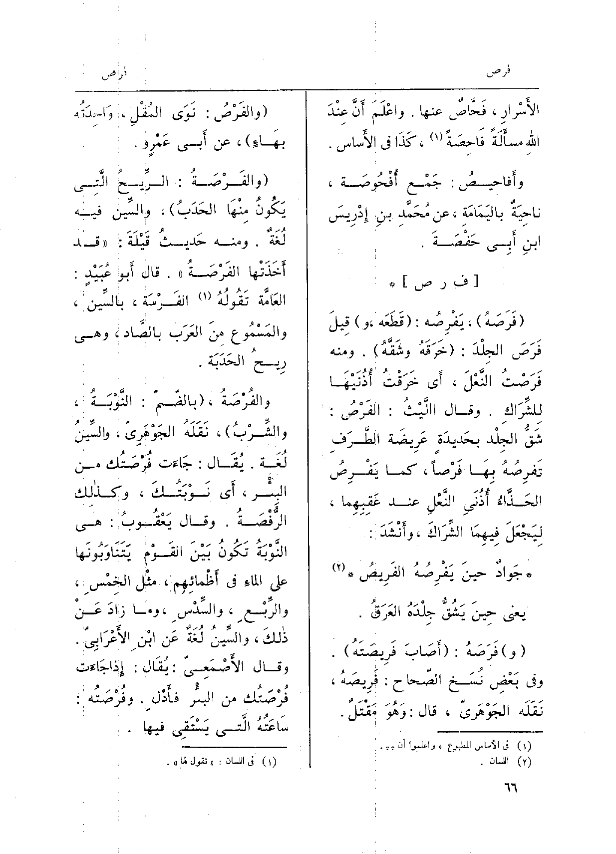 فَرَصَهُ، يَفْرِصُه: قَطَعَه، وقِيلَ فَرَصَ الجِلْدَ: خَرَقَهُ وشَقَّهُ. وَمِنْه بَرَصْتُ النَّعْلَ، أَي خَرَقْتُ أُذُنَيْهَا لِلشِّرَاكِ. وَقَالَ اللَّيْثُ: الفَرْصُ: شَقُّ الجِلْد بحَدِيدَةٍ عَرِيضَة الطَّرَفِ تَفرِصُهُ بِهَا فَرْصاً، كَمَا يَفْرِصُ الحَذَّاءُ أُذُنَي النَّعْلِ عِنْد عَقِبِهِما، لِيَجْعَلَ فِيهِمَا الشِّرَاكَ، وأَنْشَدَ: جَوادٌ حينَ يَفْرِصُهُ الفَرِيصُ يَعْنِي حِينَ يشق جلده العَرَقُ. فَرَصَهُ: أَصَابَ فَرِيصَتَهُ. وَفِي بَعْضِ نُسَخ الصّحاح: فَرِيصَهُ، نَقَلَه الجَوْهَرِيّ، قَالَ: وَهُوَ مَقْتَلٌ. والفَرْصُ: نَوَى المُقْلِ، وَاحِدَتُه بهَاءٍ، عَن أَبي عَمْرٍ و. والفَرْصَةُ: الرِّيحُ الَّتِي يُكُونُ مِنْهَا الحَدَبُ، والسِّين فِيهِ لُغَةٌ. وَمِنْه حَديثُ قَيْلَةَ: قد أَخَذَتْها الفَرْصَةُ. قَالَ أَبو عُبَيْدٍ: العَامَّة تَقُولُهُ الفَرْسَة، بالسِّين، والمَسْمُوع مِنَ العَرَب بالصَّاد، وَهِي رِيحُ الحَدَبَة. والفُرْصَةُ، بالضّمّ: النَّوْبَةُ، والشِّرْبُ، نَقَلَهُ الجَوْهَرِيّ، والسِّينُ لُغَة. يُقَال: جَاءَت فُرْصَتُك من البِئْر، أَي نَوْبَتُكَ، وكذلِك الرُّفْصَةُ. وَقَالَ يُعْقُوبُ: هِيَ النَّوْبَةُ تَكُونُ بَيْنَ القَوْم يَتَنَاوَبُونَها على الماءِ فِي أَظْمائِهِم، مثْل الخِمْسِ، والرِّبْعِ، والسِّدْسِ، وَمَا زادَ عَنْ ذلكَ، والسِّينُ لُغَةٌ عَنْ ابْنِ الأَعْرَابِيّ. وَقَالَ الأَصْمَعِيّ: يُقَال: إِذا جَاءَت فُرْصَتُك من البئْر فأَدْلِ. وفُرْصَتُه: سَاعَتُهُ الَّتِي يَسْتَقِي فِيهَا.