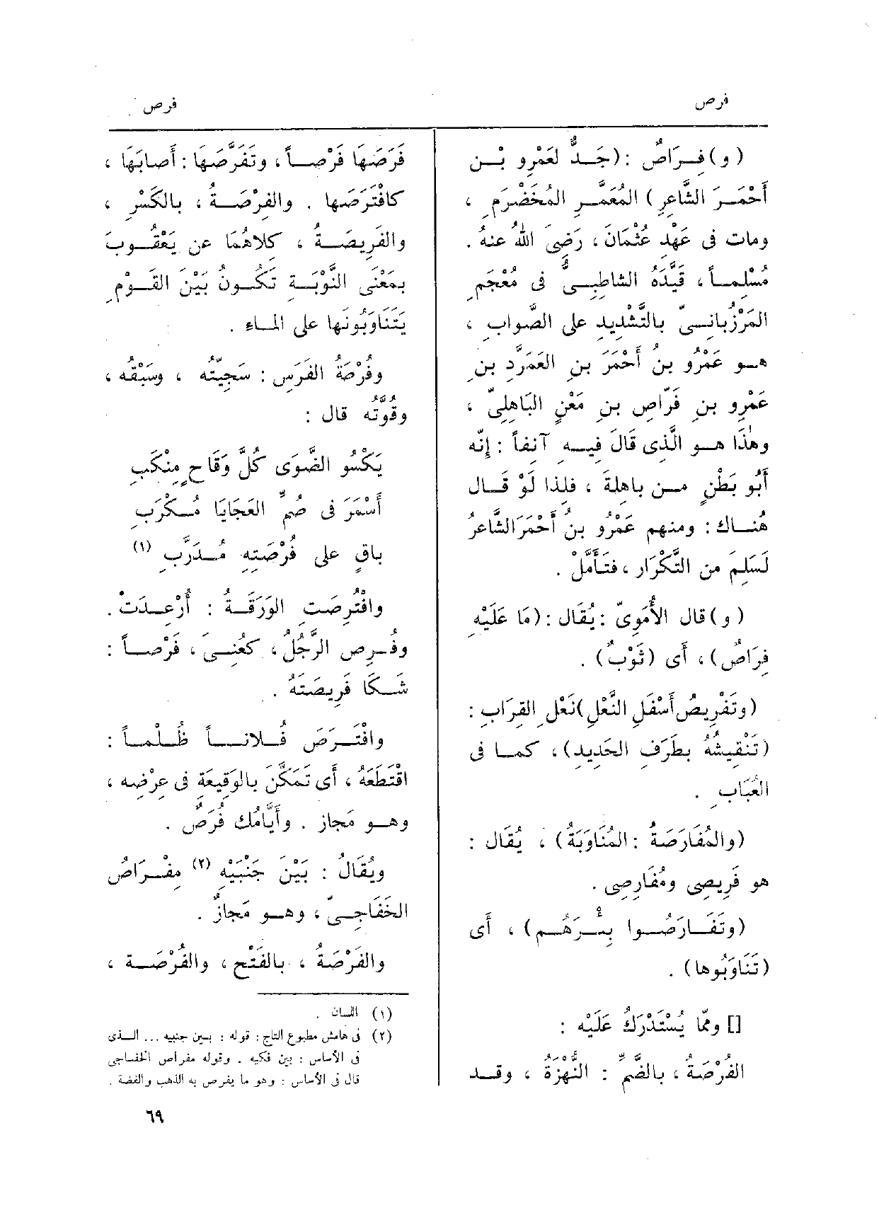 فِرَاصٌ: جَدٌّ لعَمْرِو بْن أَحْمَرَ الشَّاعِرِ المُعَمَّرِ المُخَضْرَمِ، وَمَات فِي عَهْدِ عُثْمَانَ، رَضِيَ اللهُ عنهُ. مُسْلِماً، قَيَّدَهُ الشاطِبِيُّ فِي مُعْجَمِ المَرْزُبانِيّ بالتَّشْدِيدِ على الصَّوابِ، هُوَ عَمْرُو بنُ أَحْمَرَ بنِ العَمَرَّدِ بنِ عَمْرِو بنِ فَرّاصِ بنِ مَعْنٍ البَاهِلِيّ، وهذَا هُوَ الَّذِي قَالَ فِيهِ آنِفاً: إِنّه أَبُو بَطْنٍ من باهِلَة، فلِذا لَوْ قَال هُناك: وَمِنْهُم عَمْرُو بنُ أَحْمَرَ الشَّاعرُ لَسَلِمَ من التَّكْرَار، فتَأَمَّلْ. قَالَ الأُمَوِيّ: يُقَال: مَا عَلَيْهِ فِرَاصٌ، أَي ثَوْبٌ. وتَفْرِيصُ أَسْفَلِ النَّعْلِ نَعْلِ القِرَابِ: تَنْقِيشُهُ بطَرَفِ الحَدِيدِ، كَمَا فِي العُبَابِ. والمُفَارَصَةُ: المُنَاوَبَةُ، يُقَال: هُوَ فَرِيصِي ومُفَارِصِي. وتَفَارَصُوا بِئْرَهُم، أَي تَنَاوَبُوها. وممّا يُسْتَدْرَكُ عَلَيْه: الفُرْصَةُ، بالضَّمِّ: النُّهْزَةُ، وَقد فَرَصَهَا فَرْصاً، وتَفَرَّصَهَا: أَصابَهَا، كافْتَرَصَها. والفِرْصَةُ، بالكَسْرِ، والفَرِيصَةُ، كِلاهُمَا عَن يَعْقُوبَ بمَعْنَى النَّوْبَةِ تَكُونُ بَيْنَ القَوْمِ يَتَنَاوَبُونَها على الماءِ. وفُرْصَةُ الفَرَسِ: سَجِيّتُه، وسَبْقُه، وقُوَّتُه قَالَ:) يَكْسُو الضَّوَى كُلَّ وَقَاحٍ مِنْكَبِ أَسْمَرَ فِي صُمِّ العَجَايَا مُكْرَبِ ياقٍ على فُرْصَتِهِ مُدَرَّبِ وافْتُرِصَتِ الوَرَقَةُ: أُرْعِدَتْ وفُرِص الرَّجُلُ، كعُنِيَ، فَرْصاً: شَكَا فَرِيصَتَهُ. وافْتَرَصَ فُلاناً ظُلْماً: اقْتَطَعَهُ، أَي تَمَكَّنَ بالوَقِيعَةِ فِي عِرْضِه، وَهُوَ مَجاز. وأَيَّامُك فُرَصٌ. ويُقَالُ: بَيْنَ جَنْبَيْهِ مِفْرَاصُ الخَفَاجِيّ، وَهُوَ مَجازٌ. والفَرْصَةُ، بالفَتْح، والفُرْصَة،