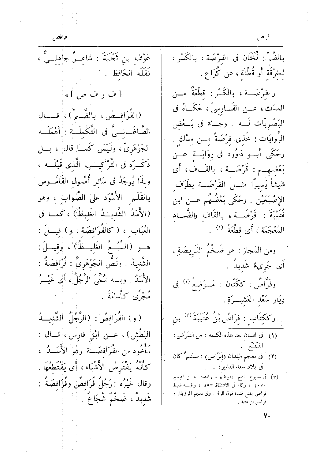 الفُرَافِصُ، بالضَّمِّ، قَالَ الصَّاغَانِيُّ فِي التَّكْمِلَة: أَهْمَلَه الجَوْهَرِيّ، ولَيْسَ كَما قَالَ، بل ذَكَرَه فِي التَّرْكِيب الَّذِي قَبْلَه، ولِذَا يُوجَدُ فِي سَائِر أُصُولِ القَامُوس بالقَلَمِ الأَسْوَد على الصَّوابِ، وَهُوَ الأَسَدُ الشَّدِيدُ الغَلِيظُ، كَمَا فِي العُبَابِ، كالفُرَافِصَةِ، وقِيلَ: هُوَ السَّبُعُ الغَلِيظُ، وقِيلَ: الشَّدِيدُ.
