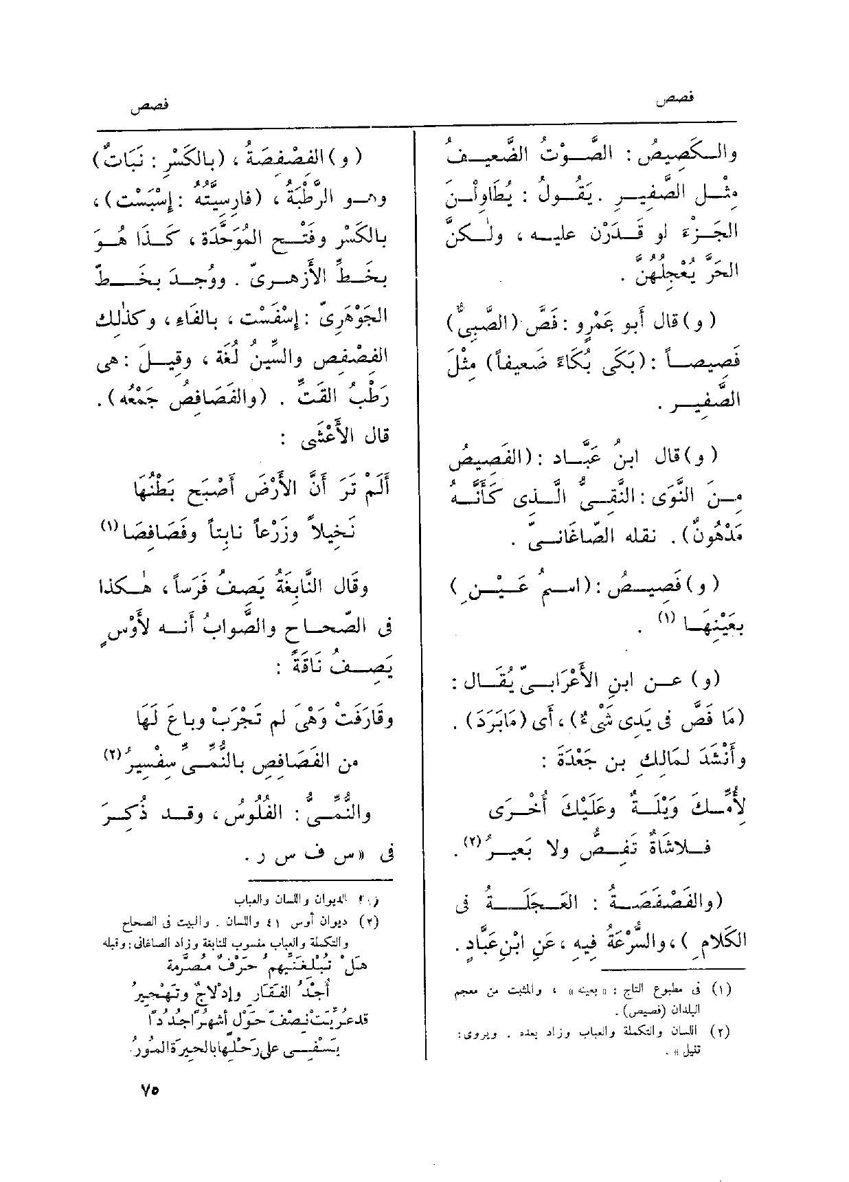 (أَلَمْ تَرَ أَنَّ الأَرْضَ أَصْبَح بَطْنُهَا ... نَخِيلاً وزَرْعاً نابِتاً {وفَصَافِصَا)