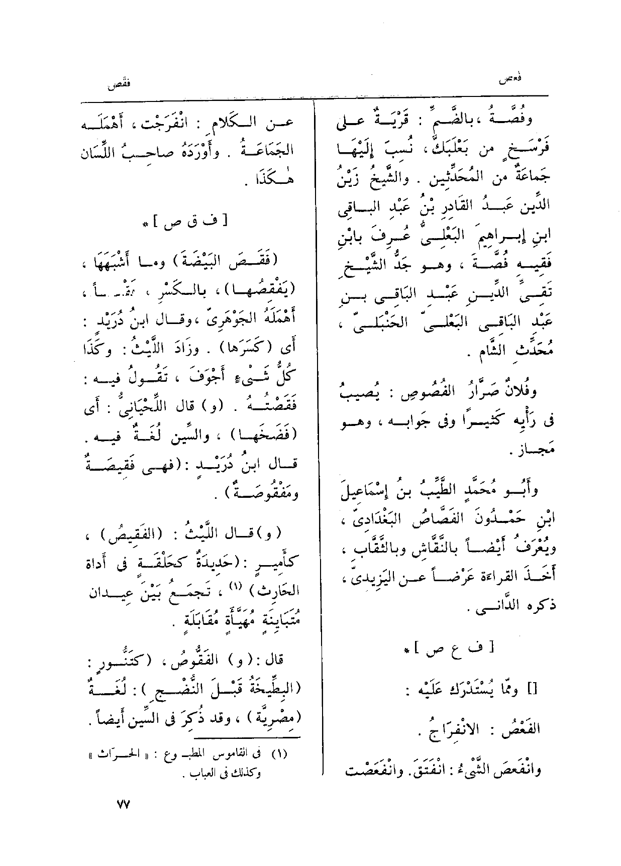 {وفُصَّةُ، بالضَّمِّ: قَرْيَةٌ على فَرْسَخٍ من بَعْلَبَكَّ، نُسِبَ إِلَيْهَا جَماعَةٌ من المُحَدِّثِين. والشَّيخُ زَيْنُ الدِّين عَبْدُ القَادرِ بْنُ عَبْدِ الباقِي ابنِ إِبراهِيمَ البَعْلِيُّ عُرِفَ بابْنِ فَقِيهِ} فُصَّةَ، وَهُوَ جَدُّ الشَّيْخِ تَقِيِّ الدِّينِ عَبْدِ البَاقِي بنِ عَبْدِ البَاقِي البَعْليّ الحَنْبَليّ، مُحَدِّثِ الشَّام. وفُلانٌ صَرَّارُ {الفُصُوصِ: يُصيبُ فِي رَأْيِه كَثيراً وَفِي جَوابه، وَهُوَ مَجاز. وأَبُو مُحَمَّدٍ الطَّيِّبُ بنُ إِسْمَاعيلَ ابْنِ حَمْدُونَ} الفَصَّاصُ البَغْدَادِيّ، ويُعْرَفُ أَيْضاً بالنَّقَّاشِ وبالثَّقَّابِ، أَخَذَ القراءَة عَرْضاً عَن اليَزِيديّ، ذكره الدَّاني.