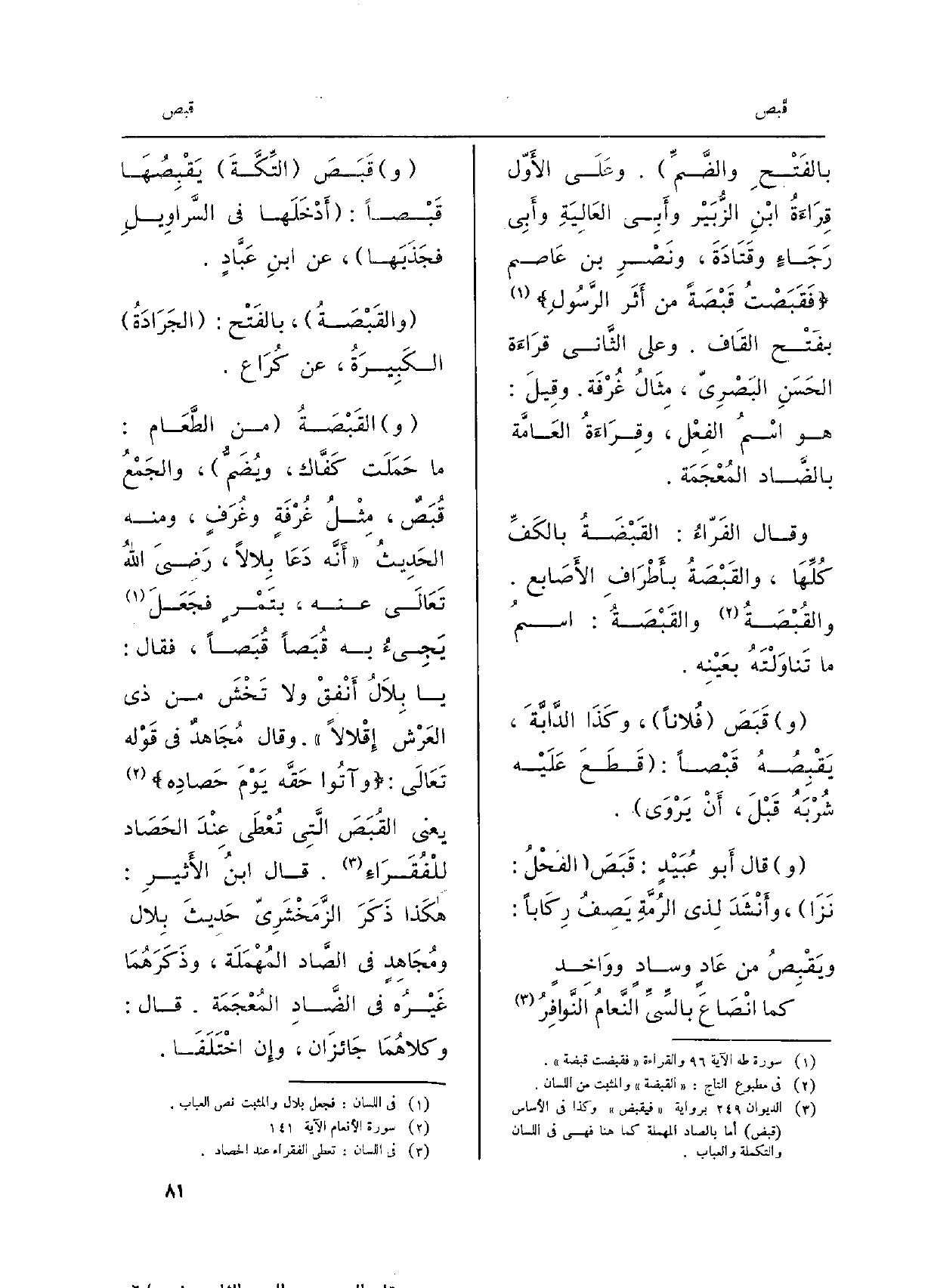 وعَلَى الأَوّل قِرَاءَةُ ابْنِ الزُّبَيْر وأَبِي العَالِيَةِ وأَبِي رَجَاءٍ وقَتَادَةَ، ونَصْرِ بن عَاصم فَقضبَصْتُ قَبْصَةً من أَثَرِ الرَّسُولِ بفَتْح القَاف. وعَلى الثَّانِي قرَاءَة الحَسَنِ البَصْرِيّ، مِثَالُ غُرْفَة. وقِيلَ: هُوَ اسْمُ الفِعْل، وقِرَاءَةُ العَامَّة بالضَّاد المُعْجَمَة. وَقَالَ الفَرَّاءُ: القَبْضَةُ بالكَفِّ كُلِّهَا، والقَبْصَةُ بأَطْرَافِ الأَصَابِع. والقُبْصَةُ والقَبْصَةُ: اسمُ مَا تَناوَلْتَهُ بعَيْنِه. قَبَصَ فُلاناً، وكَذَا الدَّابَّةَ، يَقْبِصُه قَبْصاً: قَطَعَ عَلَيْه شُرْبَهُ قَبْلَ، أَنْ يَرْوَى. قَالَ أَبو عُبَيْدٍ: قَبَصَ الفَحْلُ: نَزَا، وأَنْشَدَ لِذِي الرُمَّةِ يَصِفُ رِكَاباً: