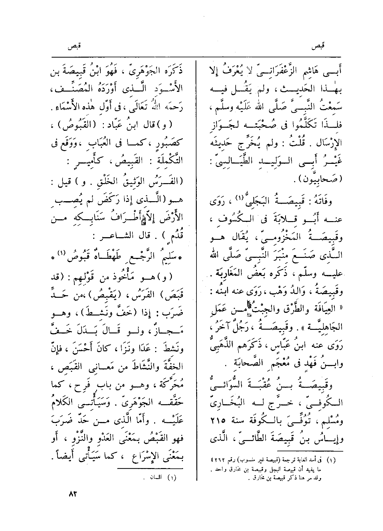هَاشِم الزَّعْفَرَانِيّ لَا يُعْرَفُ إِلَّا بِهَذَا الحَدِيث، وَلم يَقُل فِيهِ سَمِعْتُ النَّبِيَّ صَلَّى الله عَلَيْه وسلَّم، فلِذَا تَكَلَّمُوا فِي صُحْبَته لِجَوَازِ الإِرْسَال. قُلْتُ: وَلم يُخْرِّج حَدِيثَه غَيْرُ أَبِي الوَلِيدِ الطَّيَالِسِيّ: صَحابِيَّون. وفَاتَهُ: قَبِيصَةُ البَجَلِيُّ، رَوَى عَنهُ أَبُو قِلابَةَ فِي الكُسُوفِ، وقِبيصَةُ المَخْزُومِيّ، يُقَال هُوَ الَّذِي صَنَعَ مِنْبَرَ النَّبِيّ صَلَّى الله عَلَيْهِ وسلّم، ذَكَره بَعضُ المَغَارِبَة. وقَبِيصَةُ، وَالِدُ وَهْبٍ، رَوَى عَنهُ ابنُه: العِيَافَة والطَّرْق والجِبْتُ من عَمَلِ الجاهِلِيَّة. وقَبِيصَةُ، رَجُلٌ آخَرُ، رَوَى عَنهُ ابنُ عَبّاسٍ، ذَكَرَهم الذَّهَبِيُّ وابنُ فَهْدٍ فِي مُعْجَمِ الصَّحابَةِ. وقَبِيصَةُ بنُ عُقْبَةَ السُّوَائيُّ الكُوفِيّ، خرَّج لَهُ البُخَارِيّ ومُسْلِم، تُوُفِّيَ بالكُوفَة سنة وإِياسُ بنُ قَبِيصَةَ الطَّائِيَ، الَّذِي ذَكَرَ الجَوْهَرِيّ، فَهُوَ ابْنُ قَبِيصَةَ بن الأَسْوَدِ الَّذِي أَوْرَدَهُ المُصَنِّف، رَحِمَه اللهُ تَعَالَى، فِي أَوّلِ هذِه الأَسْمَاءِ. قَالَ ابنُ عَبّاد: القَبُوصُ، كصَبُورٍ، كَمَا فِي العُبَابِ، وَوَقَع فِي التَّكْمِلَةِ: القَبِيصُ، كأَمِيرٍ: الفَرَسُ الوَثِيقُ الخَلْقِ. وَقيل: هُوَ الَّذِي إِذا رَكَضَ لم يُصِبِ الأَرْضَ إِلاّ أَطْرَافُ سَنَابِكِه من قُدُمٍ. قَالَ الشَّاعِر. سَلِيمُ الرَّجْعِ طَهْطَاهٌ قَبُوصُ هُوَ مأْخُوذ من قَوْلِهِم: قَد قَبَصَ الفَرَسُ، يَقْبِصُ، من حَدِّ ضَرَب: إِذا خَفَّ ونَشِطَ، وَهُوَ مَجازٌ، وَلَو قَالَ بَدَلَ خَفَّ ونَشِطَ: عَدَا ونَزَا، كانَ أَحْسَنَ، فإِنّ الخِفَّةَ والنَّشَاطَ من مَعانِي القَبَصِ، مُحَرَّكَة، وَهُوَ من بَاب فَرِح، كَمَا حَقَّقه الجَوْهَرِيّ. وَسَيَأْتِي الكَلامُ عَلَيْه. وأَمّا الَّذِي من حَدّ ضَرَبَ فَهُوَ القَبْصُ بمَعْنَى العَدْوِ والنَّزْوِ، أَو بمَعْنَى الإِسْرَاعِ، كَمَا سَيَأْتِي أَيضاً.