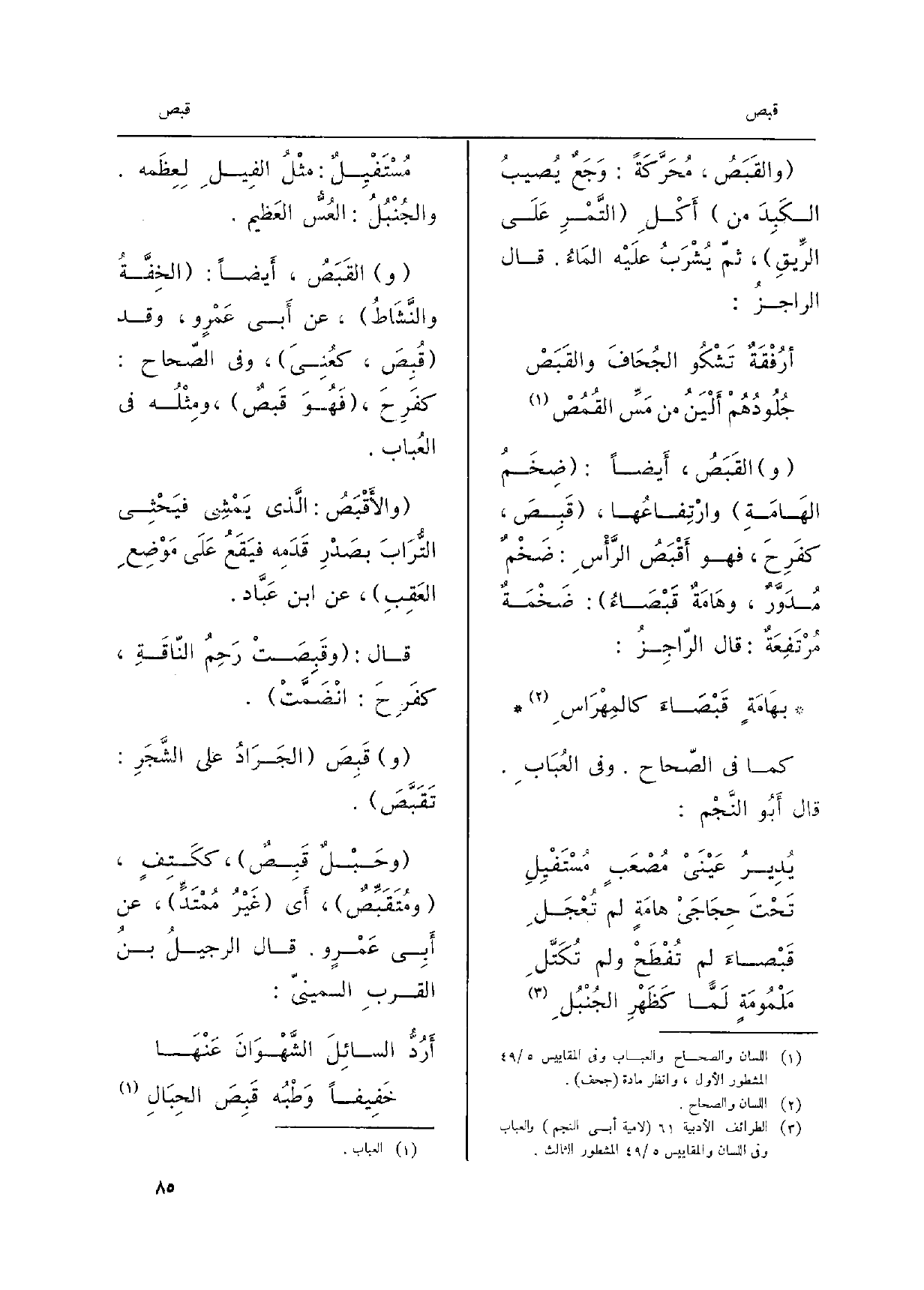 والقَبَصُ، مُحَرَّكَةً: وَجَعٌ يُصيبُ الكَبِدَ من أَكْلِ التَّمْرِ عَلَى الرِّيقِ، ثمّ يُشْرَبُ عَلَيْه المَاءُ. قَالَ الراجزُ: أرُفْقَةٌ تَشْكُو الجُحَافَ والقَبَصْ جُلُودُهُمْ أَلْيَنُ من مَسِّ القُمُصْ القَبَصُ، أَيضاً: ضِخَمُ الهَامَةِ وارْتِفاعُها، قَبِصَ، كفَرِحَ، فَهُوَ أَقْبَصُ الرَّأْسِ: ضَخْمٌ مُدَوَّرٌ، وهَامَةٌ قَبْصَاءُ: ضَخْمَةٌ مُرْتَفِعَةٌ: قَالَ الرّاجِزُ: بهَامةٍ قَبْصَاءَ كالمِهْرَاسِ كَمَا فِي الصّحاح. وَفِي العُبَابِ. قَالَ أَبُو النَّجْم: يُدِيرُ عَيْنَيْ مُصْعَبٍ مُسْتَفْيِلِ تَحْتَ حِجَاجَيْ هامَةٍ لم تُعْجَلِ قَبْصاءَ لم تُفْطَحْ وَلم تُكَتَّلِ مَلْمُومَةٍ لَمًّا كَظَهْرِ الجُنْبُلِ مُسْتَفْيِلٌ: مثْلُ الفِيلِ لِعِظَمه. والجُنْبُلُ: العُسُّ العَظيم. القَبَصُ، أَيضاً: الخِقَّةُ والنَّشَاطُ، عَن أَبي عَمْرٍ و، وَقد قُبِصَ، كعُنِيَ، وَفِي الصّحاح: كفَرِحَ، فَهُوَ قَبِصٌ، ومِثْلُه فِي العُباب. والأَقْبَصُ:)