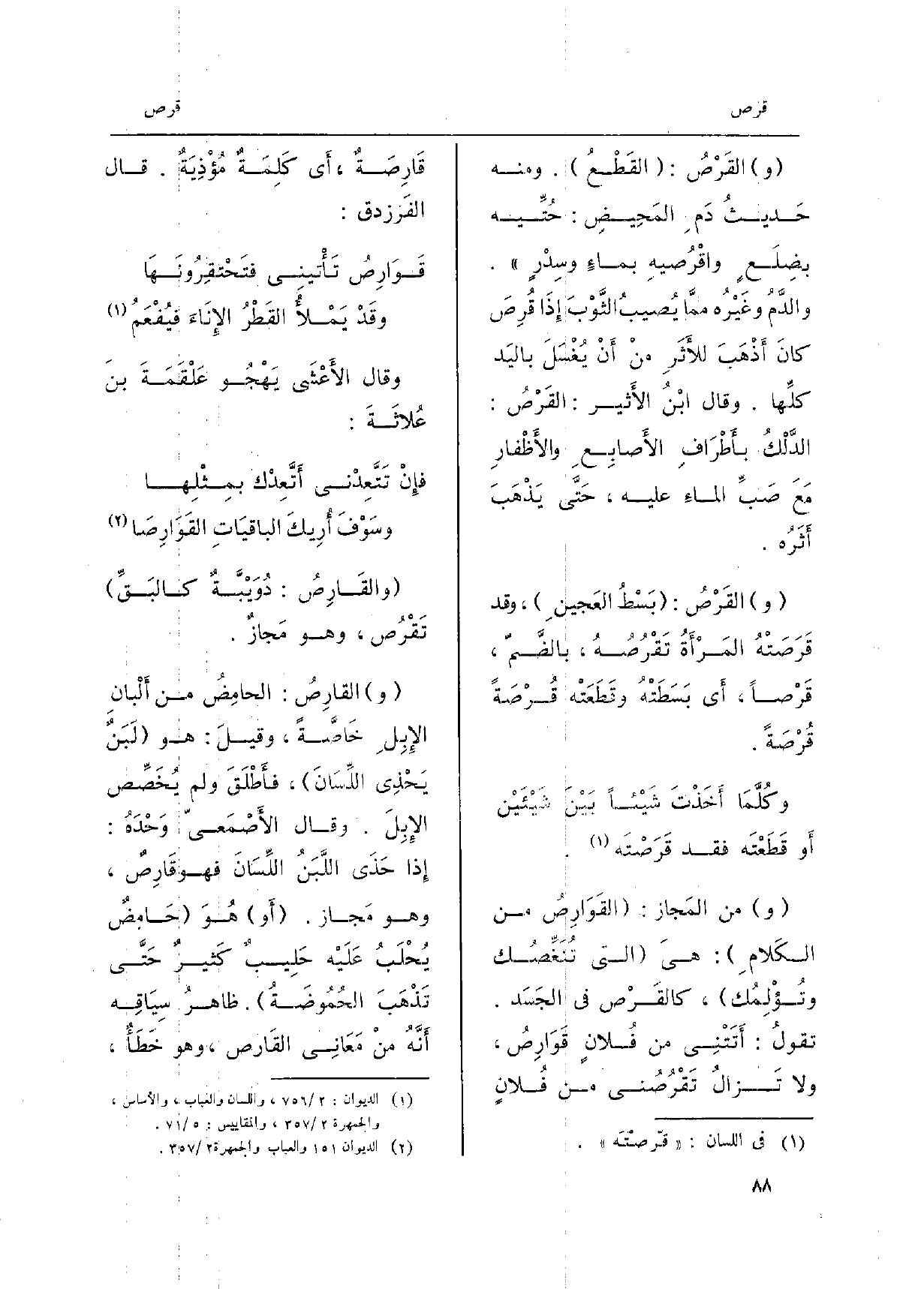 والقارِصُ: دُوَيْبَّةٌ كالبَقِّ تَقْرُص، وَهُوَ مَجازٌ. القارِصُ: الحامِضُ من أَلْبانِ الإِبِلِ خاصَّةً، وقيلَ: هُوَ لَبَنٌ يَحْذِي اللِّسَانَ، فأَطْلَقَ وَلم يُخَصِّص الإِبِلَ. وَقَالَ الأَصْمَعيّ وَحْدَهُ: إِذا حَذَى اللَّبَنُ اللِّسَانَ فَهُوَ قَارِصٌ، وَهُوَ مَجاز. أَو هُوَ حَامِضٌ يُحْلَبُ عَلَيْه حَلِيبٌ كَثيرٌ حَتَّى تَذْهَبَ الحُمُوضَةُ. ظاهرُ سِيَاقِه أَنَّهُ منْ مَعَانِي القَارص، وَهُوَ خَطَأٌ،