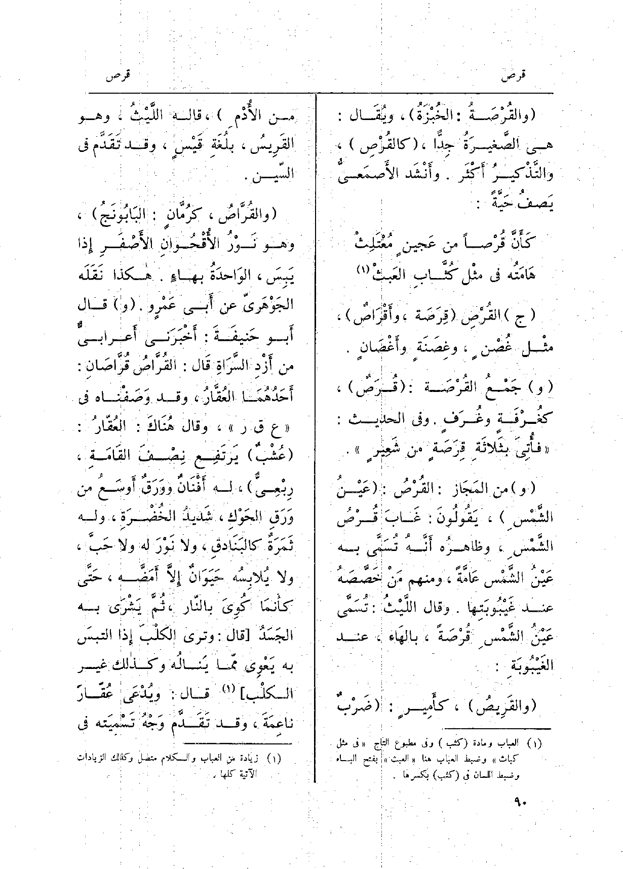 والقُرْصَةُ: الخُبْزَةُ، ويُقَال: هِيَ الصَّغيرَةُ جِدّاً، كالقُرْصِ، والتَّذْكيرُ أَكْثَر. وأَنْشَد الأَصمَعيُّ يَصفُ حَيَّةً: كأَنَّ قُرْصاً من عَجينٍ مُعْتَلِثْ هَامَتُه فِي مثْل كُثَّابِ العَبثْ ج القُرْصِ قِرَصَه، وأَقْرَاصٌ، مثْل غُصْنٍ، وغِصَنَةٍ وأَغْصَانٍ. جَمْعُ القُرْصَة: قُرْصٌ، كغُرْفَةٍ وغُرَفٍ. وَفِي الحَدِيث: فأُتِيَ بثَلاثَةِ قِرَصَةٍ من شَعِيرٍ. من المَجَاز: القُرْصُ: عَيْنُ الشَّمْسِ، يَقُولُونَ: غَابَ قُرْصُ الشَّمْسِ، وظاهرُه أَنَّهُ تُسَمَّى بِهِ عَيْنُ الشَّمْس عَامَّةً، وَمِنْهُم مَنْ خَصَّصَهُ عِنْد غَيْبُوبَتِها. وَقَالَ اللَّيْثُ: تُسَمَّى عَيْنُ الشَّمْسِ قُرْصَةً، بالهَاءِ، عِنْد الغَيْبُوبَةِ: والقَرِيصُ، كأَمِيرٍ: ضَرْبٌ من الأُدْمِ، قَالَه اللَّيْثُ، وَهُوَ القَرِيسُ، بلُغَةِ قَيْسٍ، وَقد تَقَدَّم فِي)