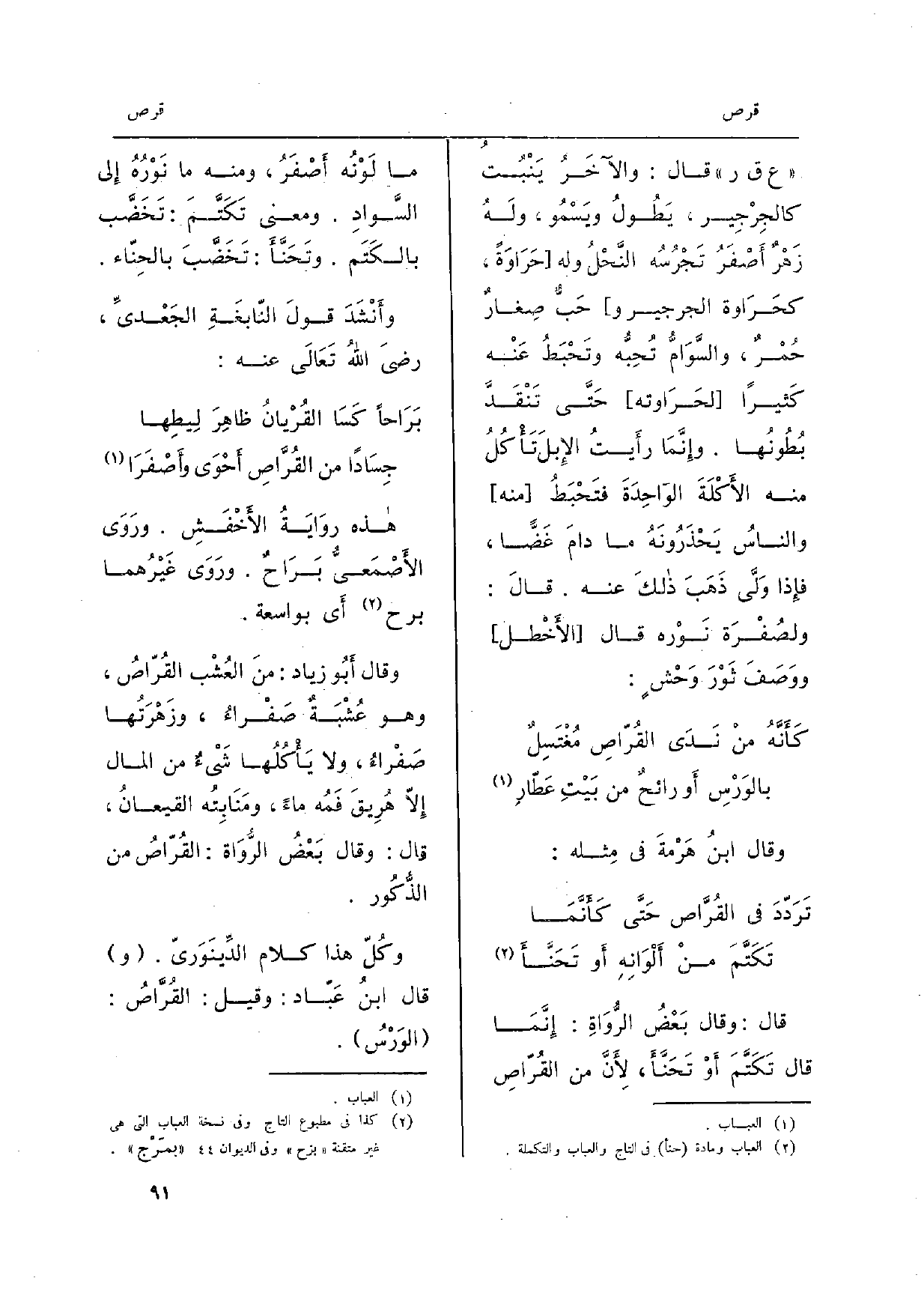 قَالَ: وَقَالَ بَعْضُ الرُّوَاةِ: إِنَّمَا قَالَ تَكَتَّمَ أَوْ تَحَنَّأَ، لأَنَّ من القُرّاصِ مَا لَوْنُه أَصْفَرُ، وَمِنْه مَا نَوْرُهُ إِلى السَّوادِ. وَمعنى تَكَتَّمَ: تَخَضَّب بالكَتَم. وتَحَنَّأَ: تَخَضَّبَ بالحِنّاء. وأَنْشَدَ قولَ النّابغَةِ الجَعْديِّ، رضيَ اللهُ تَعَالَى عَنهُ: