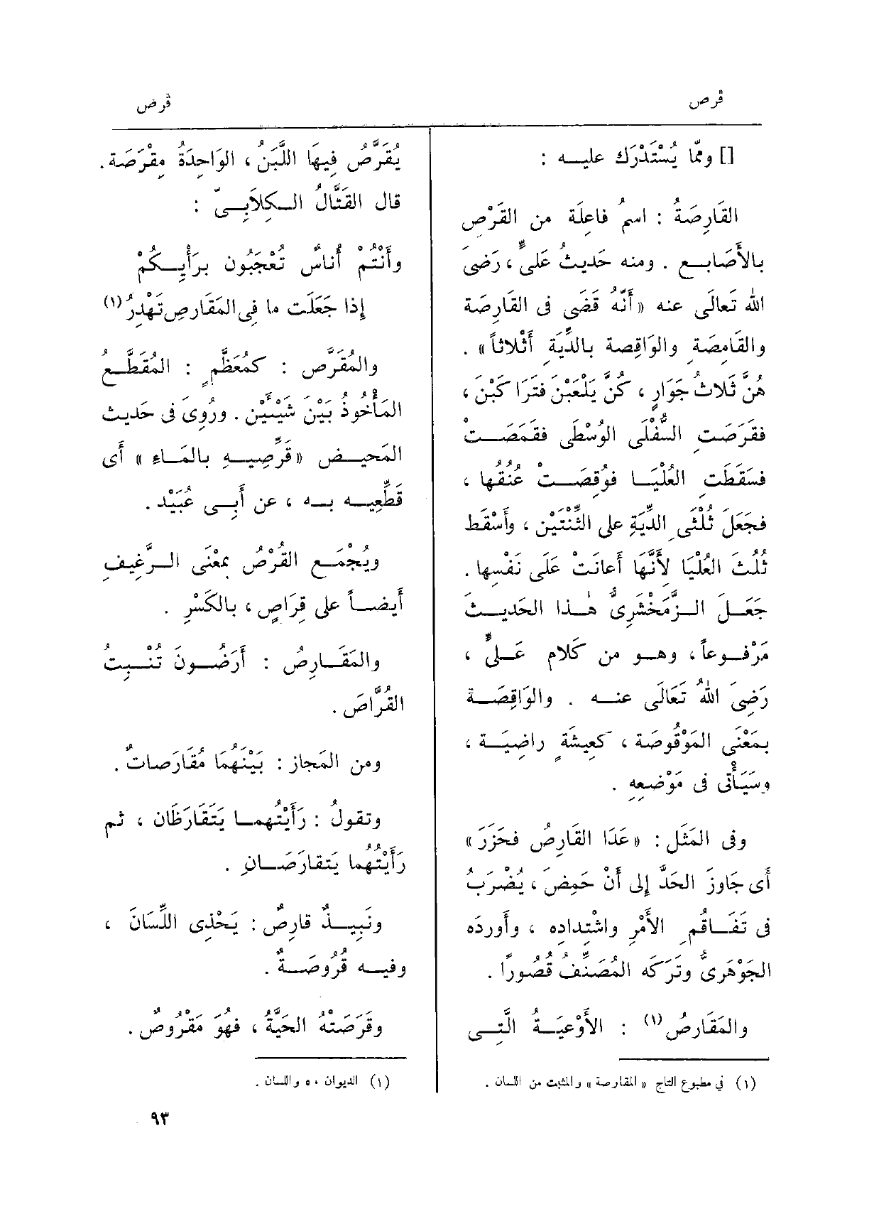 وممّا يُسْتَدْرَك عَلَيْهِ: القَارِصَةُ: اسمُ فاعِلَة من القَرْصِ بالأَصَابع. وَمِنْه حَدِيثُ عَليٍّ، رَضيَ الله تَعالَى عَنهُ أَنّهُ قَضَى فِي القَارِصَة والقَامِصَةِ والوَاقِصة بالدِّيَةِ أَثْلاثاً. هُنَّ ثَلاثُ جَوَارٍ، كُنَّ يَلْعَبْنَ فتَرَاكَبْنَ، فقَرَصَتِ السُّفْلَى الوُسْطَى فقَمَصَتْ فسَقَطَتِ العُلْيَا فوُقِصَتْ عُنُقُها، فجَعَلَ ثُلْثَيِ الدِّيَةِ على الثِّنْتَيْن، وأَسْقَط ثُلُثَ العُلْيَا لأَنَّهَا أَعانَتْ عَلَى نَفْسِها. جَعَلَ الزَّمَخْشَرِيُّ هَذَا الحَدِيثَ مَرْفوعاً، وَهُوَ من كَلام عَليٍّ، رَضِيَ اللهُ تَعَالَى عَنهُ. والوَاقِصَة بمَعْنَى المَوْقُوصَة، كعِيشَةٍ راضِيَة، وسَيَأْتي فِي مَوْضِعِه. وَفِي المَثَل: عَدَا القَارِصُ فحَزَرَ أَي جَاوزَ الحَدَّ إِلى أَنْ حَمِضَ، يُضْرَبُ فِي تَفَاقُمِ الأَمْرِ واشْتِدادِه، وأَوردَه الجَوْهَريُّ وتَرَكَه المُصَنِّفُ قُصُوراً. والمَقَارِصُ: الأَوْعِيَةُ الَّتِي يُقَرَّصُ فِيهَا اللَّبَنُ، الوَاحِدَةُ مِقْرَصَة قَالَ القَتَّالُ الكِلاَبِيّ:
