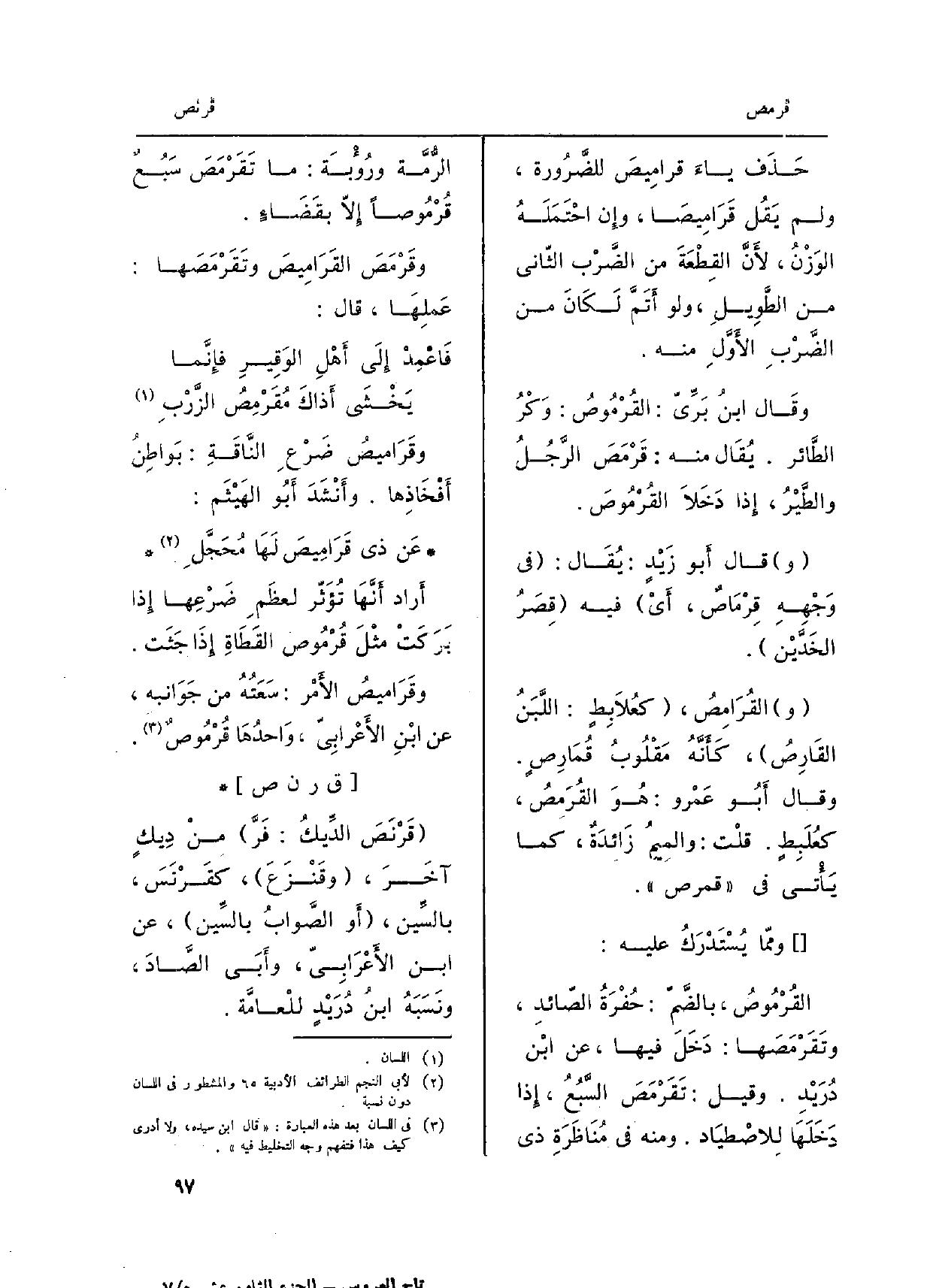حَذَف ياءَ قرامِيصَ للضَّرُورة، وَلم يَقُل قَرَامِيصَا، وإِن احْتَمَلَهُ الوَزْنُ، لأَنَّ القِطْعَةَ من الضَّرْب الثّاني من الطَّوِيلِ، وَلَو أَتَمَّ لَكَانَ من الضَّرْبِ الأَوَّلِ مِنْهُ. وقَال ابنُ بَرِّيّ: القُرْمُوصُ: وَكْرُ الطَّائر. يُقَال مِنْهُ: قَرْمَصَ الرَّجُلُ والطَّيْرُ، إِذا دَخَلاَ القُرْمُوصَ. قَالَ أَبو زَيْدٍ: يُقَال: فِي وَجْهِهِ قِرْمَاصٌ، أَيْ فِيهِ قِصَرُ الخَدَّيْن. القُرَامِصُ، كعُلاَبِطٍ: اللَّبَنُ القَارِصُ، كَأَنَّهُ مَقْلُوبُ قُمَارِصٍ.)