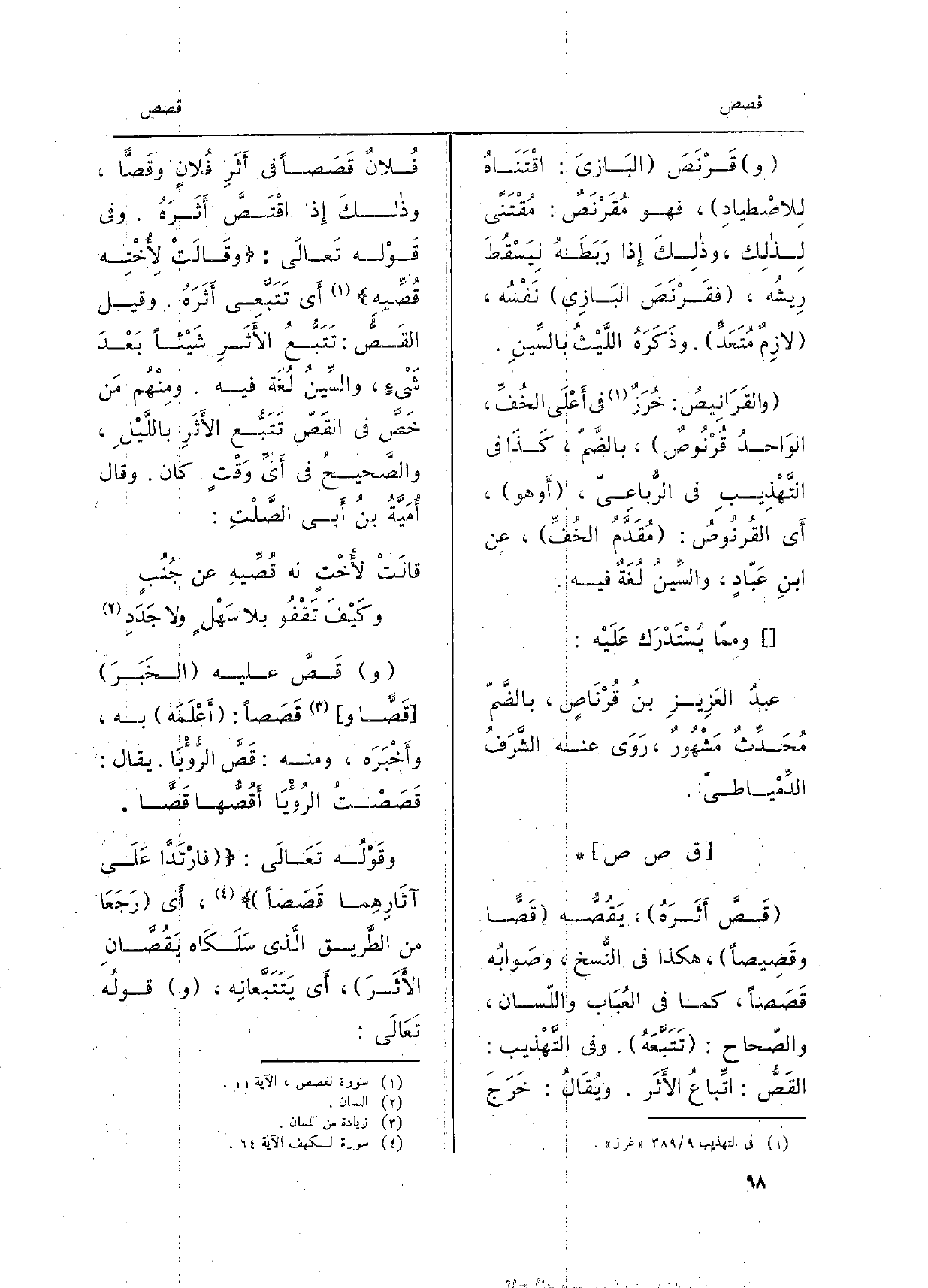 وَقيل {القَصُّ: تَتَبُّعُ الأَثَرِ شَيْئاً بَعْدَ شَيْءٍ، والسِّينُ لُغَة فِيهِ. ومِنْهُم مَن خَصَّ فِي القَصّ تَتَبُّع الأَثَرِ باللَّيْلِ، والصَّحيحُ فِي أَيِّ وَقْتٍ كَانَ. وَقَالَ أُمَيَّةُ بنُ أَبي الصَّلْتِ: