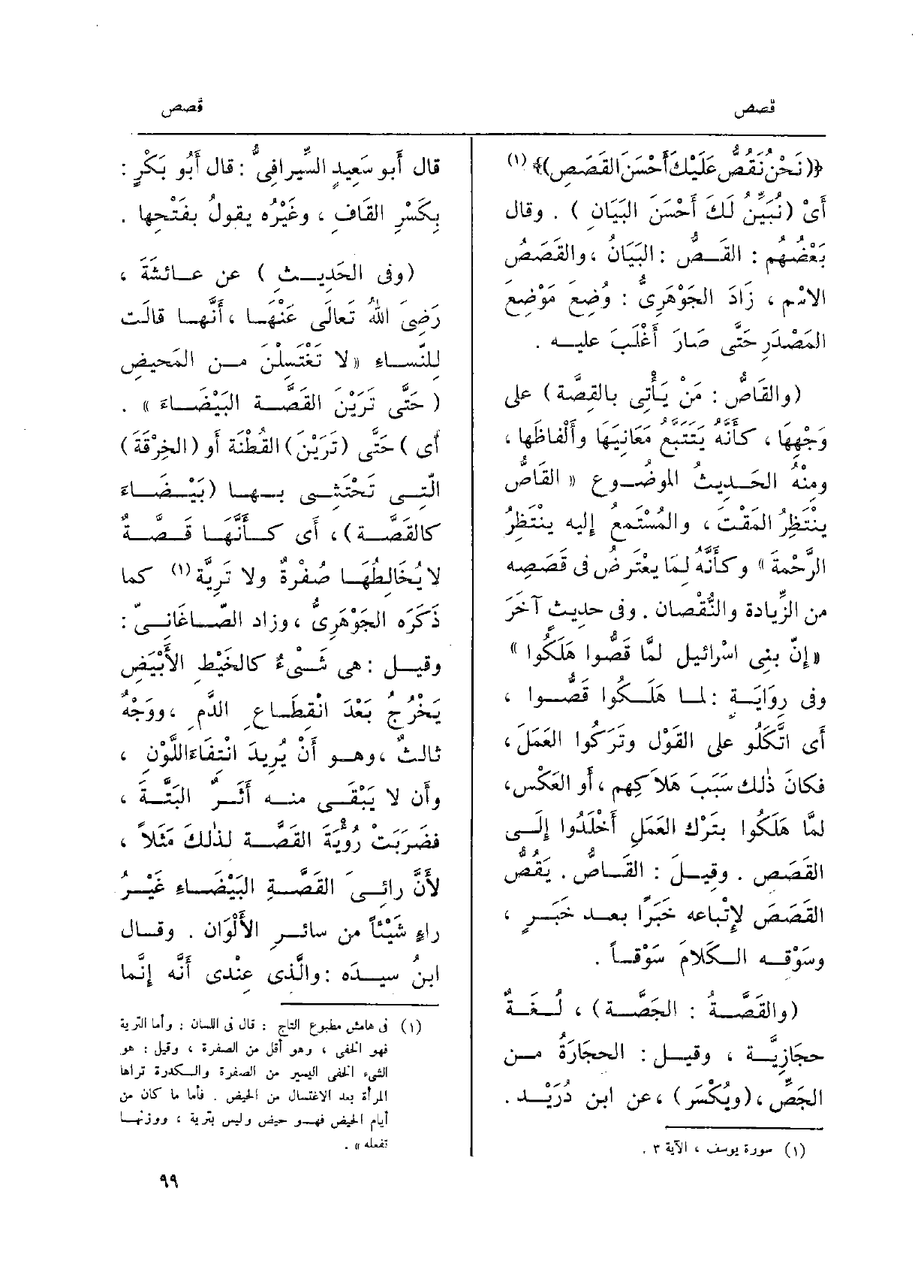 نَحْنُ {نَقُصُّ عَلَيْكَ أَحْسَنَ} القَصَصِ أَيْ نُبَيِّنُ لَكَ أَحْسَنَ البَيَانِ. وَقَالَ بَعْضُهُم: {القَصُّ: البَيَانُ،} والقَصَصُ الاسْم، زَادَ الجَوْهَرِيُّ: وُضِعَ مَوْضِعَ المَصْدَرِ حَتَّى صَارَ أَغْلَبَ عَلَيْهِ. {والقَاصُّ: مَنْ يَأْتِي} بالقِصَّة على وَجْهِهَا، كأَنَّهُ يَتَتَبَّعُ مَعَانِيَهَا وأَلْفَاظَها، ومِنْهُ الحَدِيثُ الموضُوع {القَاصُّ ينْتَظِرُ المَقْتَ، والمُسْتَمعُ إِليه ينْتَظِرُ الرَّحْمةَ وكأَنَّهُ لِمَا يعْتَرضُ فِي} قَصَصِه من الزِّيادة والنُّقْصان. وَفِي حَدِيث آخَرَ إِنّ بنِي أسْرائيل لمَّا {قَصُّوا هَلَكُوا وَفِي رِوَايَةٍ: لما هَلَكُوا قَصُّوا، أَي اتكلو على القَوْل وَتركُوا الْعَمَل فَكَانَ ذَلِك سَبَب هلاكهم أَو الْعَكْس لما هَلَكُوا بتَرْك العَمَلِ أَخْلَدُوا إِلَى القَصَصِ. وقِيلَ:} القَاصُّ. يَقُصُّ القَصَصَ لإِتْباعه خَبَراً بعد خَبَرٍ، وسَوْقه الكَلامَ سَوْقاً. {والقَصَّةُ: الجَصَّة، لُغَةٌ حجَازِيَّة، وَقيل: الحجَارَةُ من الجَصِّ، ويُكْسَر، عَن ابنِ دُرَيْد. قَالَ أَبو سَعِيدٍ السِّيرافِيُّ: قَالَ أَبُو بَكْرٍ: بِكَسْرِ القَافِ، وغَيْرُه يقولُ بفَتْحِها. وَفِي الحَدِيثِ عَن عائشَةَ، رَضِيَ اللهُ تَعالَى عَنْهَا، أَنَّها قالَت لِلنّساءِ لَا تَغْتَسِلْنَ من المَحيضِ حَتَّى تَرَيْنَ} القَصَّة البَيْضَاءَ. أَي حَتَّى تَرَيْنَ القُطْنَة أَو الخِرْقَةَ الّتِي تَحْتَشِي بهَا بَيْضَاءَ {كالقَصَّة، أَي كأَنَّهَا} قَصَّةٌ لَا يُخَالِطُهَا صُفْرةٌ وَلَا تَرِيَّة كَمَا ذَكَرَه الجَوْهَرِيُّ، وَزَاد الصّاغَانِيّ: وَقيل هِيَ شَيْء الْخَيط الْأَبْيَض يَخْرُجُ بَعْدَ انْقِطَاعِ الدَّمِ، ووَجْهٌ ثالِثٌ، وَهُوَ أَنْ يُرِيدَ انْتِفَاءَ اللَّوْنِ، وأَن لَا يَبْقَى مِنْهُ أَثَرٌ البَتَّةَ، فضَرَبَتْ رُؤْيَةَ! القَصَّة لذلِكَ مَثَلاً، لأَنَّ رائِيَ القَصَّةِ البَيْضَاءِ غَيْرُ راءٍ شَيْئاً من سائرِ الأَلْوَان. وَقَالَ ابنُ سيدَه: والَّذي عِنْدي أَنَّه إِنَّما