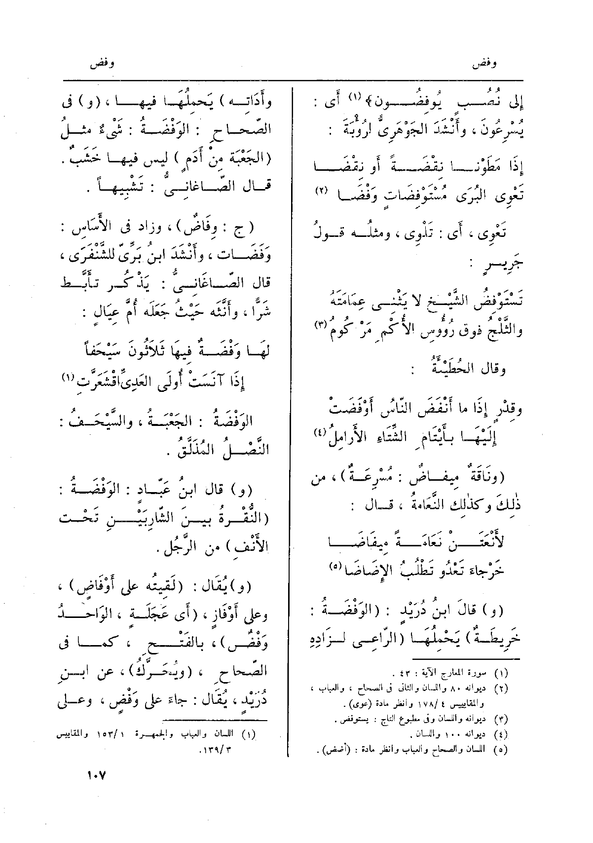 إِلَى نُصُبٍ {يوفِضون أَي: يُسْرِعون، وأَنْشَدَ الجَوْهَرِيّ لرُؤبَةَ: إِذا مَطَوْنا نِقْضَةً أَو نِقْضا تَعْوي البُرَى} مُسْتَوْفِضاتٍ {وَفْضا تَعْوي، أَي: تَلْوي، ومثلُه قولُ جَريرٍ: