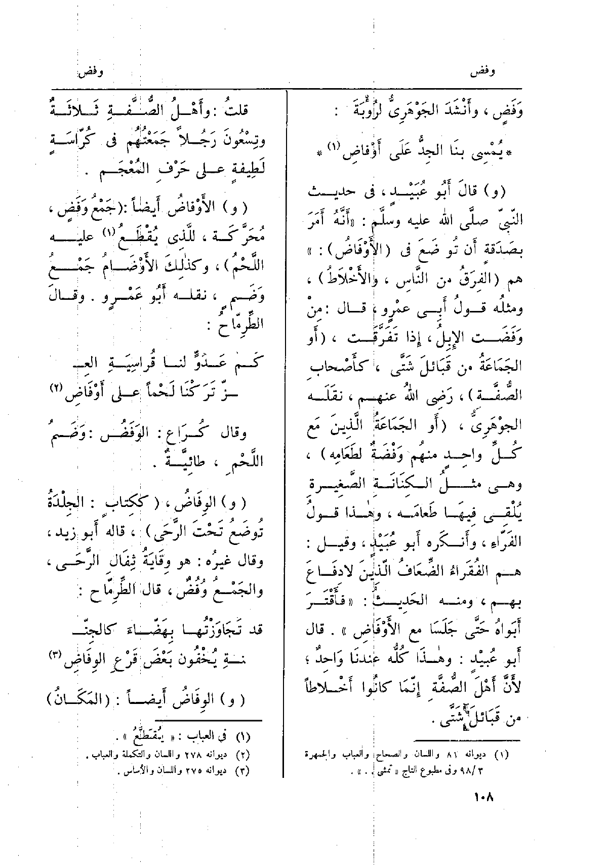 وَفَضٍ، وأَنْشَدَ الجَوْهَرِيّ لرُؤْبَةَ: يُمْسي بِنَا الجِدُّ عَلَى {أَوْفاضِ وَقَالَ أَبو عُبَيْدٍ، فِي حَدِيث النَّبِيّ صَلّى اللهُ عَلَيْهِ وسَلّم: أَنَّهُ أمَرَ بصَدَقةٍ أَن توضَعَ فِي} الأَوْفاضُ: هُوَ الفِرَقُ من النَّاسِ، والأَخْلاطُ، ومثلُه قَوْلُ أَبي عَمْرو، قالَ: مِنْ {وَفَضَت الإبِلُ، إِذا تَفَرَّقَتْ، أَو الجَماعةُ من قَبائلَ شَتَّى، كأصحابِ الصُّفَّة، رَضِيَ الله عَنْهم، نَقَلَهُ الجَوْهَرِيّ، أَو الجَماعة الَّذينَ مَعَ كُلِّ واحِدٍ مِنْهُم وَفْضَةٌ لطَعامه، وَهِي مثلُ الكِنانَةِ الصَّغيرةِ يُلْقي فِيهَا طَعامَه، وَهَذَا قَوْلُ الفَرَّاء، وأنكَره أَبو عُبَيْدٍ، وَقيل: هُوَ الفُقَراءُ الضِّعافُ الَّذين لَا دِفاعَ بهم، ومِنْهُ الحَديثُ: فأَقّتَرَ أبَواهُ حتَّى جَلَسا مَعَ الأَوْفاضِ. قالَ أَبو عُبَيْدٍ: وَهَذَا كُلُّه عندنَا واحِدٌ لِأَن أهْلَ الصُّفَّةِ إنَّما كَانُوا أخْلاطاً من قبائلَ شتَّى. قلتُ: وأهْلُ الصُّفَّةِ ثَلاثةٌ وتِسْعونَ رَجُلاً جَمَعْتُهُم فِي كُرّاسَةٍ لَطيفةٍ عَلَى حَرفِ المُعْجَم. والأَوْفاضُ أَيْضا: جَمْعُ} وَفَضٍ، مُحَرَّكَة، للَّذي يُقْطَعُ عَلَيْهِ اللَّحْمُ، وكَذلِكَ الأوْضامُ جَمْعُ وَضَمٍ، نَقَلَهُ أَبو عَمْرٍ و. وَقَالَ الطِّرِمّاحُ: