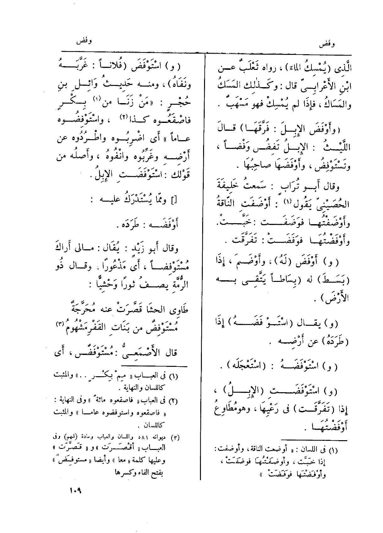 اضْرِبوه واطْرُدوه عَن أرْضِهِ وغَرِّبوه وانْفوهُ، وأصلُه من قَولك: اسْتَوْفَضَتِ الإبِلُ. وممَّا يُسْتَدْرَكُ عَلَيْه: {أَوْفَضَه: طَرَدَه. وَقَالَ أَبو زَيْدٍ: يُقَال: مَالِي أراكَ} مُسْتَوْفِضاً، أَي مَذْعوراً. وَقَالَ ذُو الرُّمَّة يصفُ ثوراً وَحْشِيًّا: