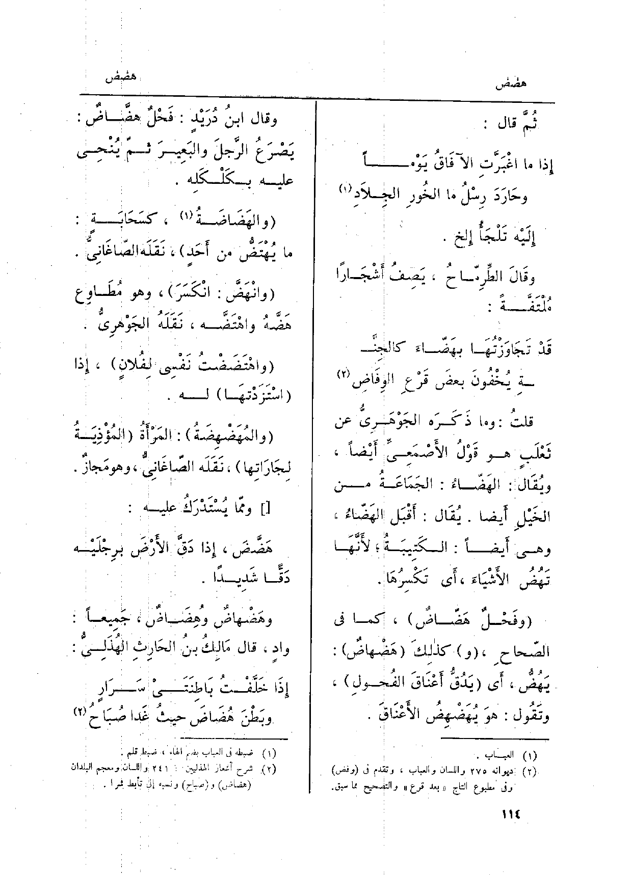 قلتُ: وَمَا ذَكَرَه الجَوْهَرِيّ عَن ثَعْلَبٍ هُوَ قولُ الأَصْمَعِيّ أَيْضا، ويُقال: {الهَضّاءُ: الجَماعَةُ من الخَيْلِ أَيْضا. يُقال: أقْبَل الهَضّاءُ، وَهِي أَيْضا: الكَتيبةُ لأنَّها تَهُضُ الأشْياءَ، أَي تَكْسِرُها. وفَحْلٌ} هَضّاضٌ، كَمَا فِي الصّحاح، وكَذلِكَ {هَضْهاضٌ:} يَهُضُّ، أَي يَدُقُّ أعْناقَ الفُحولِ، وَتقول: هُوَ {يُهَضْهِضُ الأعْناقَ. وقالَ ابْن دُرَيْدٍ: فَحْلٌ} هضَّاضٌ: يَصْرَعُ الرَّجُل والبَعيرَ ثمَّ يُنْحِي عَلَيْهِ بكَلْكَلِهِ. {والهَضاضَةُ، كسَحابَةٍ: مَا} يُهْتَضُّ من أحَدٍ، نَقَلَهُ الصَّاغَانِيُّ. {وانْهَضَّ: انْكَسَرَ، وَهُوَ مُطاوع} هَضَّهُ {واهْتَضَّه، نَقَلَهُ الجَوْهَرِيّ.} واهْتَضَضْتُ نَفْسي لِفُلانٍ، إِذا اسْتَزَدْتها لَهُ.