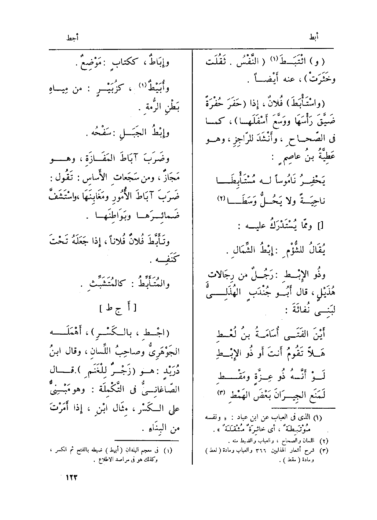 {وائْتَبَطَ النَّفْسُ. ثقُلَت وخَثَرَتْ، عَنهُ أَيْضاً.} واسْتَأْبَطَ فُلانٌ، إِذا حفرَ حُفْرَةً ضيَّقَ رَأْسَها ووسَّعَ أَسْفَلَها، كَمَا فِي الصّحاح، وأَنْشَدَ للرَّاجزِ، وَهُوَ عَطِيَّةُ بنُ عاصِمٍ: يَحْفِرُ نَاموساً لَهُ {مُسْتَأْبِطَا ناحِيَةً وَلَا يَحُلُّ وَسَطَا وممَّا يُسْتَدْرَكُ عَلَيْه: يُقَالُ للشُّؤْمِ:} إِبْطُ الشِّمَالِ. وذُو الإِبْطِ: رَجُلٌ من رِجالاتِ هُذَيْلٍ، قالَهُ أَبو جُنْدَبٍ الهُذَلِيّ لبَنِي نُفاثَةَ: أَيْنَ الفَتَى أُسامَةُ بنُ لُعْطِ هَلاّ تَقُومُ أَنْتَ أَو ذُو {الإِبْطِ لَوْ أَنَّهُ ذُو عِزَّةٍ ومَقْطِ لَمَنَعَ الجِيرانَ بَعْضَ الهَمْطِ} وإِباطٌ، ككِتابٍ: موضِعٌ. {وأُبَيْطٌ، كزُبَيْرٍ: من مِياهِ بَطْنِ الرُّمَّةِ.} وإِبْطُ الجَبَلِ: سَفْحُه. وضَرَبَ {آباطَ المَفازَةِ، وَهُوَ مجازٌ. وَمن سَجَعَاتِ الأَسَاسِ: تَقول: ضَرَبَ آباطَ الأُمورِ ومَغَابِنَها، واسْتَشَفَّ ضَمائِرَها، وبَوَاطِنَها.} وتَأَبَّطَ فُلانٌ فُلاناً، إِذا جَعَلَه تَحْتَ كَنَفِه. {والمُتَأَبِّطُ: كالمُتَشَبِّثِ.