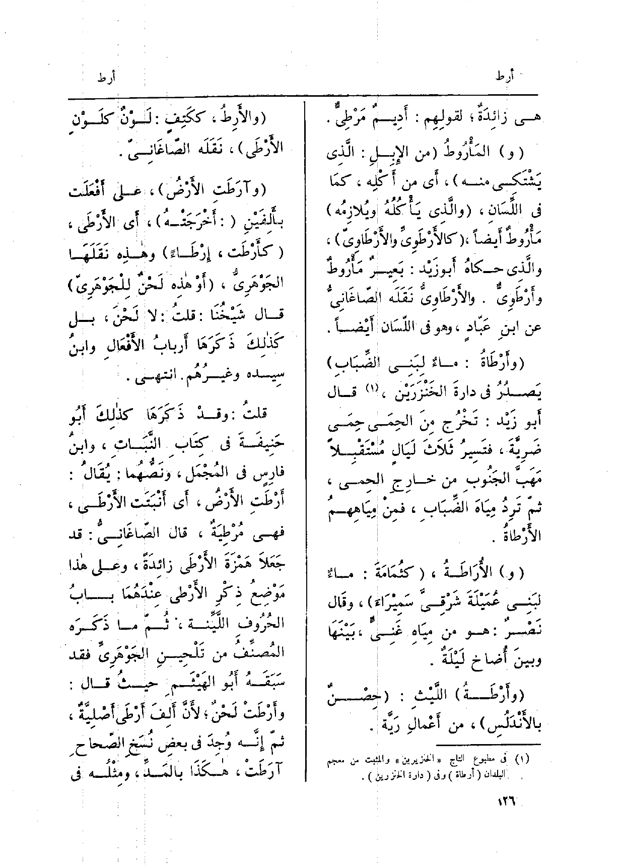 هِيَ زائِدَةٌ لقولِهِم: أَديمٌ {مَرْطِيٌّ. والمَأْروطُ من الإِبِلِ: الَّذي يشتَكِي مِنْهُ، أَي من أَكْلِه، كَمَا فِي اللّسَان، والَّذي يأْكُلُهُ ويُلازِمُهُ} مَأْروطٌ أَيْضاً، {- كالأَرْطَوِيِّ} - والأَرْطَاوِيِّ، والَّذي حكاهُ أَبو زَيْدٍ: بَعيرٌ مَأْروطٌ {- وأَرْطَوِيٌّ.} - والأَرْطَاوِيُّ نَقَلَهُ الصَّاغَانِيُّ عَن ابنِ عبَّادٍ، وَهُوَ فِي اللّسَان أَيْضاً. {وأَرْطَاةُ: ماءٌ لبَني الضَّبابِ يَصدُرُ فِي دارةَ الخَنْزَرَيْنِ، قالَ أَبو زَيْدٍ: تخرُج من الحِمَى حِمَى ضَرِيَّةَ، فتَسيرُ ثلاثَ ليالٍ مُسْتَقْبِلاً مَهَبَّ الجَنوبِ من خارِجِ الحِمَى، ثمَّ تَرِدُ مِياهَ الضَّبَابِ، فمنْ مِياهِهِمُ الأَرْطَاةُ.} والأُراطَةُ، كثُمامَةَ: ماءٌ لبَني عُمَيْلَةَ شرقِيِّ سَمِيراءَ، وَقَالَ نصْرٌ: هُوَ من مِياهِ غَنِيٍّ، بَيْنَها وبينَ أُضاخ لَيْلَةٌ. {وأَرْطَةُ اللَّيْثِ: حصنٌ بالأَنْدَلُسِ، من أَعمالِ رَيَّة.} والأَرِطُ، ككَتِفٍ: لونٌ كلَوْنِ {الأَرْطَى، نَقَلَهُ الصَّاغَانِيُّ.} وآرَطَتِ الأَرْضُ، عَلَى أَفْعَلَت بأَلِفَيْنِ: أَخْرَجَتْهُ، أَي {الأَرْطَى،} كأَرْطَتْ {إِرْطاءً وَهَذِه نَقَلَهَا الجَوْهَرِيّ، أَو هَذِه لحنٌ للجَوْهَرِيِّ قالَ شَيْخُنَا: قُلْتُ: لَا لَحْنَ، بَلْ كَذلِكَ ذَكَرَها أَربابُ الأَفْعالِ وابنُ سِيدَه وغيرُهُم. انْتَهَى. قُلْتُ: وَقَدْ ذَكَرَها كَذلِكَ أَبو حَنِيفَةَ فِي كِتابِ النَّباتِ، وابنُ فارسٍ فِي المُجْمَل،)