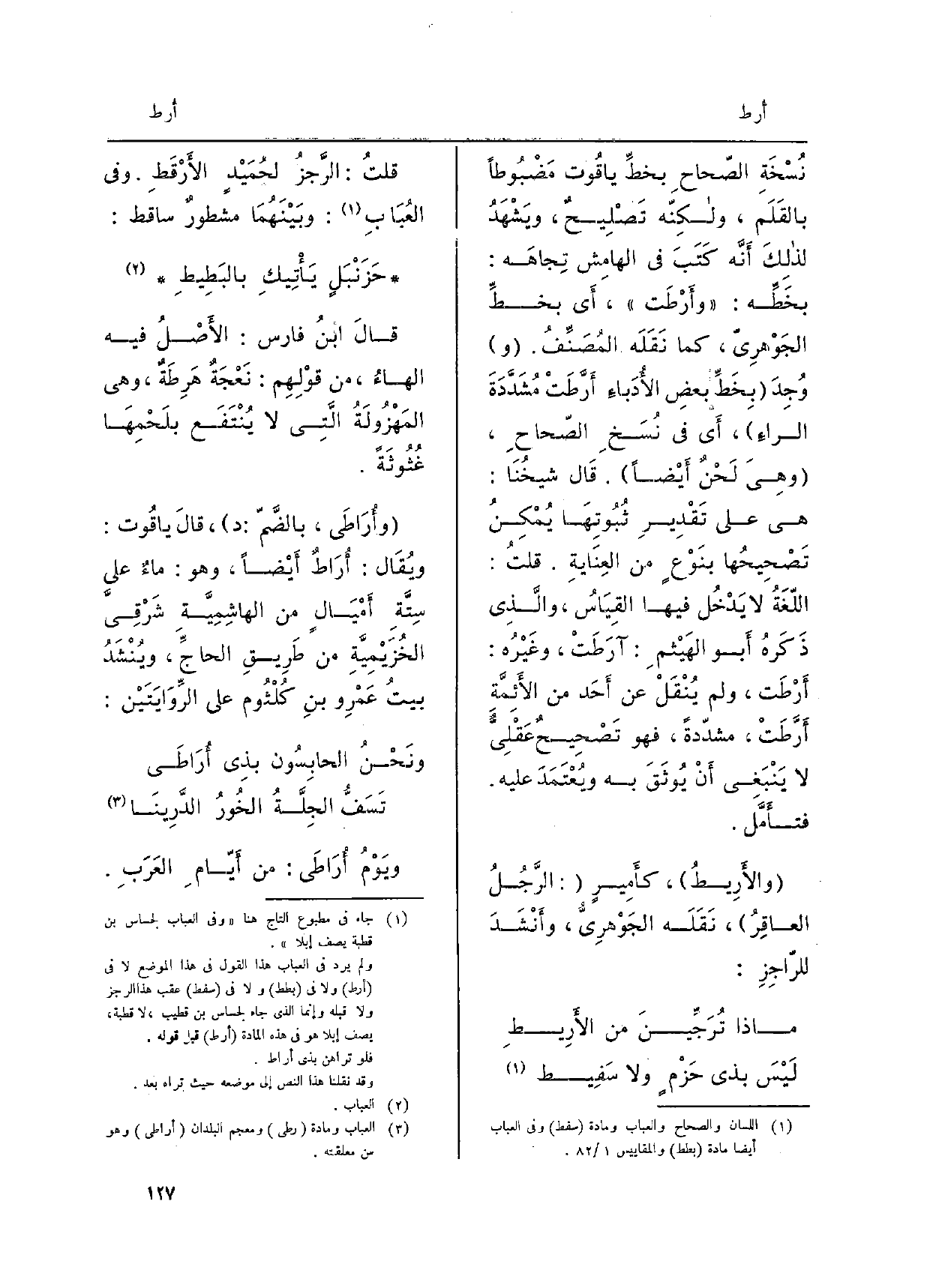 نُسخَةِ الصّحاح بخطِّ ياقوت مَضْبوطاً بالقلَم، ولكنَّه تَصْليحٌ، ويشهدُ لذَلِك أَنَّهُ كتبَ فِي الهامِشِ تِجاهَه: بخَطِّه: {وأَرْطَت، أَي بخَطِّ الجَوْهَرِيّ، كَمَا نَقَلَهُ المُصَنِّف. ووُجِدَ بخَطِّ بعضِ الأُدَباءِ} أَرَّطَتْ مُشدَّدةَ الرَّاءِ، أَي فِي نُسخِ الصّحاح، وَهِي لَحْنٌ أَيْضاً. قالَ شَيْخُنَا: هِيَ عَلَى تقديرِ ثُبوتِها يُمكِنُ تصحيحُها بنوعٍ من العِنايَةِ. قُلْتُ: اللُّغَةُ لَا يدخلُ فِيهَا القِياسُ، والَّذي ذَكَرَهُ أَبو الهَيْثَم: {آرَطَتْ، وغيرُه:} أَرْطَت، وَلم يُنْقَلْ عَن أَحدٍ من الأَئمَّةِ {أَرَّطَتْ، مشدَّدةً، فَهُوَ تَصْحيحٌ عَقْلِيٌّ لَا ينبَغِي أَنْ يُوثَقَ بِهِ ويُعتمَدَ عَلَيْهِ. فتأَمَّلْ.} والأَرِيطُ، كأَميرٍ: الرَّجُلُ العاقِرُ، نَقَلَهُ الجَوْهَرِيّ، وأَنْشَدَ للرَّاجِزِ: مَاذَا تُرَجِّينَ من {الأَرِيطِ لَيْسَ بِذِي حَزْمٍ وَلَا سَفِيطِ قُلْتُ: الرَّجزُ لحُمَيْدٍ الأَرْقَطِ. وَفِي العُبَاب: وبينَهُما مشطورٌ سَاقِط: حَزَنْبَلٍ يَأْتِيكِ بالبَطِيطِ قالَ ابنُ فارسٍ: الأَصلُ فِيهِ الهاءُ، من قولِهِم: نَعْجَةٌ هَرِطَةٌ، وَهِي المَهْزولَةُ الَّتي لَا يُنْتَفَعُ بلَحْمِها غُثُوثَةً.} وأُراطَى، بالضَّمِّ: بَلَدٌ، قالَ ياقُوت: ويُقَالُ: {أُراطٌ أَيْضاً، وَهُوَ: ماءٌ عَلَى سِتَّةِ أَمْيالٍ من الهاشِمِيَّةِ شرْقِيِّ الخُزَيْمِيَّةِ من طَريقِ الحاجِّ، ويُنْشِدُ بيتُ عَمْرو بنِ كُلْثُوم عَلَى الرِّوايَتَيْنِ: