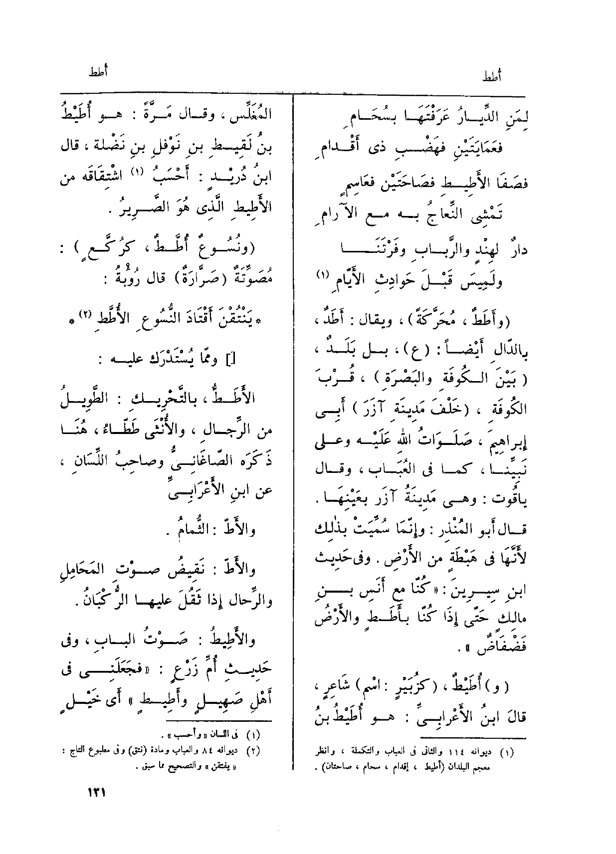 {وأَطَطٌ، مُحَرَّكَةً، ويُقَالُ: أَطَدٌ، بالدّالِ أَيْضاً: ع، بَلْ بَلَدٌ، بَيْنَ الكوفَةِ والبَصْرَة، قُرْبَ الكوفَةِ، خَلْفَ مَدينَةِ آزَرَ أبي إبراهيمَ، صَلَواتُ الله عَلَيْهِ وعَلى نَبيِّنا، كَمَا فِي العُبَاب، وَقَالَ ياقوت: وَهِي مَدينَةُ آزَر بعَيْنِها. قالَ أَبو المُنْذِر: وإنَّما سُمِّيَتْ بذلك لأنَّها فِي هَبْطَةٍ من الأرضِ. وَفِي حَدِيث ابْن سيرينَ: كُنّا مَعَ أَنَسِ بن مالكٍ حتَّى إِذا كُنّا} بأَطَطٍ والأرْضُ فَضْفاضٌ. و {أُطَيْطٌ، كزُبَيْرٍ: اسْم شاعِرٍ، قالَ ابْن الأَعْرَابِيّ: هُوَ أُطَيْطُ بنُ المُغَلِّس، وَقَالَ مَرَّةً: هُوَ أُطَيْطُ بنُ لَقيطِ بن نَوْفلِ بن نَضْلة، قالَ ابْن دُرَيْدٍ: أحْسَبُ اشْتِقاقَه من الأَطيطِ الَّذي هوَ الصَّريرُ. ونُسوعٌ أُطَّطٌ، كرُكَّعٍ: مُصَوِّتَةٌ صَرَّارَةٌ قالَ رُؤْبَةُ: يَنْتُقْنَ أَقْتادَ النُّسوعِ} الأُطَّطِ وممَّا يُسْتَدْرَكُ عَلَيْه: {الأَطَطُّ، بالتَّحْريكِ: الطَّويلُ من الرِّجالِ، والأُنْثَى} طَطّاءُ، هُنا ذَكَرَه الصَّاغَانِيُّ وصاحبُ اللِّسانِ، عَن ابْن الأَعْرَابِيّ. والأَطّ: الثُّمامُ. {والأَطّ: نَقيضُ صوتِ المَحامِلِ والرِّحال إِذا ثَقُلَ عَلَيْهَا الرُّكْبانُ. والأَطيطُ: صَوْتُ البابِ، وَفِي حَديثِ أُمِّ زَرْعٍ: فجَعَلَني فِي أَهْلِ صَهيلٍ} وأَطيطٍ أَي خَيْلٍ