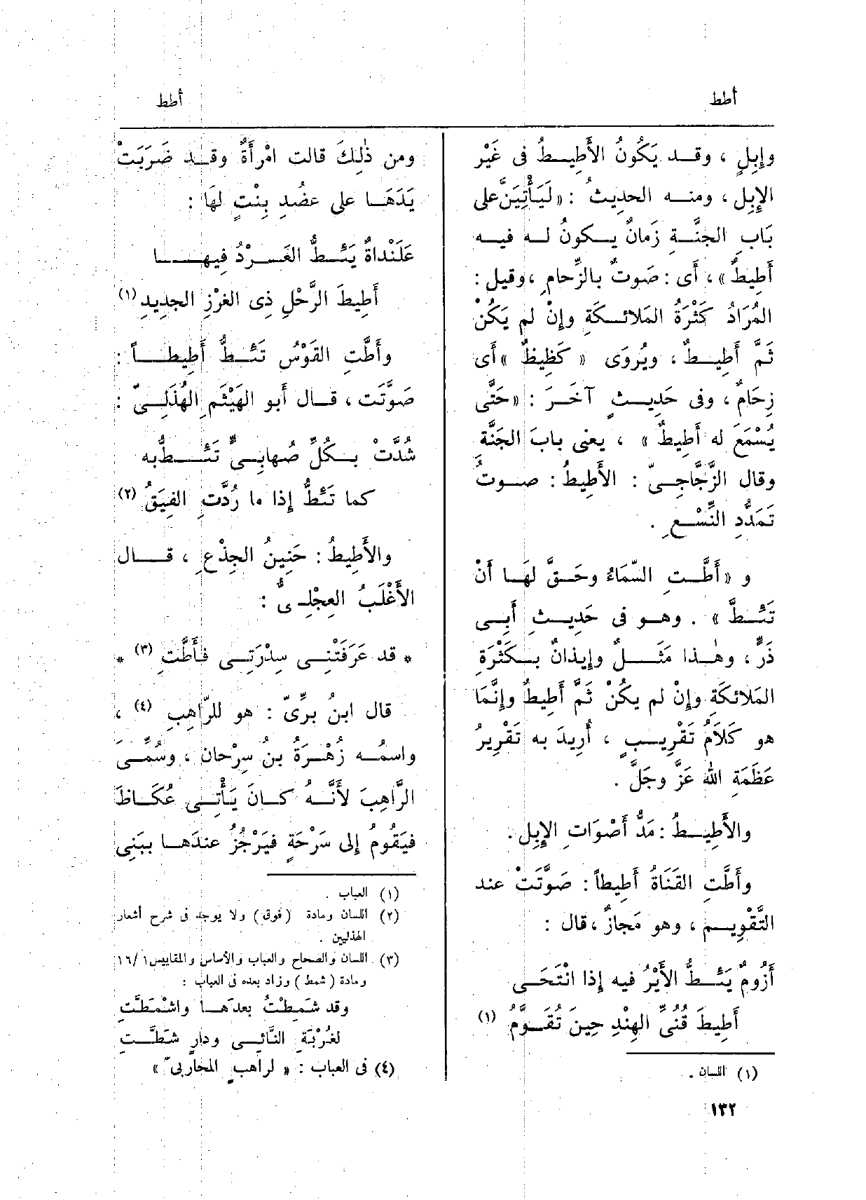 والأَطِيطُ: حَنينُ الجِذْعِ، قالَ الأَغْلَبُ العِجْليُّ: قَدْ عَرَفَتْني سِدْرَتي فأَطَّتِ قالَ ابنُ بَرِّيّ: هُوَ للرّاهِبِ، واسمُه زُهرةُ بن سِرْحان، وسُمِّيَ الرَّاهِبَ لأنَّه كانَ يَأْتِي عُكاظَ فيَقومُ إِلَى سَرْحَةٍ فيَرْجُزُ عِنْدهَا ببَني