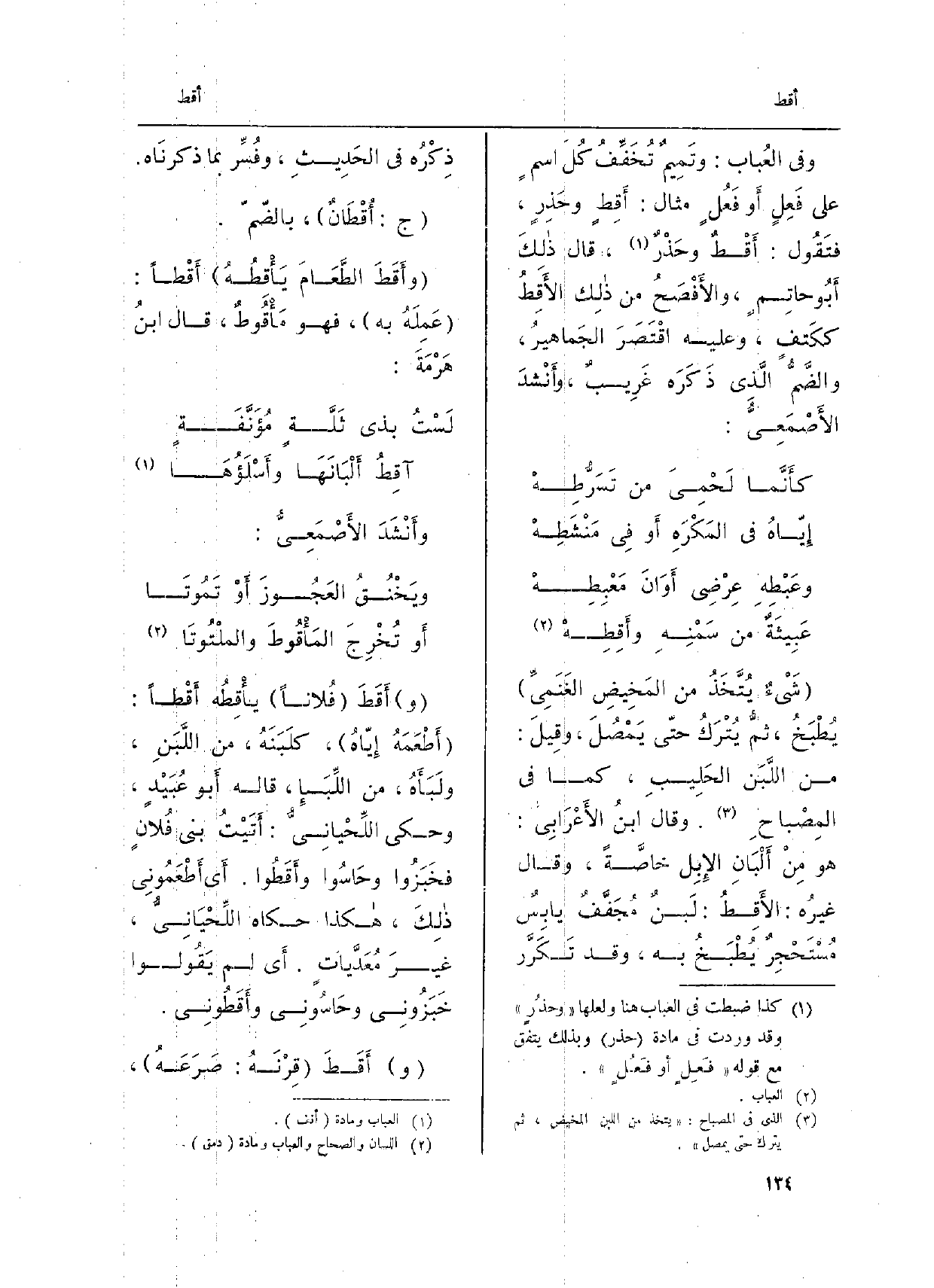 وَفِي العُبَاب: وتَميمٌ تُخَفِّفُ كُلّ اسمٍ عَلَى فَعِلٍ أَو فَعُلٍ مِثَال: {أَقِطٍ وحَذِرٍ، فَتَقول:} أَقْطٌ وحَذْرٌ، قالَ ذَلِك أَبو حاتمٍ، والأفْصَحُ من ذَلِك {الأَقِطُ ككَتفٍ، وَعَلِيهِ اقْتَصَرَ الجَماهيرُ، والضَّمُّ الَّذي ذَكَرَه غَريبٌ، وأَنْشَدَ الأَصْمَعِيّ: كأَنَّما لَحْمِيَ من تَسَرُّطِهْ إيّاهُ فِي المَكْرَهِ أَو فِي مَنْشَطِهْ وعَبْطِهِ عِرْضي أوانَ مَعْبِطِهْ عَبيثَةٌ من سَمْنِهِ} وأَقِطِهْ شيءٌ يُتَّخَذُ من المَخيضِ الغَنَميِّ يُطْبَخُ، ثمَّ يُتْرَكُ حتَّى يَمْصُلَ، وَقيل: من اللَّبَن الحَليبِ، كَمَا فِي المِصْباحِ. وَقَالَ ابْن الأَعْرَابِيّ: هُوَ من أَلبانِ الإِبِل خاصَّةً، وَقَالَ غيرُه: {الأَقِطُ: لَبنٌ مُجَفَّفٌ يابِسٌ مُسْتَحْجِرٌ يُطْبَخُ بِهِ، وَقَدْ تَكَرَّر ذِكْرُه فِي الحَدِيث، وفُسِّر بِمَا ذَكرْنَاهُ. ج:} أُقْطانٌ، بالضّمّ.