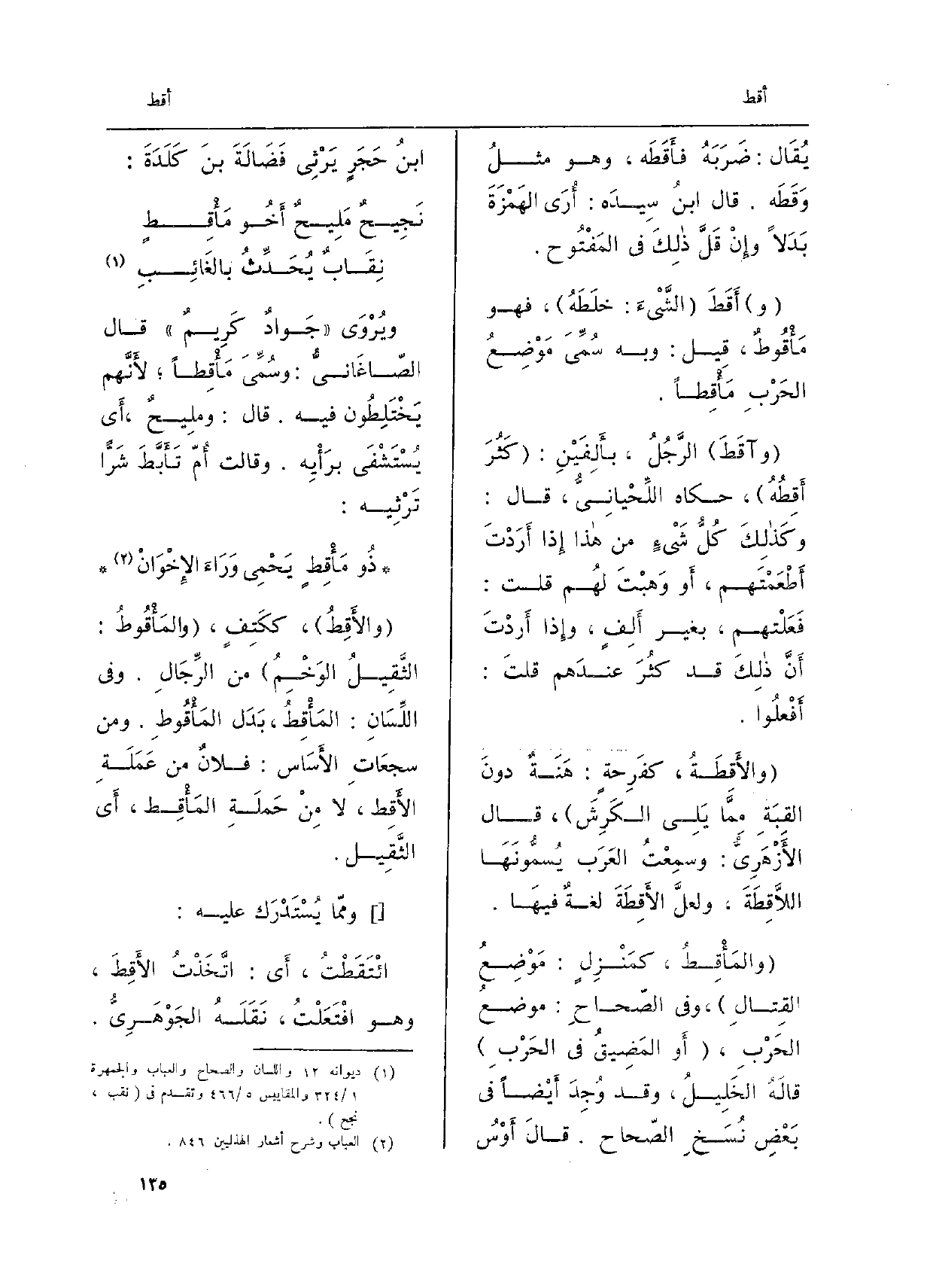 يُقال: ضَرَبَهُ فأَقَطَه، وَهُوَ مثلُ وَقَطَه. قالَ ابْن سِيدَه: أُرَى الهَمْزَةَ بَدَلاً وإنْ قَلَّ ذَلِك فِي المَفْتوح. و {أَقَطَ الشَّيءَ: خلَطَهُ، فَهُوَ مَأْقوطٌ، قيل: وَبِه سُمِّيَ مَوْضِعُ الحَرْبِ مَأْقِطاً.} وآقَطَ الرَّجُلُ، بألِفَيْنِ: كَثُرَ {أَقِطُهُ، حَكَاهُ اللِّحيانيُّ، قالَ: وكَذلِكَ كُلُّ شَيءٍ من هَذَا إِذا أرَدْتَ أَطْعَمْتَهم، أَو وَهبْتَ لهُم قُلْتُ: فَعَلْتهم، بِغَيْر ألفٍ، وَإِذا أرَدْتَ أنَّ ذَلِك قَدْ كثُرَ عندَهم قُلْتَ: أَفْعلوا.} والأَقِطَةُ، كفَرِحةٍ: هَنَةٌ دونَ القِبَةِ مِمَّا يَلي الكَرِشَ، قالَ الأّزْهَرِيّ: وسمِعْتُ العَرَب يُسمُّونَها اللاَّقِطَةَ، ولعلَّ الأَقِطَةَ لغةٌ فِيهَا.