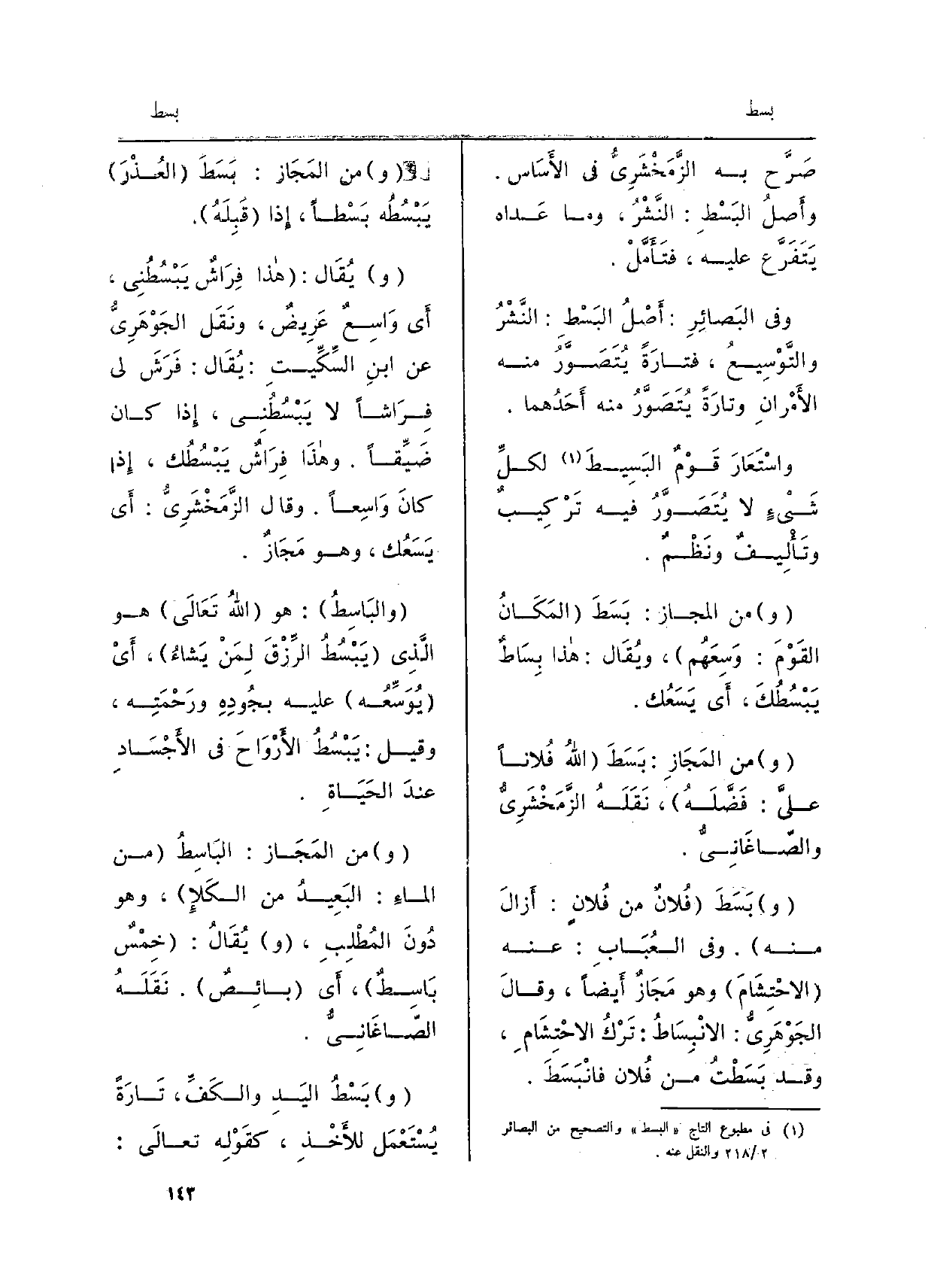 صَرَّح بِهِ الزَّمَخْشَرِيُّ فِي الأَسَاسِ. وأصلُ البَسْطِ: النَّشْرُ، وَمَا عَداه يَتَفرَّع عَلَيْهِ، فتَأَمَّلْ. وَفِي البصائرِ: أَصْلُ البَسْطِ: النَّشْرُ والتَّوْسيعُ، فتارَةً يُتَصَوَّرُ مِنْهُ الأَمْرانِ وتارَةً يُتَصَوَّرُ مِنْهُ أحَدُهما. واسْتَعارَ قَوْمٌ البَسيطَ لكلِّ شَيْءٍ لَا يُتَصَوَّرُ فِيهِ تَرْكيبٌ وتأليفٌ ونَظْمٌ. وَمن المَجَازِ: بَسَطَ المَكانُ القَوْمَ: وَسِعَهُم، ويُقَالُ: هَذَا بِساطٌ يَبْسُطُكَ، أَي) يَسَعُك. وَمن المَجَازِ: بَسَطَ الله فُلاناً عليَّ: فَضَّلَهُ، نَقَلَهُ الزَّمَخْشَرِيُّ والصَّاغَانِيُّ. وبَسَطَ فُلانٌ من فُلانٍ: أَزالَ مِنْهُ. وَفِي العُبَاب: عَنهُ الاحْتِشامَ وَهُوَ مَجازٌ أَيْضاً، وَقَالَ الجَوْهَرِيّ: الانْبِساطُ: تَرْكُ الاحْتِشامِ، وَقَدْ بَسَطْتُ من فُلان فانْبَسَطَ. وَمن المَجَازِ: بَسَطَ العُذْرَ يَبْسُطُه بَسْطاً، إِذا قَبِلَهُ.