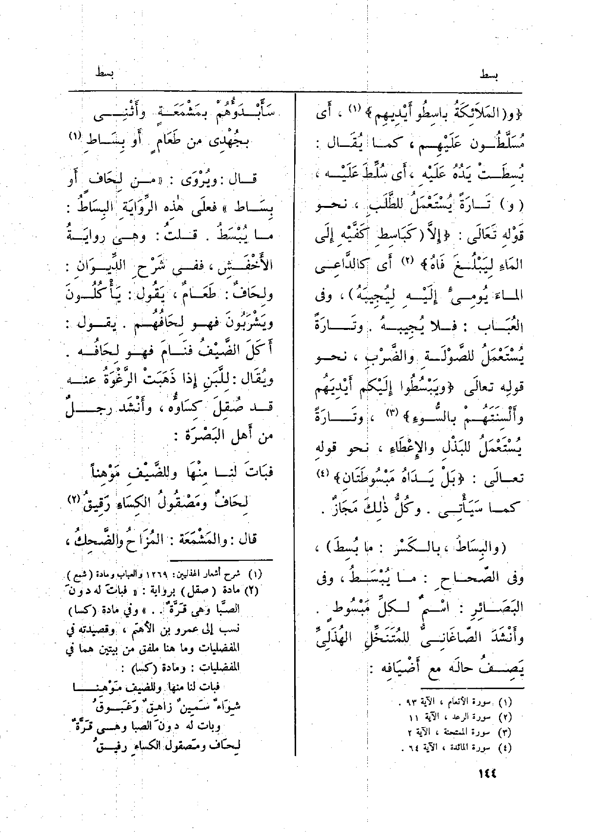 وتارَةً يُسْتَعْمَلُ للصَّوْلَةِ والضَّرْبِ، نَحْو قَوْله تَعَالَى: ويَبْسُطوا إليْكم أَيْدِيَهُم وأَلْسِنَتَهُمْ بالسُّوءِ وتارَةً يُسْتَعْمَلُ للبَذْلِ والإعْطاءِ، نَحْو قولهِ تَعَالَى: بَلْ يَداهُ مَبْسوطَتانِ كَمَا سَيَأتي. وكُلُّ ذَلِك مَجازٌ. والبِساطُ، بالكَسْرِ: مَا بُسِطَ، وَفِي الصّحاح: مَا يُبْسَطُ، وَفِي البَصائِرِ: اسمٌ لكلِّ مَبْسوطٍ.
