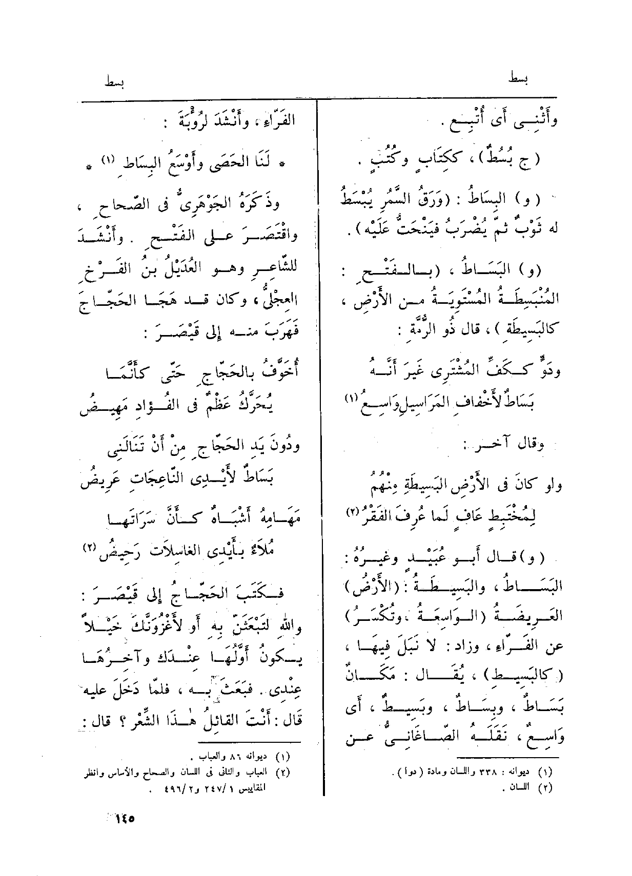 وَقَالَ أَبو عُبَيْدٍ وغيرُهُ: البَساطُ، والبَسيطَةُ: الأرْضُ العَريضَةُ الواسِعَةُ، وتُكْسَرُ عَن الفَرَّاء، وَزَاد: لَا نَبَلَ فِيهَا، كالبَسيطِ، يُقَالُ: مَكانٌ بَساطٌ، وبِساطٌ، وبَسيطٌ، أَي واسِعٌ، نَقَلَهُ الصَّاغَانِيُّ عَن الفَرَّاء، وأَنْشَدَ لرُؤْبَة: لَنا الحَصَى وأَوْسَعُ البِساطِ وذَكَرَهُ الجَوْهَرِيّ فِي الصّحاح، واقْتَصَرَ عَلَى الفَتْحِ. وأَنْشَدَ للشّاعرِ وَهُوَ العُدَيْلُ بنُ الفَرْخِ العِجْليُّ، وَكَانَ قَدْ هَجا الحَجّاج فَهَرَبَ مِنْهُ إِلَى قَيْصَرَ: