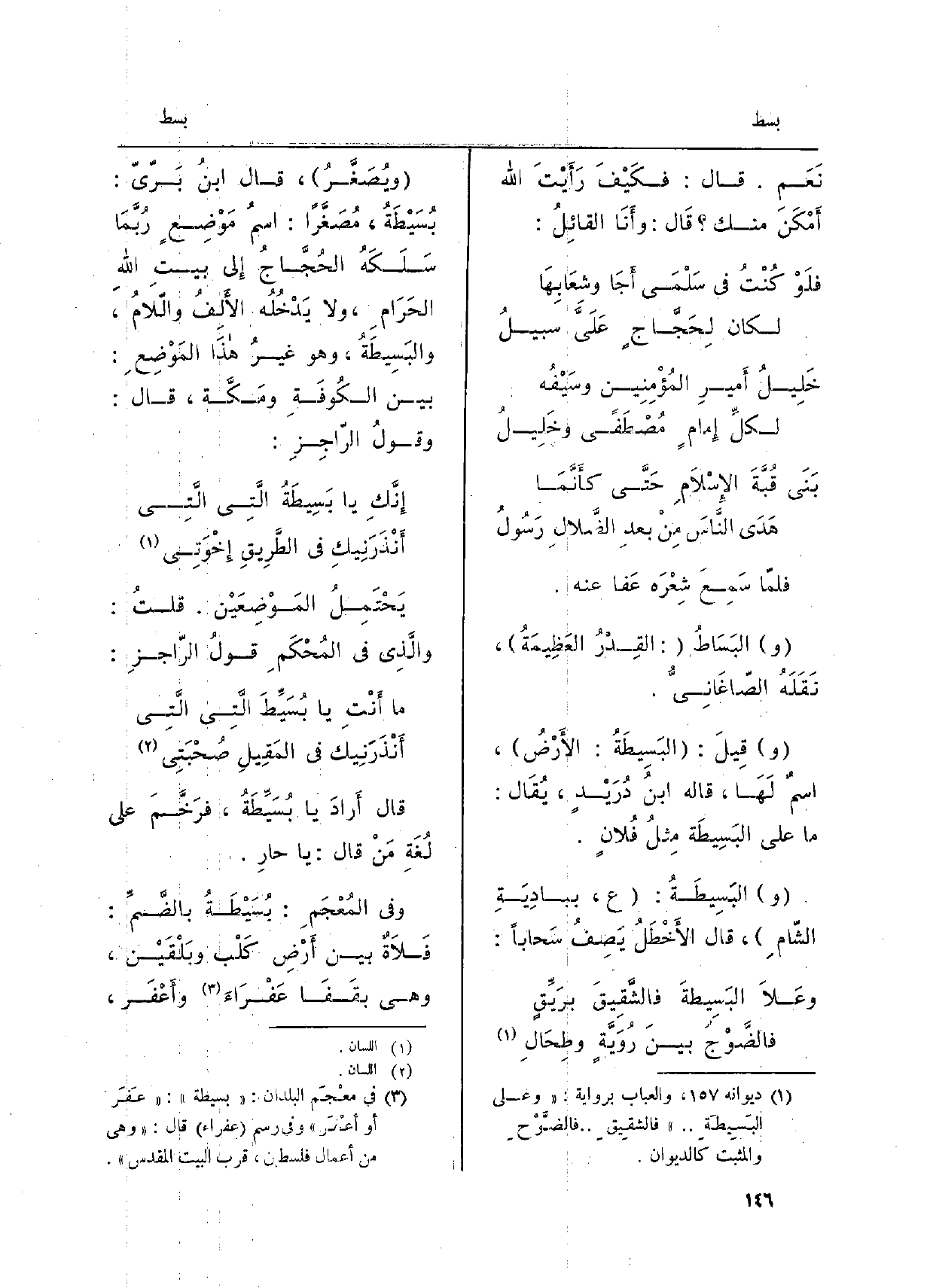 ويُصَغَّرُ، قالَ ابنُ بَرِّيّ: بُسَيْطَةُ، مُصَغَّراً: اسمُ مَوْضِعٍ رُبَّما سَلَكَهُ الحُجَّاجُ إِلَى بَيت الله الْحَرَام، وَلَا يدخُلُهُ الأَلِفُ وَاللَّام، والبِسيطَةُ، وَهُوَ غيرُ هَذَا الموضِعِ: بَيْنَ الكوفَةِ ومَكَّة، قالَ: وقولُ الرَّاجِزِ: إِنَّكِ يَا بَسيطَةُ الَّتِي الَّتِي) أَنْذَرَنِيكِ فِي الطَّريقِ إِخْوَتِي يَحْتَمِلُ الموضِعَيْنِ. قُلْتُ: وَالَّذِي فِي المُحْكَمِ قولُ الرَّاجِز: مَا أَنتِ يَا بُسَيِّطَ الَّتِي الَّتِي أَنْذَرَنِيكِ فِي المَقيلِ صُحْبَتِي قالَ أَرادَ يَا بُسَيِّطَةُ، فرَخَّمَ عَلَى لغةِ من قالَ: يَا حارِ. وَفِي المعجمِ: بُسَيْطَةُ بالضَّمِّ: فَلاةٌ بَيْنَ أَرْضِ كَلْب وبَلْقَيْن، وَهِي بقَفَا عَفْراءَ وأَعْفَرَ،
