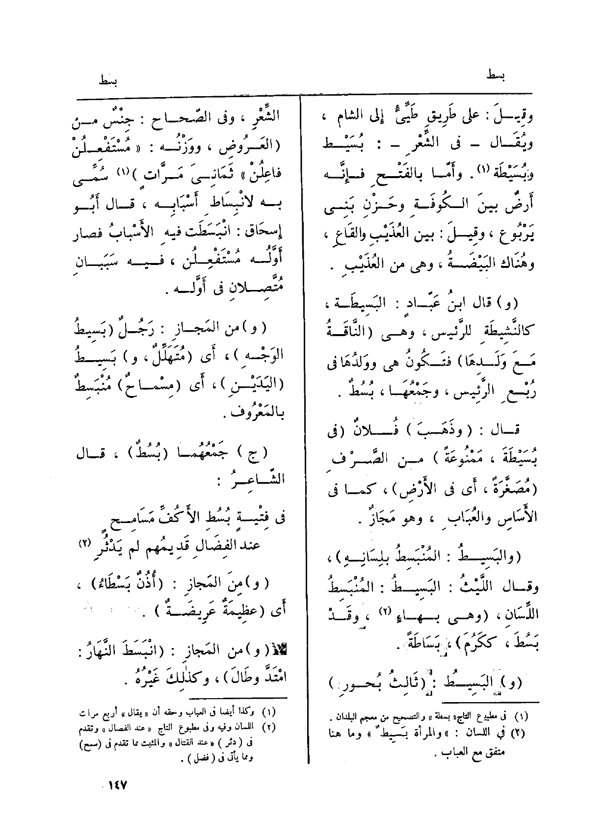 وَقيل: عَلَى طَريقِ طَيِّئٍ إِلَى الشَّام، ويُقَالُ فِي الشِّعْرِ: بُسَيْط وبُسَيْطَة. وأَمَّا بالفَتْحِ فإِنَّه أَرضٌ بَيْنَ الكوفَةِ وحَزْنِ بَنِي يَرْبوع، وَقيل: بَيْنَ العُذَيْبِ والقَاعِ، وهُناكَ البَيْضَةُ، وَهِي من العُذَيْبِ. وَقَالَ ابنُ عبَّادٍ: البَسيطَةُ، كالنَّشيطَةِ للرَّئيسِ، وَهِي النَّاقَةُ مَعَ وَلَدِها فتكونُ هِيَ وولَدُها فِي رُبْعِ الرَّئيس، وجَمْعُهَا: بُسُطٌ. قالَ: وذهبَ فُلانٌ فِي بُسَيْطَةَ، مَمْنوعَةً من الصَّرْفِ مُصَغَّرَةً، أَي فِي الأَرْضِ، كَمَا فِي الأَساسِ والعُبَاب، وهُو مَجَازٌ. والبَسيطُ: المُنْبَسِطُ بلِسانِهِ، وَقَالَ اللَّيْثُ: البَسيطُ: المُنْبَسِطُ اللّسَانِ، وَهِي بهاءٍ، وَقَدْ بَسُطَ، ككَرُمَ، بَسَاطَةً. والبَسيطُ: ثالثُ بُحورِ الشِّعْرِ، وَفِي الصّحاح: جِنْسٌ من العَرُوضِ، ووزنُه: مُسْتَفْعِلُنْ فاعِلُنْ ثَمانِيَ مَرَّاتٍ، سُمِّي بِهِ لانْبِساطِ أَسبابِه، قالَ أَبو إسْحاق: انْبَسَطَت فِيهِ الأَسْبابُ فَصَارَ أَوَّلُه مُسْتَفْعِلُنْ، فِيهِ سَبَبانِ مُتَّصِلانِ فِي أَوَّله. وَمن المَجَازِ: رَجُلٌ بَسيطُ الوجهِ، أَي مُتَهَلِّلٌ، وبَسيطُ اليَدَيْنِ، أَي مِسْماحٌ مُنْبَسِطٌ بالمَعْروفِ. جَمْعُهُمَا بُسُطٌ، قالَ الشَّاعِرُ: