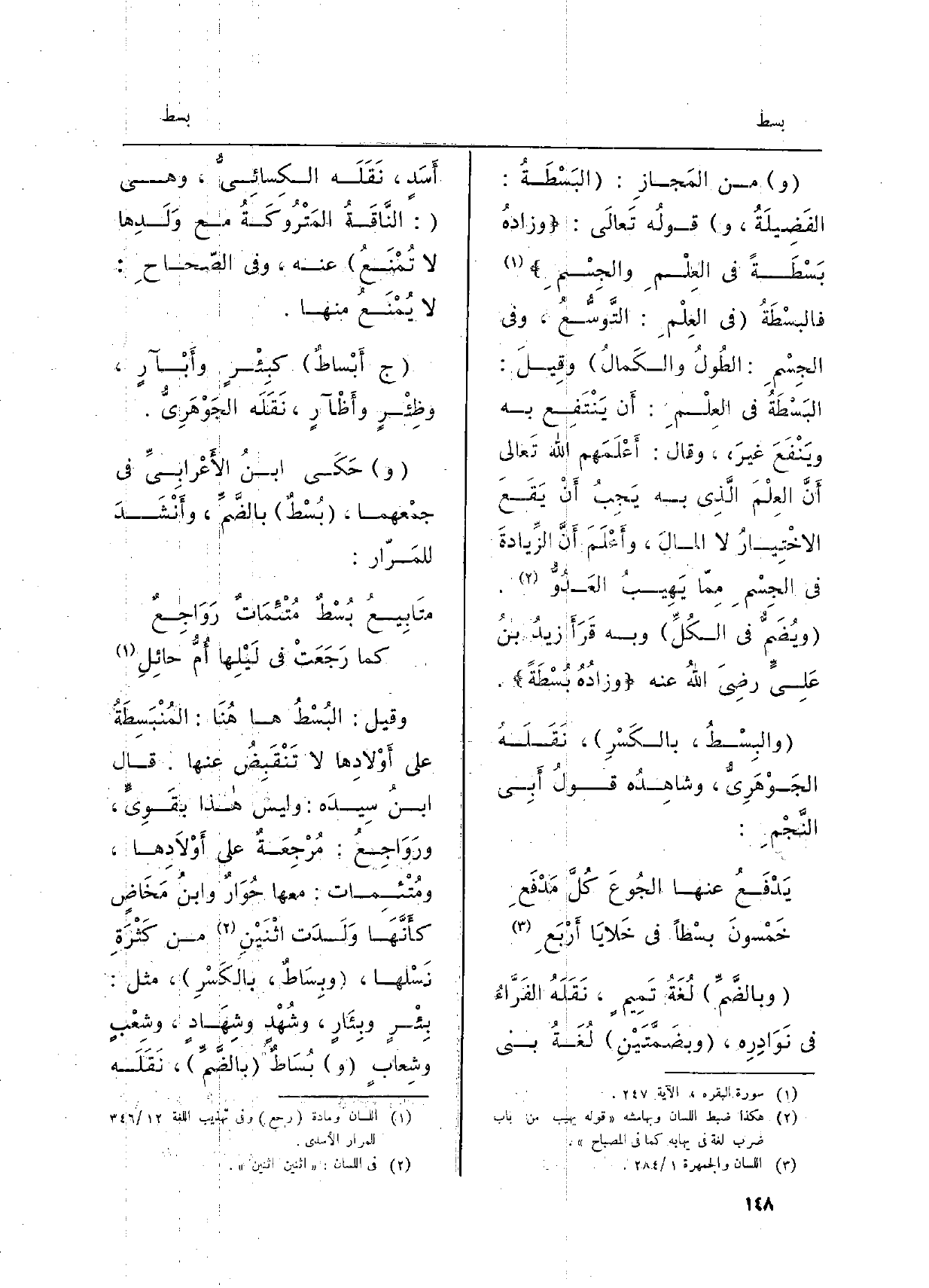 وَمن المَجَازِ: البَسْطَةُ: الفَضيلَةُ، وقَوْلُه تَعَالَى وزادهُ بَسْطَةً فِي العِلْمِ والجِسْمِ فالبَسطَةُ فِي العِلْمِ: التَّوَسُّعُ، وَفِي الْجِسْم: الطولُ والكَمالُ وقيلَ: البَسْطَةُ فِي العِلْمِ: أَن يَنْتَفِعَ بِهِ وينْفَعَ غيرَه، وَقَالَ: أَعْلَمَهم الله تَعَالَى أَنَّ العِلْمَ الَّذي بهِ يَجِبُ أَنْ يَقَعَ الاخْتِيارُ لَا المالُ، وأَعلَمَ أَنَّ الزِّيادَةَ فِي الجِسْمِ ممَّا يَهيبُ العَدُوَّ. ويُضَمُّ فِي الكلِّ وَبِه قرأَ زيدُ بنُ عليٍّ رَضِيَ الله عَنْه وزادُهُ بُسْطَةً. والبِسْطُ، بالكَسْرِ، نَقَلَهُ الجَوْهَرِيّ، وشاهِدُه قَوْلُ أَبي النَّجْمِ: يَدْفَعُ عَنْهَا الجُوعَ كُلَّ مَدْفَعِ خَمْسونَ بسْطاً فِي خَلايا أَرْبَعِ وبالضَّمِّ لغَةُ تَميمٍ، نَقَلَهُ الفَرَّاءُ فِي نَوَادِرِه، وبِضَمَّتَيْنِ لَغَةُ بني أَسَدٍ، نَقَلَهُ الكِسَائِيّ، وَهِي: النَّاقَةُ)