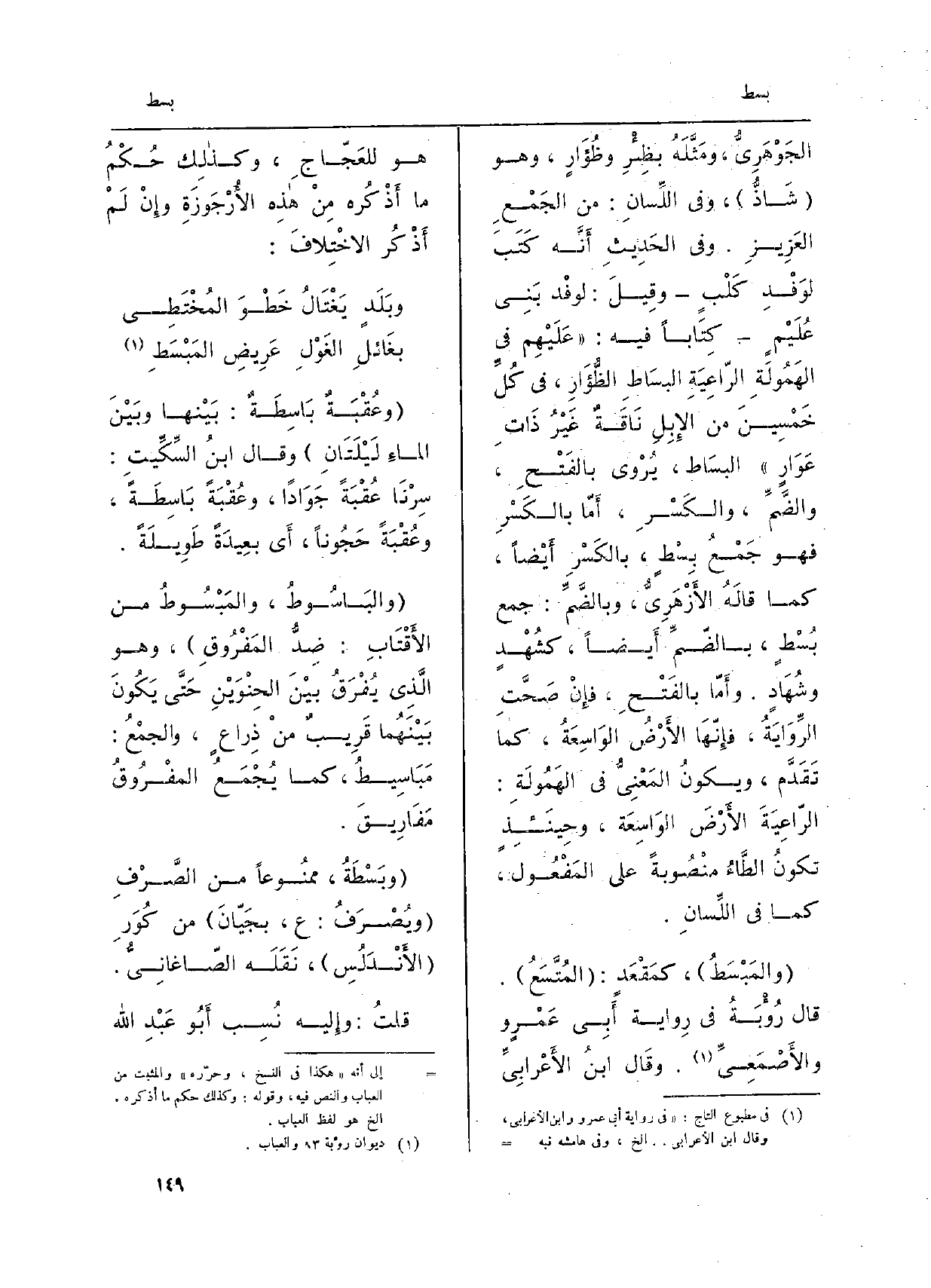 الجَوْهَرِيّ، ومثَّلَهُ بظِئْرِ وظُؤَارٍ، وَهُوَ شاذٌّ، وَفِي اللّسَان: من الجمعِ العَزيزِ. وَفِي الحَدِيث أَنَّهُ كَتَبَ لوَفْدِ كَلْبٍ وقيلَ: لوفْد بَني عُلَيْمٍ كِتاباً فِيهِ: عَلَيْهِم فِي الهَمُولَةِ الرَّاعِيَةِ البسَاطِ الظُّؤارِ، فِي كلِّ خَمْسينَ من الإِبِلِ ناقَةٌ غيرُ ذاتِ عَوارٍ البسَاط، يُروى بالفَتْحِ، والضَّمِّ، والكَسْرِ، أَمَّا بالكَسْرِ فَهُوَ جمعُ بِسْطٍ، بالكَسْرِ أَيْضاً، كَمَا قالَهُ الأّزْهَرِيّ، وبالضَّمِّ: جمع بُسْطٍ، بالضَّمِّ أَيْضاً، كشُهْدٍ وشُهادٍ. وأَمَّا بالفَتْحِ، فإِنْ صَحَّتِ الرِّوايَةُ، فإِنَّها الأَرْضُ الواسِعَةُ، كَمَا تَقَدَّم، وَيكون الْمَعْنى فِي الهَمُولَةِ: الرَّاعِيَةَ الأَرْضَ الواسِعَة، وحينئذٍ تَكُونُُ الطَّاءُ منْصوبةً عَلَى المفعولِ، كَمَا فِي اللّسَان. والمَبْسَطُ، كمَقْعَدٍ: المُتَّسِعُ. قالَ رُؤْبَةُ فِي رِوايَةِ أَبي عَمْرٍ ووالأَصْمَعِيّ. وَقَالَ ابْن الأَعْرَابِيّ هُوَ للعَجَّاج، وكَذلِكَ حُكْمُ مَا أَذْكُره من هَذِه الأُرْجوزَةِ وإِنْ لم أَذْكُر الاخْتِلافَ: وبَلَدٍ يَغْتالُ خَطْوَ المُخْتَطِي بغَائلِ الغَوْلِ عَرِيضِ المَبْسَطِ وعُقْبَةٌ باسِطَةٌ: بَيْنَها وبينَ الماءِ لَيْلَتانِ وَقَالَ ابنُ السِّكِّيتِ: سِرْنا عُقْبَةً جَواداً، وعُقْبَةً باسِطَةً، وعُقْبَةً حَجُوناً، أَي بعيدَةً طَويلَةً. والباسُوطُ، والمَبْسُوطُ من الأَقْتابِ: ضِدُّ المَفْروقِ، وَهُوَ الَّذي يُفْرَقُ بَيْنَ الحِنْوَيْنِ حتَّى يكونَ بينَهُما قَريبٌ مِنْ ذِراعٍ، والجمعُ: مَبَاسيطُ، كَمَا يُجْمَعُ المَفْروقُ مَفَاريقَ. وبَسْطَةُ، مَمْنُوعًا من الصَّرْفِ ويُصْرَفُ: ع، بجَيَّانَ من كُوَرِ الأَندلس، نَقَلَهُ الصَّاغَانِيُّ. قُلْتُ: وإليهِ نُسِبَ أَبو عَبْدِ اللهِ