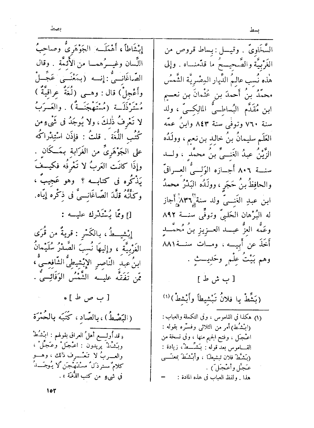 ُ السَّخاوِيّ. وَقيل: بِساط قروص من الغربيَّة والصَّحيحُ مَا قَدَّْمناه. وإِلى هَذِه نُسِبَ عالِمُ الدِّيارِ المصرِيَّة الشَّمسُ محمَّدُ بنُ أَحمدَ بنِ عُثْمانَ بن نعيم ابْن مُقَدَّم البُسطاطِيُّ المالِكِيُّ، ولد سنة وَتُوفِّي سنة وابنُ عمّه العَلَم سليمانُ بنُ خالِدِ بن نعيم، وولَدُه الزَّيْنُ عبدُ الغنيِّ بنُ محمَّدٍ، ولد سنة أَجازه الوَلِيُّ بالعِراقيّ والحافظُ بنُ حَجَرٍ، وولَدُه البَدْرُ محمَّدُ ابْن عبدِ الغنيِّ ولد سنة أَجاز لَهُ البُرْهان الحَلبيّ وتوفِّي سنة وعمُّه العِزُّ عبد العزيزِ بمُ محمَّدٍ أَخَذَ عَن أَبيه، وَمَات سنة وهم بَيْتُ عِلْمٍ وحَديثٍ.