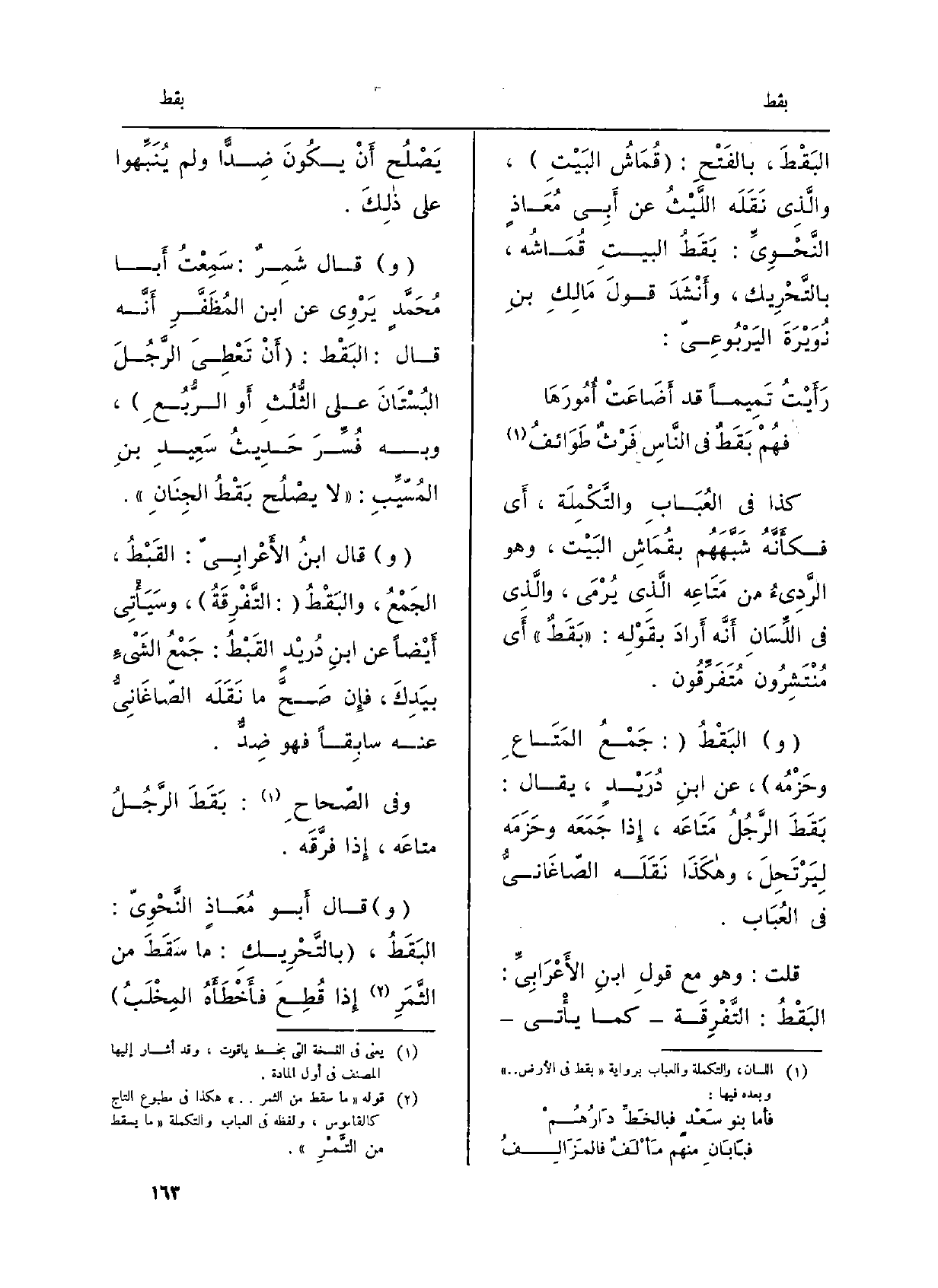 كَذَا فِي العُبَاب والتَّكْمِلَة، أَي فكأَنَّهُ شَبَّهَهُم بقُماشِ البَيْت، وَهُوَ الرَّدِيءُ من مَتاعِه الَّذي يُرْمَى، وَالَّذِي فِي اللِّسانِ أنَّه أَرادَ بقَوْلِه: بَقَطٌ أَي مُنْتَشِرون مُتَفَرِّقون. والبَقْطُ: جَمْعُ المَتاعِ وحَزْمُه، عَن بن دُرَيْدٍ، يُقَالُ: بَقَطَ الرَّجُلُ مَتاعَه، إِذا جَمَعَه وحَزَمَه لِيَرْتَحِلَ، وَهَكَذَا نَقَلَهُ الصَّاغَانِيُّ فِي العُبَاب. قُلْتُ: وَهُوَ مَعَ قَوْلِ ابْن الأَعْرَابِيّ: البَقْطُ: التَّفْرِقَة كَمَا يَأْتِي يَصْلُح أَن يَكُونَ ضِدًّا وَلم يُنَبِّهوا عَلَى ذَلِك. وَقَالَ شَمِرٌ: سَمِعْتُ أَبَا مُحَمَّدٍ يَرْوي عَن ابْن المُظَفَّرِ أنَّه قالَ: البَقْطُ: أَنْ) تَعْطِيَ الرَّجُلَ البُسْتانَ عَلَى الثُّلُثِ أَو الرُّبُعِ، وَبِه فُسِّرَ حَديثُ سَعيدِ بن المُسّيِّبِ: لَا يصْلُح بَقْطُ الجِنانِ. وَقَالَ ابْن الأَعْرَابِيّ: القَبْطُ، الجَمْعُ، والبَقْطُ: التَّفْرِقَةُ، وسَيَأْتِي أَيْضاً عَن ابْن دُرَيْدٍ القَبْطُ: جَمْعُ الشَّيْء بيَدِكَ، فإِن صَحَّ مَا نَقَلَهُ الصَّاغَانِيُّ عَنهُ سابقاُ فَهُوَ ضِدُّ. وَفِي الصّحاح: بَقَطَ الرَّجُلُ متاعَه، إِذا فرَّقَه. وَقَالَ أَبو مُعاذٍ النَّحْويّ: البَقَطُ، بالتَّحْريك: مَا سَقَطَ من الثَّمَرِ إِذا قُطِعَ فأَخْطَأَهُ المِخْلَبُ