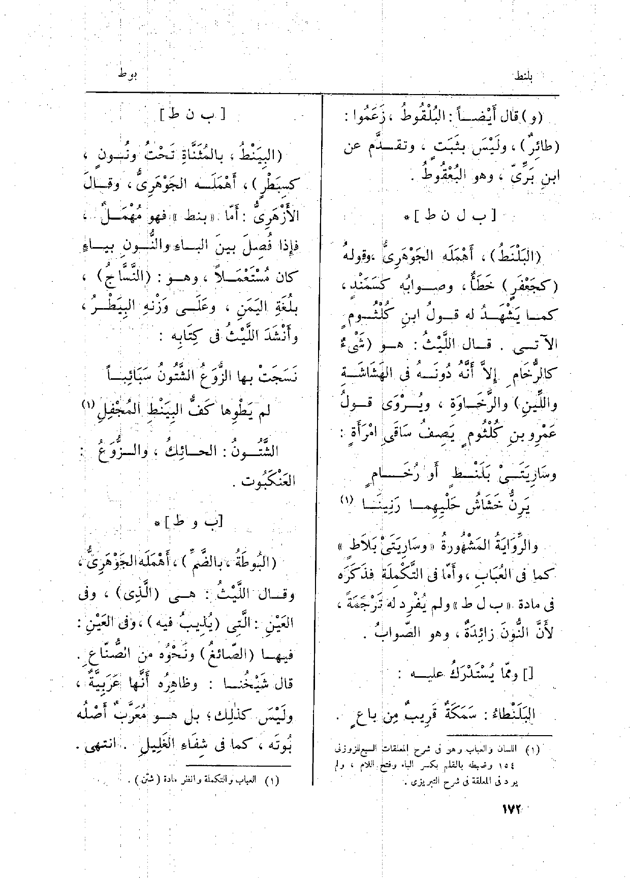 والرِّوايةُ المَشهورَةُ وسارِيَتَيْ بَلاطٍ كَمَا فِي العُبَاب، وأمّا فِي التَّكْمِلَة فذَكَرَه فِي مَادَّة ب ل ط وَلم يُفْرِد لَهُ تَرْجَمَةً، لأنَّ النُّون زائِدَةٌ، وَهُوَ الصَّوابُ. وممَّا يُسْتَدْرَكُ عَلَيْه: البَلَنْطاءُ: سَمَكَةٌ قَريبٌ من باعٍ.