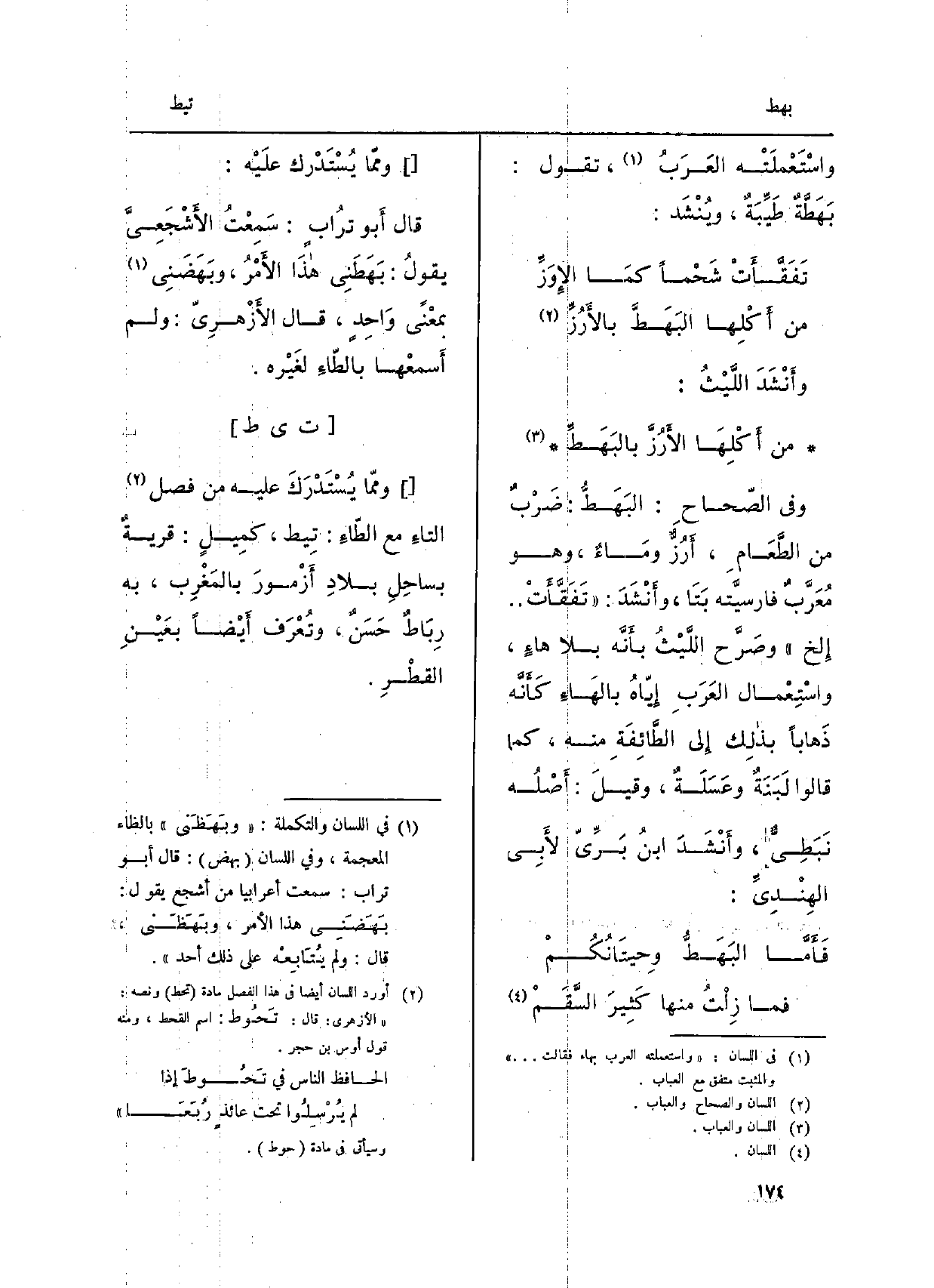 واسْتَعْمَلَتْهُ العَرَبُ، تَقول: بَهَطَّةٌ طَيِّبَةٌ، ويُنْشَد: تَفَقَّأَتْ شَحْماً كَمَا الإوَزِّ من أَكْلِها البَهَطَّ بالأَرُزِّ وأَنْشَدَ اللَّيْثُ: من أَكْلِها الأَرُزَّ بالبَهَطِّ وَفِي الصّحاح: البَهَطُّ: ضَرْبٌ من الطَّعام، أَرُزٌّ وماءٌ، وَهُوَ مُعَرَّبٌ فارسيَّته بَتا، وأَنْشَدَ: تَفَقَّأَتْ. إِلَخ وصرَّحَ اللَّيْثُ بأنَّه بِلَا هاءٍ، واسْتِعمال العَرَبِ إيّاهُ بالهاءِ كَأَنَّهُ ذَهاباً بذلك إِلَى الطَّائِفَةِ مِنْهُ، كَمَا قَالُوا لَبَنَةٌ وعَسَلَةٌ، وَقيل: أَصْلُه نَبَطِيٌّ، وأَنْشَدَ ابنُ بَرِّيّ لأبي الهِنْدِيِّ: