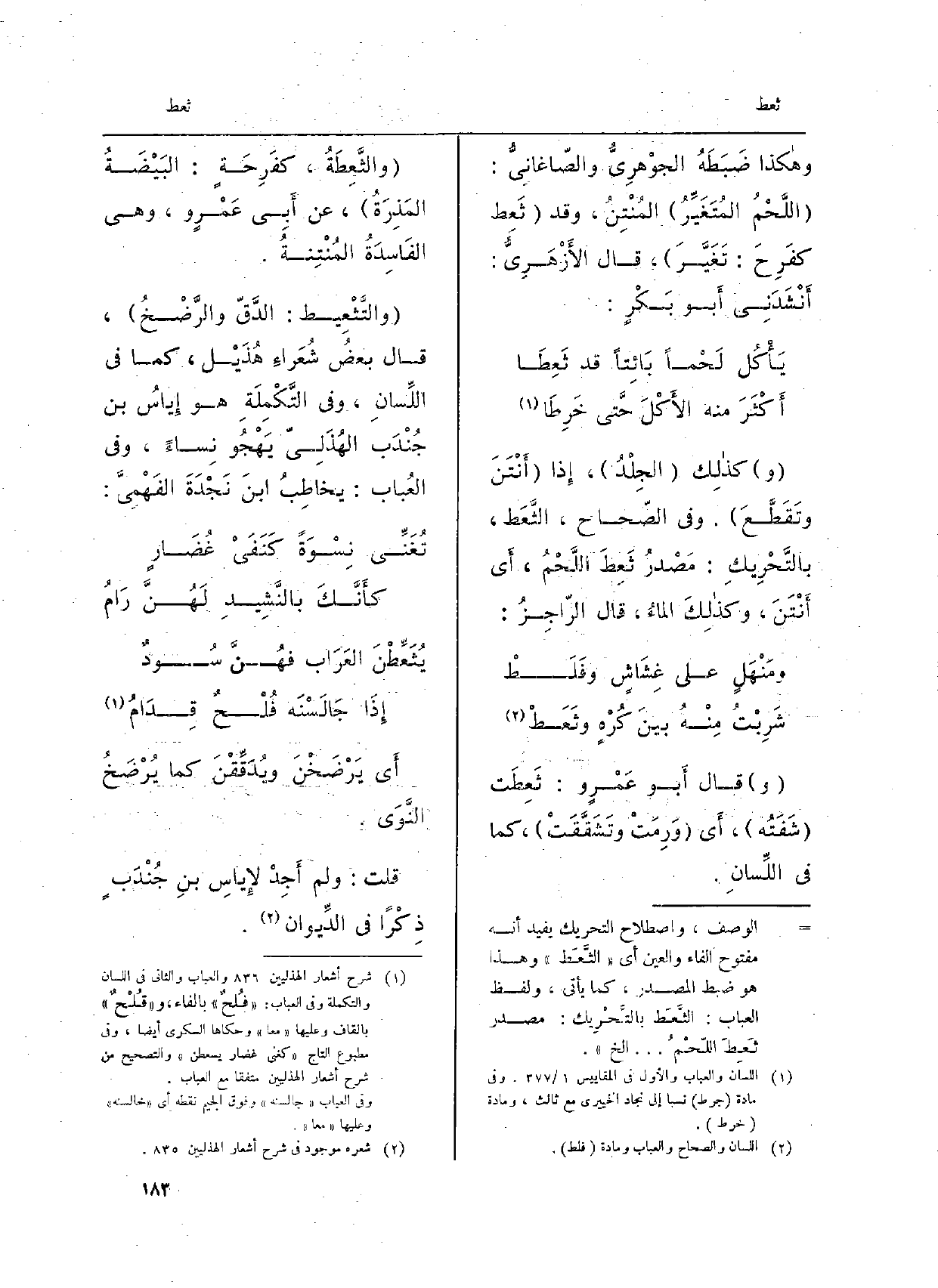 وَهَكَذَا ضَبَطَهُ الجَوْهَرِيّ والصَّاغَانِيُّ: اللَّحْمُ المُتَغَيِّرُ المُنْتِنُ، وَقَدْ ثَعِطَ كفَرِحَ: تغيَّرَ، قالَ الأّزْهَرِيّ: أَنشَدَني أَبو بكرٍ: يَأْكُلُ لَحْماً بَائِتاً قَدْ ثَعِطَا أَكْثَرَ مِنْهُ الأَكْلَ حتَّى خَرِطَا وكَذلِكَ الجِلْدُ، إِذا أَنْتَنَ وتَقَطَّعَ. وَفِي الصّحاح، الثَّعَط، بالتَّحريكِ: مصدَرُ ثَعِطَ اللَّحْمُ، أَي أَنْتَنَ، وكَذلِكَ الماءُ، قالَ الرَّاجِزُ: ومَنْهَلٍ عَلَى غِشَاشٍ وفَلَطْ شَرِبْتُ مِنْهُ بَيْنَ كُرْهٍ وتَعَطْ وَقَالَ أَبو عَمْرو: ثَعِطَت شَفَتُه، أَي وَرِمَتْ وتَشَقَّقَتْ، كَمَا فِي اللّسَان. والثَّعِطَةُ، كفَرِحَةٍ: البَيْضَةُ المَذِرَةُ، عَن أَبي عَمْرٍ و، وَهِي الفاسِدَةُ المُنْتِنَةُ. والتَّثْعيطُ: الدَّقّ والرَّضْخُ، قالَ بعضُ شُعَراءِ هُذَيْل، كَمَا فِي اللّسَان، وَفِي التَّكْمِلَة هُوَ إِياسُ بن جُنْدَبَ الهُذَلِيّ يَهْجو نِساءً، وَفِي العُبَاب: يُخاطِبُ ابنَ نجْدَةَ الفَهْمِيَّ: