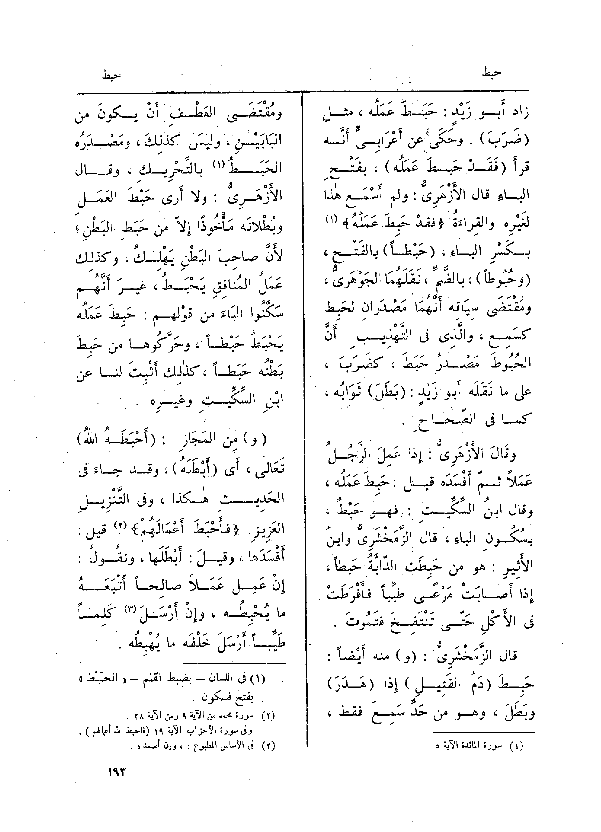 وزادَ أَبو زَيْدٍ: حَبَطَ عَمَلُه، مِثْل ضَرَبَ. وَحكى عَن أَعْرابِيٍّ أَنَّهُ قرأَ فَقَدْ حَبَطَ عَمَلُه، بفَتْحِ الباءِ، قالَ الأّزْهَرِيّ: وَلم أَسمع هَذَا لغيرِهِ والقِراءةُ فَقَدْ حَبِطَ عَمَلُهُ بكَسْرِ الباءِ، حَبْطاً بالفَتْحِ، وحُبُوطاً، بالضَّمِّ، نَقَلَهُما الجَوْهَرِيّ، ومُقْتَضى سِياقِه أَنَّهما مصدَرانِ لحَبِطَ كسَمِعَ، والَّذي فِي التَّهذيبِ: أَنَّ الحُبُوطَ مصدَرُ حَبَطَ، كضَرَبَ، عَلَى مَا نَقَلَهُ أَبو زَيْدٍ: بَطَلَ ثَوابُه، كَمَا فِي الصّحاح. وقالَ الأّزْهَرِيّ: إِذا عَمِلَ الرَّجُلُ عملا ثمَّ أَفْسَدَه قيل: حَبِطَ عَمَلُه، وقالَ ابنُ السِّكِّيتِ: فَهُوَ حَبْطٌ، بسكونِ الباءِ، قالَ الزَّمَخْشَرِيُّ وابنُ الأَثيرِ: هُوَ من حَبِطَت الدَّابَّةُ حَبطاً، إِذا أَصابَتْ مَرْعًى طيِّباً فأَفْرَطَتْ فِي الأَكْلِ حتَّى تَنْتَفِخَ فتمُوتَ. قالَ الزَّمَخْشَرِيُّ: ومِنْهُ أَيْضاً: حَبِطَ دَمُ القَتيلِ إِذا هَدَرَ وبَطَلَ، وَهُوَ من حَدِّ سَمِعَ فَقَط، ومُقْتَضى العَطْفِ أَن يَكُونَ من البابَيْنِ، وليسَ كَذلِكَ، ومصدره الحَبَطُ بالتَّحْريكِ، وَقَالَ الأّزْهَرِيّ: وَلَا أَرى حَبْطَ العَمَلِ وبُطْلانِه مأْخوذاً إلاَّ من حَبَطِ البَطْنِ لأَنَّ صاحِبَ البَطْنِ يَهْلِكُ، وكَذلِكَ عَمَلُ المُنافِقِ يَحْبَطُ، غيرَ أَنَّهُم سكَّنُوا الباءَ من قوْلهم: حَبِطَ عَمَلُه يَحْبَطُ حَبْطاً، وحرَّكُوها من حَبِطَ بَطْنُه حَبَطاً، كَذلِكَ أُثْبِتَ تلنا عَن ابنِ السِّكِّيتِ وغيرِه. وَمن المَجَازِ: أَحْبَطَهُ اللهُ تَعَالَى، أَي أَبْطَلَهُ، وَقَدْ جاءَ فِي الحديثِ هَكَذا، وَفِي التَّنْزيلِ العَزيزِ فأَحْبَطَ أَعْمالَهُمْ قِيل: أَفْسَدَها، وقيلَ: أَبْطَلَها، وتقولُ: إِنْ عَمِلَ عَمَلاً صالِحاً أَتْبَعَهُ مَا يُحْبِطُه، وإِنْ أَرْسَلَ كَلِماً طَيِّباً أَرْسَلَ مَا يُهْبِطُه.