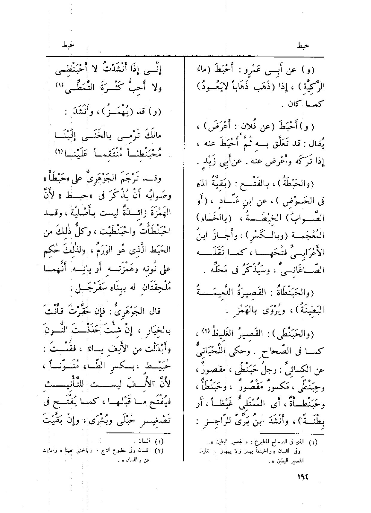 وَعَن أَبي عَمْرٍ و: أَحْبَطَ ماءُ الرَّكِيَّةِ، إِذا ذَهَبَ ذَهَاباً لَا يعودُ كَمَا كانَ. وأَحْبَطَ عَن فُلانٍ: أَعْرَضَ، يُقَالُ: قَدْ تَعَلَّقَ بهِ ثمَّ أَحْبَطَ عَنهُ، إِذا تَرَكَه وأَعرضَ عَنهُ. عَن أَبي زَيْدٍ. والحَبْطَةُ، بالفَتْحِ: بقيَّةُ الماءِ فِي الحَوْضِ، عَن ابنِ عبَّادٍ، أَو الصَّوَابُ الخِبْطَةُ، بالحاءِ المُعْجَمَة وبالكَسْرِ، وأَجازَ ابْن الأَعْرَابِيّ فتْحَها، كَمَا نَقَلَهُ الصَّاغَانِيُّ، وسيُذْكَرُ فِي مَحَلِّه. والحَبَنْطاةُ: القَصيرَةُ الدَّميمَةُ البَطِينَةُ، ويُروى بالهَمْزِ. والحَبَنْطَى: القَصيرُ الغَليظُ، كَمَا فِي الصّحاح. وَحكى اللِّحْيانِيُّ عَن الكِسَائِيّ: رَجُلٌ حَبَنْطًى، مقصورٌ، وحِبَنْطًى، مَكْسورٌ مَقْصورٌ، محَبَنْطَأٌ، وحَبَنْطَأَةٌ، أَي المُمْتَلِئُ غَيْظاً، أَو بِطْنَةً، وأَنْشَدَ ابنُ بَرِّيّ للرَّاجِزِ: إِنِّي إِذا أَنْشَدْتُ لَا أَحْبَنْطِي وَلَا أُحِبُّ كَثْرَةَ التَّمَطِّي وَقَدْ يُهْمَزُ، وأَنْشَدَ: مَا لَكَ تَرْمِي بالخَنَى إلَيْنَا) مُحْبَنْطِئاً مُنْتَقِماً عَلَيْنَا وَقَدْ تَرْجَمَ الجَوْهَرِيّ عَلَى حَبْطَأَ وصوابُه أَن يُذْكَرَ فِي حَبط لأَنَّ الهمزَةَ زائدةٌ لَيست بأَصلِيَّة، وَقَدْ احْبَنْطَأْتُ واحْبَنْطَيْت، وكلُّ ذَلِك من الحَبَط الَّذي هُوَ الوَرَمُ، ولذلِكَ حُكِمَ عَلَى نُونِه وهَمْزَته أَو يائِه أَنَّهما مُلْحِقَتانِ لَهُ ببِناءِ سَفَرْجَل. قالَ الجَوْهَرِيّ: فإِنْ حقَّرْتَ فأَنتَ بالخِيَارِ، إِنْ شِئْتَ حذَفْتَ النُّونَ وأَبْدَلْتَ من الأَلِفِ يَاء، فقُلْتَ: حبَيْطٍ، بكسرِ الطَّاءِ مُنَوَّناً، لأَنَّ الأَلِفَ لَيست للتَّأْنيثِ فيُفْتَح مَا قبلَها، كَمَا يُفتحُ فِي تَصْغيرِ حُبْلَى وبُشْرَى، وإِنْ بَقَّيْتَ