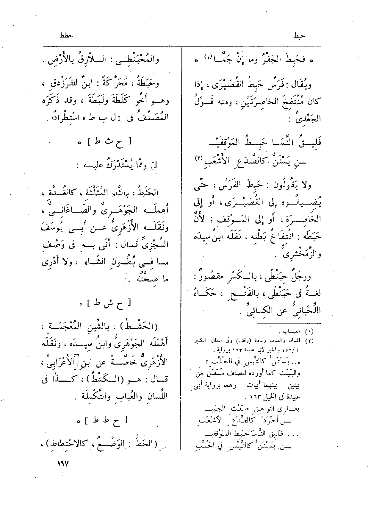 وَلَا يَقُولُونَ: حَبِطَ الفَرَسُ، حتَّى يُضِيفُوه إِلَى القُصَيْرَى، أَو إِلَى الخاصِرَةِ، أَو إِلَى المَوْقِفِ لأَنَّ حَبَطَه: انْتِفاخُ بَطْنِه، نَقَلَهُ ابنُ سِيدَه والزَّمَخْشَرِيُّ. ورَجُلٌ حِبَنْطًى، بالكَسْرِ مقصورٌ: لغةٌ فِي حَبَنْطًى، بالفَتْحِ، حَكاهُ اللِّحْيانِيّ عَن الكِسَائِيّ. والمُحْبَنْطِي: الَّلازِقُ بالأَرْضِ. وحَبَطَةُ، مُحَرَّكَةً: ابنٌ للفَرَزْدَقِ، وَهُوَ أَخو كَلَطَةَ ولَبَطَةَ، وَقَدْ ذَكَرَهُ المُصَنِّفِ فِي ل ب ط اسْتِطْراداً.