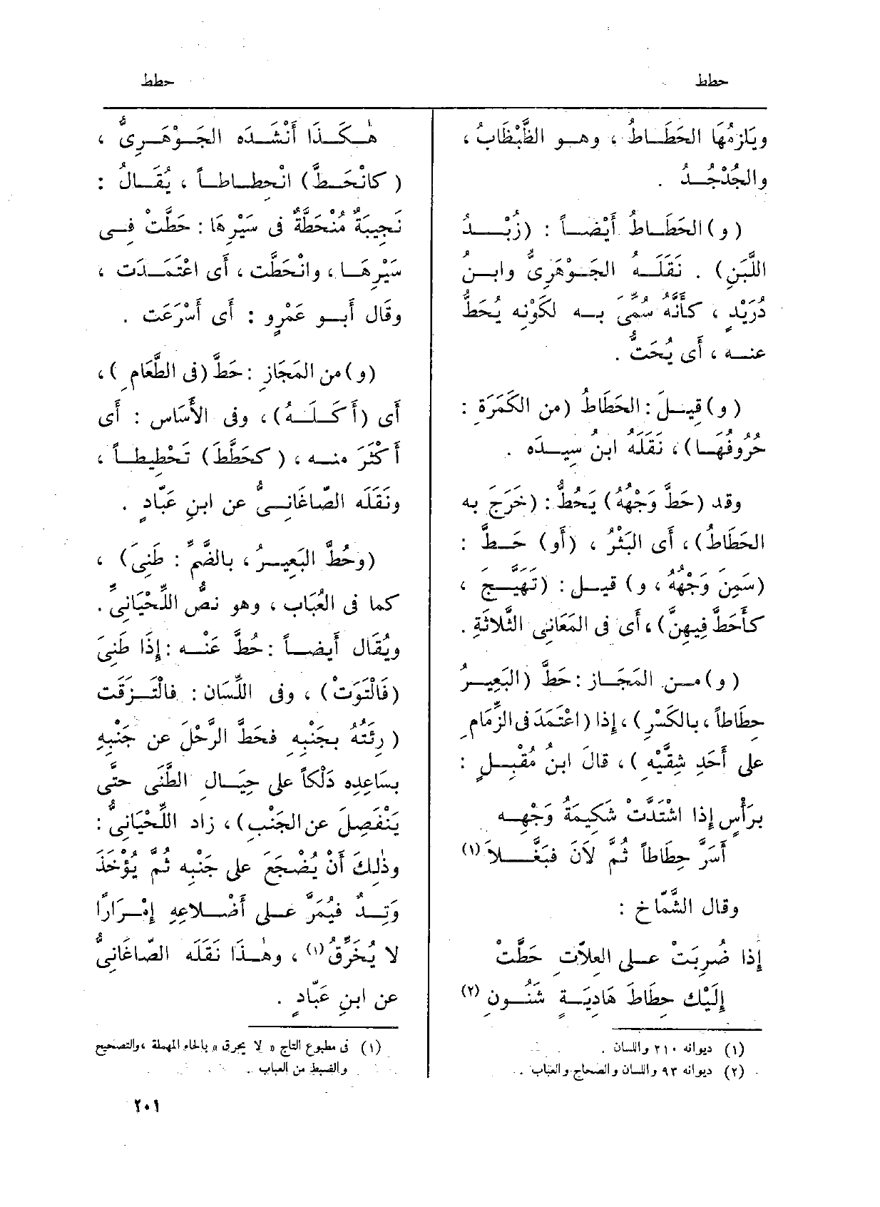 ويَلْزَمُها {الحَطاطُ، وَهُوَ الظَّبْظابُ، والجُدْجُدُ. والحَطاطُ أَيْضاً: زُبْدُ اللَّبَنِ. نَقَلَهُ الجَوْهَرِيّ وابنُ دُرَيْدٍ، كَأَنَّهُ سُمِّيَ بِهِ لكَوْنِه} يُحَطُّ عَنهُ، أَي يُحَتُّ. وَقيل: الحَطاطُ من الكَمَرَةِ: حُروفُها، نَقَلَهُ ابنُ سيدَه. وَقَدْ {حَطَّ وَجْهُهُ} يَحُطُّ: خَرَجَ بِهِ {الحَطاطُ، أَي البَثْرُ، أَو حَطَّ: سَمِنَ وَجْهُهُ، وَقيل: تَهَيَّجَ،} كأَحَطَّ فِيهِنَّ، أَي فِي المَعاني الثَّلاثةِ. وَمن المَجَازِ: حَطَّ البَعيرُ {حِطاطاً، بالكَسْرِ، إِذا اعْتَمَدَ فِي الزِّمامِ عَلَى أَحَدِ شِقَّيْهِ، قالَ ابنُ مُقْبِلٍ: