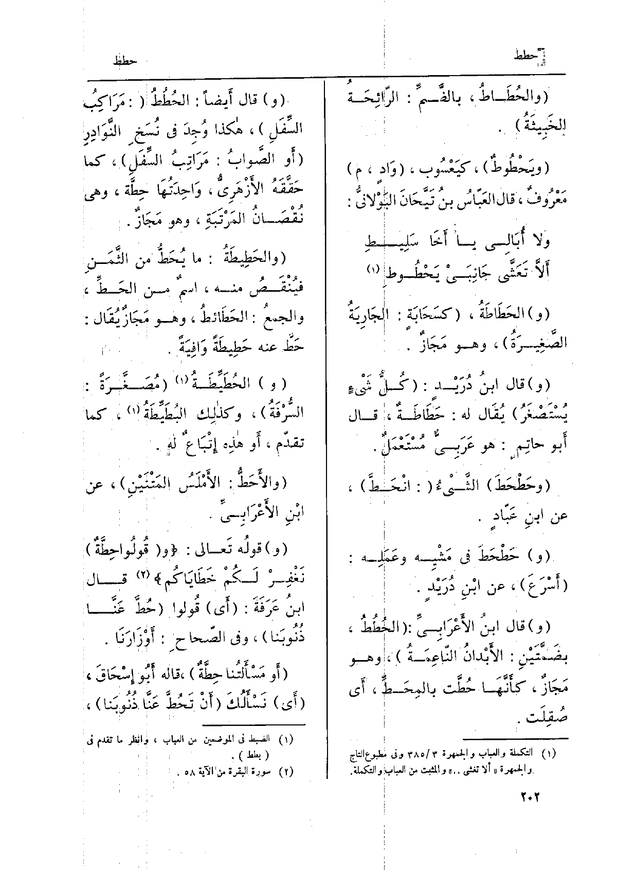 و {حَطْحَطَ فِي مَشْيِه وعَمَلِه: أَسْرَعَ، عَن ابْن دُرَيْدٍ. وَقَالَ ابْن الأَعْرَابِيّ:} الحُطُطُ، بضَمَّتيْن: الأَبْدانُ النّاعِمَة، وَهُوَ مَجازٌ، كأَنَّها {حُطَّتْ} بالمِحَطِّ، أَي صُقِلَت. وَقَالَ أَيْضاً: الحُطُطُ: مَراكِبُ السِّفَلِ، هَكَذا وُجِدَ فِي نُسَخِ النَّوادِرِ أَو الصَّوابُ: مَراتِبُ السِّفَلِ، كَمَا حَقَّقَهُ الأّزْهَرِيّ، واحِدَتُها {حِطَّة، وَهِي نُقْصانُ المَرْتَبَةِ، وَهُوَ مَجازٌ.} والحَطيطَةُ: مَا {يُحَطُّ من الثَّمَنِ فيُنْقَصُ مِنْهُ، اسمٌ من الحَطِّ، والجمعُ:} الحَطائطُ، وَهُوَ مَجازٌ يُقال: حَطَّ عَنهُ {حَطيطَةً وافِيَةً. و} الحُطَيِّطَةُ مُصَغَّرَةً: السُّرْفَةُ، وكَذلِكَ البُطَيِّطَةُ، كَمَا تقدّم، أَو هَذِه إتْباعٌ لَهُ. {والأَحَطُّ: الأَمْلَسُ المَتْنَيْنِ، عَن ابْن الأَعْرَابِيّ. وَقَوله تَعَالَى: وَقُولُوا} حِطَّةٌ نَغْفِرْ لَكُم خَطاياكُم قالَ ابنُ عَرَفَة: أَي قُولُوا {حُطَّ عَنَّا ذُنوبَنا، وَفِي الصّحاح: أَوْزارَنا. أَو مَسْأَلتُنا} حِطَّةٌ، قالَهُ أَبو إسْحاقَ، أَي نَسْأَلُكَ أنْ! تَحُطَّ عَنَّا ذُنوبَنا،
