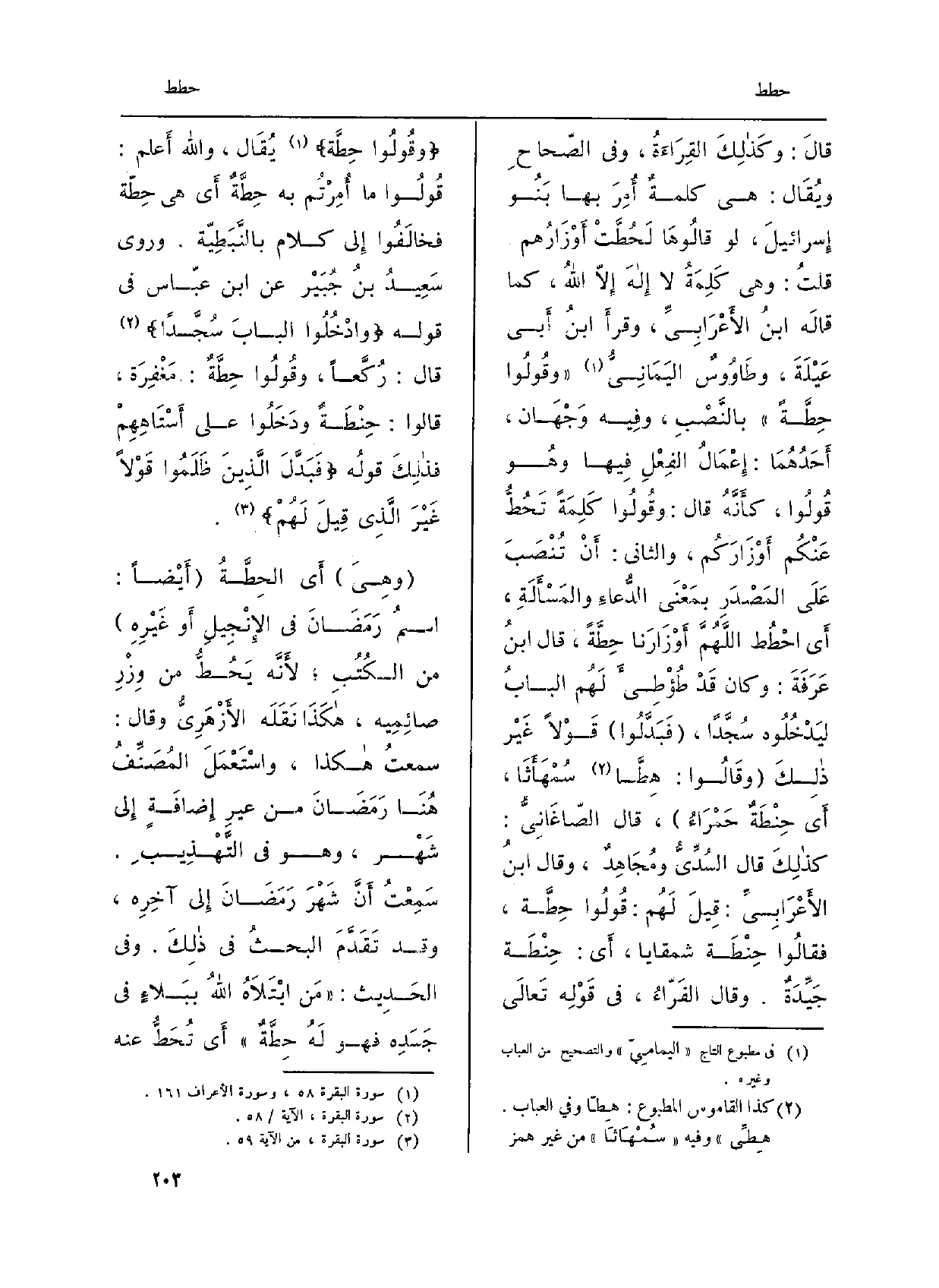 قالَ: وكَذلِكَ القِراءةُ، وَفِي الصّحاح وَيُقَال: هِيَ كلمةٌ أُمِرَ بهَا بَنو إِسْرَائِيل، لَو قالوها {لَحُطَّتْ أَوْزارُهم قُلْتُ: وَهِي كَلِمَةُ لَا إِلَه إلاَّ الله، كَمَا قالَه ابْن الأَعْرَابِيّ، وقرأَ ابنُ أَبي عَيْلَةَ، وطاووسٌ اليَمانِيُّ وَقُولُوا حِطَّةً بالنَّصْبِ، وَفِيه وَجْهان، أَحَدُهُما: إعْمالُ الفِعْلِ فِيهَا وَهُوَ قُولُوا، كَأَنَّهُ قالَ: وَقُولُوا كَلِمَةً تَحُطُّ عَنْكُم أَوْزارَكُم، وَالثَّانِي: أنْ تُنْصَبَ على المَصْدَرِ بمَعْنَى الدُّعاء والمَسْأَلَةِ، أَي احْطُط اللَّهُمَّ أَوْزارَنا حِطَّةً، قالَ ابْن عَرَفَة: وَكَانَ قَدْ طُؤْطِئَ لَهُم البابُ ليَدْخُلوه سُجَّداً، فَبَدَّلوا قَوْلاً غَيْر ذَلِك وَقَالُوا: هِطَّا سُمْهَأَثا، أَي حِنْطَةٌ حَمْراءُ، قالَ الصَّاغَانِيُّ: كَذلِكَ قالَ السُدِّيُّ ومُجاهِدٌ، وَقَالَ ابْن الأَعْرَابِيّ: قيل لَهُم: قُولُوا حِطَّة، فَقَالُوا حِنْطَة شمقايا، أَي: حِنْطَة جَيِّدَةٌ. وَقَالَ الفَرَّاءُ: فِي قَوْله تَعَالَى: وَقُولُوا} حِطَّة يُقَالُ، وَالله أعلم: قُولُوا مَا أُمِرْتُم بِهِ حِطَّةٌ أَي)
