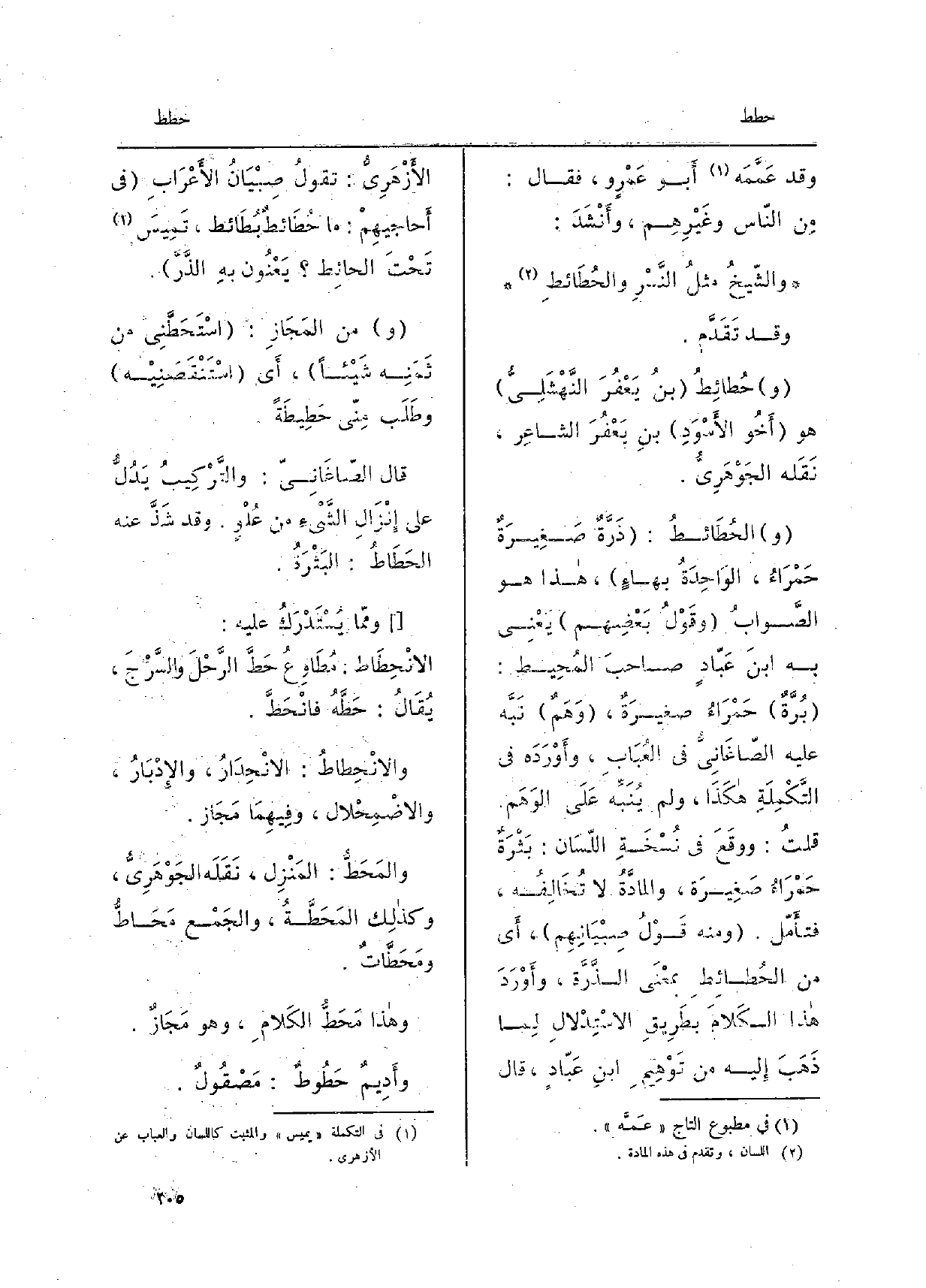 والحُطائطُ: ذَرَّةٌ صَغيرَةٌ حَمْراءُ، الواحِدَةُ بهاءٍ، هَذَا هُوَ الصَّوابُ وَقَول بَعْضِهم يَعْني بِهِ ابْن عَبّادٍ صَاحِبَ المُحيط: بُرَّةٌ حَمْراءُ صغيرةٌ، وَهَمٌ نَبَّه عَلَيْهِ الصَّاغَانِيُّ فِي العُبَاب، وأَوْرَدَه فِي التَّكْمِلَة هَكَذَا، وَلم يُنَبِّه عَلَى اللِّسان: بَثْرَةٌ حَمْراءُ صَغيرة، والمادَّةُ لَا تُخالِفُه، فتأَمّل. ومِنْهُ قَوْلُ) صِبْيانِهِم، أَي من الحُطائِطِ بمَعْنَى الذَّرَّة، وأَوْرَدَ هَذَا الكلامَ بطَريقِ الاسْتِدْلالِ لِما ذَهَبَ إِلَيْهِ من تَوْهيمِ ابْن عَبّادٍ، قالَ الأّزْهَرِيّ: تقولُ صِبْيانُ الأَعْرابِ فِي أَحاجيهِمْ: مَا حُطائطٌ بُطائط، تَميسَ تَحْتَ الحائِط يَعْنون بهِ الذَّرَّ. وَمن المَجَازِ: {- اسْتَحَطَّني من ثَمَنِه شَيْئاً، أَي اسْتَنْقَصَنيه وطَلَبَ مِنِّي} حَطيطَةً. قالَ الصَّاغَانِيُّ: والتَّرْكيبُ يَدُلُّ عَلَى إنْزالِ الشَّيْء من عُلْوٍ. وَقَدْ شَذَّ عَنهُ الحَطاطُ: البَثْرَةُ. وممَّا يُسْتَدْرَكُ عَلَيْه: {الانْحِطاط: مُطاوِعُ حَطَّ الرَّحْلَ والسَّرْجَ، يُقَالُ: حَطَّهُ فانْحَطَّ.} والانْحِطاطُ: الانْحِدارُ، والإدْبارُ، والاضْمِحْلال، وفيهِما مَجاز. {والمَحَطُّ: المَنْزِل، نَقَلَهُ الجَوْهَرِيّ، وكَذلِكَ} المَحَطَّةُ، والجَمْع {مَحاطُّ} ومَحَطَّاتٌ. وَهَذَا {مَحَطُّ الكَلامِ، وَهُوَ مَجازٌ. وأَديمٌ} حَطوطٌ: مَصْقولٌ.